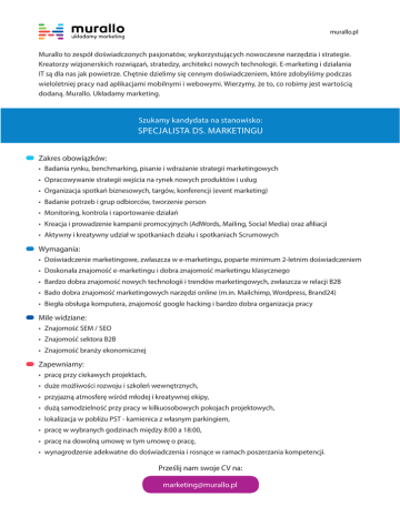murallo.pl Murallo to zespół doświadczonych pasjonatów, wykorzystujących nowoczesne narzędzia i strategie. Kreatorzy wizjonerskich rozwiązań, stratedzy, architekci nowych technologii. E-marketing i działania IT są dla nas jak powietrze. Chętnie dzielimy się cennym doświadczeniem, które zdobyliśmy podczas wieloletniej pracy nad aplikacjami mobilnymi i webowymi. Wierzymy, że to, co robimy jest wartością dodaną. Murallo. Układamy marketing. Szukamy kandydata na stanowisko: SPECJALISTA DS. MARKETINGU Zakres obowiązków: • Badania rynku, benchmarking, pisanie i wdrażanie strategii marketingowych • Opracowywanie strategii wejścia na rynek nowych produktów i usług • Organizacja spotkań biznesowych, targów, konferencji (event marketing) • Badanie potrzeb i grup odbiorców, tworzenie person • Monitoring, kontrola i raportowanie działań • Kreacja i prowadzenie kampanii promocyjnych (AdWords, Mailing, Social Media) oraz afiliacji • Aktywny i kreatywny udział w spotkaniach działu i spotkaniach Scrumowych Wymagania: • Doświadczenie marketingowe, zwłaszcza w e-marketingu, poparte minimum 2-letnim doświadczeniem • Doskonała znajomość e-marketingu i dobra znajomość marketingu klasycznego • Bardzo dobra znajomość nowych technologii i trendów marketingowych, zwłaszcza w relacji B2B • Bado dobra znajomość marketingowych narzędzi online (m.in. Mailchimp, Wordpress, Brand24) • Biegła obsługa komputera, znajomość google hacking i bardzo dobra organizacja pracy Mile widziane: • Znajomość SEM / SEO • Znajomość sektora B2B • Znajomość branży ekonomicznej Zapewniamy: • pracę przy ciekawych projektach, • duże możliwości rozwoju i szkoleń wewnętrznych, • przyjazną atmosferę wśród młodej i kreatywnej ekipy, • dużą samodzielność przy pracy w kilkuosobowych pokojach projektowych, • lokalizacja w pobliżu PST - kamienica z własnym parkingiem, • pracę w wybranych godzinach między 8:00 a 18:00, • pracę na dowolną umowę w tym umowę o pracę, • wynagrodzenie adekwatne do doświadczenia i rosnące w ramach poszerzania kompetencji. Prześlij nam swoje CV na: [email protected]