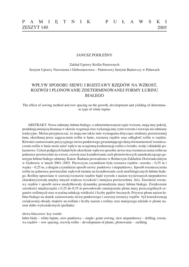 P A M I ZESZYT 140 Ę T N I K P U Ł A W S K I 2005 JANUSZ PODLEŚNY Zakład Uprawy Roślin Pastewnych Instytut Uprawy Nawożenia i Gleboznawstwa – Państwowy Instytut Badawczy w Puławach WPŁYW SPOSOBU SIEWU I ROZSTAWY RZĘDÓW NA WZROST, ROZWÓJ I PLONOWANIE ZDETERMINOWANEJ FORMY ŁUBINU BIAŁEGO The effect of sowing method and row spacing on the growth, development and yielding of determinate type of white lupine ABSTRAKT: Nowe odmiany łubinu białego, o zdeterminowanym typie wzrostu, mają inny pokrój, produkują mniejszą biomasę w okresie wegetacji oraz wykazują inny rytm wzrostu i rozwoju niż odmiany tradycyjne. Można przypuszczać, że mają one także inne wymagania dotyczące struktury przestrzennej łanu, określanej przez zagęszczenie roślin w łanie, rozstawę rzędów oraz odległość roślin w rzędzie. Również zastosowanie precyzyjnego siewu punktowego gwarantującego dużą równomierność rozmieszczenia roślin w łanie może mieć wpływ na wzajemną konkurencję roślin o światło, wodę i składniki pokarmowe. Celem podjętych badań było określenie wpływu sposobu siewu oraz rozmieszczenia roślin na jednostce powierzchni na wzrost, rozwój oraz kształtowanie cech plonotwórczych samokończącego genotypu łubinu białego odmiany Katon. Badania prowadzono w Rolniczym Zakładzie Doświadczalnym w Grabowie w latach 2001–2003. Pierwszym czynnikiem była rozstawa rzędów: szeroka – 0,35 m i wąska – 0,25 m, a drugim czynnikiem sposób siewu: punktowy i niepunktowy. Sposób rozmieszczenia roślin na jednostce powierzchni wpływał istotnie na kształtowanie cech morfologicznych łubinu białego. Rośliny uprawiane w szerszej rozstawie rzędów bądź wyrosłe z nasion wysiewanych niepunktowo charakteryzowała między innymi większa wysokość i mniejsza powierzchnia liści. Szerokość rozstawy rzędów i sposób siewu modyfikowały dynamikę gromadzenia masy łubinu białego. Zwiększenie szerokości międzyrzędzi z 0,25 do 0,35 m powodowało zmniejszenie plonu masy poszczególnych organów roślinnych oraz wyraźną redukcję wielkości i liczby pędów bocznych. Przyrost plonu nasion łubinu białego na skutek zastosowania siewu punktowego i szerszej rozstawy rzędów był konsekwencją zwiększonej obsady strąków na roślinie i liczby nasion z rośliny oraz mniejszego udziału w plonie nasion słabo wykształconych (pośladu). słowa kluczowe: key words: łubin biały – white lupine, siew punktowy – single- grain sowing, siew niepunktowy – drilling, rozstawa rzędów – row spacing, rozwój roślin – development of plants, plonowanie – yielding 200 Zakład Uprawy Roślin Pastewnych IUNG-PIB – Puławy [2] WSTĘP Odmiany łubinu białego o zdeterminowanym typie wzrostu, określane często jako samokończące, charakteryzuje krótszy okres wegetacji i związane z tym wcześniejsze i bardziej równomierne dojrzewanie oraz inna w porównaniu z odmianami tradycyjnymi dynamika gromadzenia asymilatów w plonie biologicznym i rolniczym (13). Odmiany te cechuje ponadto brak bądź silna redukcja pędów bocznych, co zmniejsza wzajemne zacienianie się roślin. Zagadnienie to w przypadku tych odmian może odgrywać ważną rolę, bowiem zdaniem Ruszkowskiego i Jaworskiej (19) o zmianie produktywności roślin uprawianych w różnym zagęszczeniu decyduje w większym stopniu światło niż powierzchnia przypadająca na jedną roślinę. Można przypuszczać, że odmiany samokończące mają również inne wymagania dotyczące agrotechniki, której ważnym elementem jest struktura przestrzenna łanu, określana przez zagęszczenie roślin w łanie, rozstawę rzędów oraz odległość roślin w rzędzie. Sposób rozmieszczenia roślin na jednostce powierzchni obok kształtowania warunków świetlnych decyduje także o zaopatrzeniu pojedynczej rośliny w wodę i składniki pokarmowe (11). Stosowanie chemicznych metod zwalczania chwastów stwarza możliwość zmniejszania szerokości międzyrzędzi z jednoczesnym zwiększeniem odległości między roślinami w rzędzie, przy stałym, optymalnym zagęszczeniu łanu. W dostępnej literaturze brakuje doniesień dotyczących wpływu struktury przestrzennej łanu na wzrost, rozwój i plonowanie zróżnicowanych morfologicznie odmian łubinu białego. Spotyka się przede wszystkim prace odnoszące się do innych gatunków roślin strączkowych (9, 10, 18, 24) lub opracowania związane z obsadą roślin i jej wpływem na produktywność i strukturę plonu (2, 21). Poszukiwanie sposobów rozmieszczenia roślin na jednostce powierzchni zapewniających uzyskanie optymalnej architektury łanu i struktury plonu prowadzi się także w odniesieniu do innych gatunków (5, 16, 20). W literaturze przedmiotu brakuje również prac dotyczących wpływu precyzyjnego siewu na rozwój i plonowanie roślin strączkowych. Tymczasem coraz częściej obserwuje się próby stosowania siewu punktowego w odniesieniu do gatunków roślin wysiewanych dotychczas niepunktowo (4). Brak odpowiednich siewników do precyzyjnego siewu roślin strączkowych uniemożliwiał prowadzenie badań dotyczących tej tematyki. Dopiero w ostatnich latach pojawiły się w naszym kraju siewniki pozwalające na precyzyjny wysiew nasion wielu gatunków roślin, w tym także grubonasiennych roślin strączkowych. Zagadnienie siewu punktowego nabiera szczególnego znaczenia w odniesieniu do łubinu białego, bowiem specyficzny kształt nasion utrudnia ich wysiew siewnikami zbożowymi. Celem podjętych badań było określenie wpływu precyzyjnego siewu oraz sposobu rozmieszczenia roślin na jednostce powierzchni na wzrost, rozwój oraz kształtowanie cech plonotwórczych samokończących genotypów łubinu białego. [3] Wpływ sposobu siewu i rozstawy rzędów... – J. Podleśny 201 MATERIAŁ I METODY Badania prowadzono w Rolniczym Zakładzie Doświadczalnym IUNG w Grabowie, w latach 2001–2003. Doświadczenie założono metodą równoważny