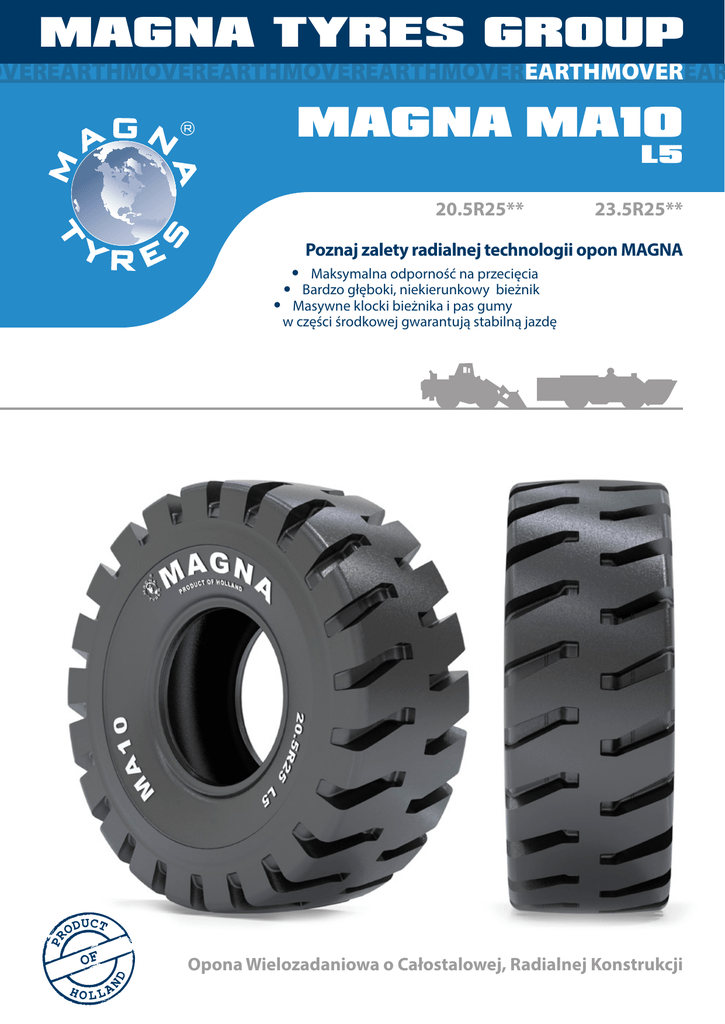 MAGNA TYRES GROUP OVEREARTHMOVEREARTHMOVEREARTHMOVEREARTHMOVEREAR MAGNA MA10 L5 20.5R25** • • 23.5R25** Poznaj zalety radialnej technologii opon MAGNA Maksymalna odporność na przecięcia Bardzo głęboki, niekierunkowy bieżnik Masywne klocki bieżnika i pas gumy w części środkowej gwarantują stabilną jazdę • Opona Wielozadaniowa o Całostalowej, Radialnej Konstrukcji MAGNA MA10 OVEREARTHMOVEREARTHMOVEREARTHMOVEREARTHMOVEREAR MAGNA TYRES – producent szerokiego asortymentu opon wielkogabarytowych wykorzystywanych w przemyśle budowalnym i górniczym. Opona do ładowarek kołowych, klasy L5R z głębokim bieżnikiem przeznaczona do prac w ekstremalnych warunkach. Doskonała trakcja i stabilność jazdy dzięki zastosowaniu masywnego, głębokiego bieżnika w parze ze stabilizującym pasem gumy w części środkowej Doskonale sprawdza się przy pracy w kopalniach odkrywkowych i podziemnych jak i wszędzie tam, gdzie wymagana jest maksymalna odporność na uszkodzenia. Jest niezastąpiona w centrach utylizacji odpadów, złomowiskach i hutach. Całostalowa, radialna konstrukcja. Udoskonalone warstwy chroniące czoło opony poprawiają wydajność maszyny oraz komfort pracy operatora. Rzeźna bieżnika zapewnia ponadto dobrą trakcję, stabilność i komfort jazdy. Ściana boczna tej opony charakteryzuje się wyjątkową odpornością na przecięcia. Rozmiar Wzór bieżnika Kod TRA Nowa, udoskonalona technologia karkasu umożliwia lepszą dystrybucję ciepła z opon przeciwdziałając przegrzaniom. Nośność Max. prędkość Średnica Zewnętrzna Szerokość Głębokość Bieżnika (km/h) (mm) (mm) (mm) Felga Nośność/ Ciśnienie Waga opony (kg) 20.5R25 MA10 L5 ** 10 km/h 1530 536 72 17.50/2.0 11500 kg/6.5 bar 360 23.5R25 MA10 L5 ** 10 km/h 1662 612 78 19.50/2.5 14500 kg/6.5 bar 470 Magna Tyres Poland Sp. z o.o. ul. Bociana 6 31-231 Kraków/ Polska Tel./Fax+48 12 626 08 55 Tel. +48 793 101 140 +48 793 101 141 [email protected] www.magnatyres.com