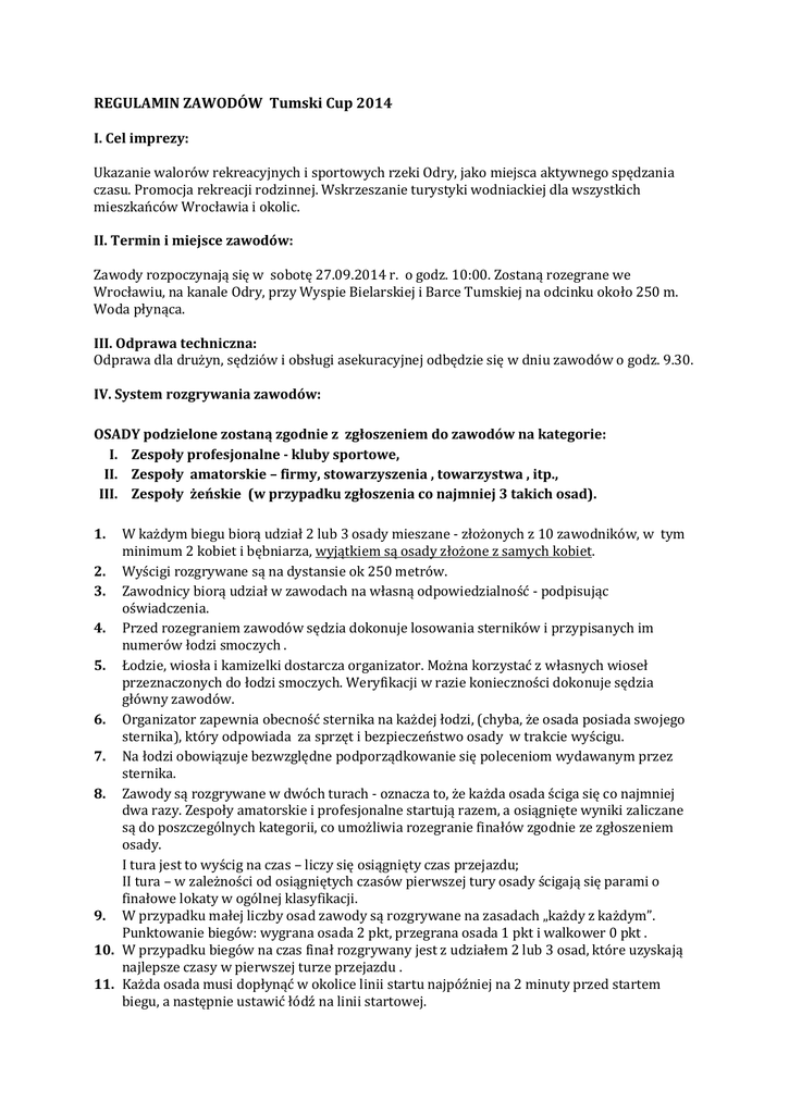 REGULAMIN ZAWODÓW Tumski Cup 2014 I. Cel imprezy: Ukazanie walorów rekreacyjnych i sportowych rzeki Odry, jako miejsca aktywnego spędzania czasu. Promocja rekreacji rodzinnej. Wskrzeszanie turystyki wodniackiej dla wszystkich mieszkańców Wrocławia i okolic. II. Termin i miejsce zawodów: Zawody rozpoczynają się w sobotę 27.09.2014 r. o godz. 10:00. Zostaną rozegrane we Wrocławiu, na kanale Odry, przy Wyspie Bielarskiej i Barce Tumskiej na odcinku około 250 m. Woda płynąca. III. Odprawa techniczna: Odprawa dla drużyn, sędziów i obsługi asekuracyjnej odbędzie się w dniu zawodów o godz. 9.30. IV. System rozgrywania zawodów: OSADY podzielone zostaną zgodnie z zgłoszeniem do zawodów na kategorie: I. Zespoły profesjonalne - kluby sportowe, II. Zespoły amatorskie – firmy, stowarzyszenia , towarzystwa , itp., III. Zespoły żeńskie (w przypadku zgłoszenia co najmniej 3 takich osad). 1. W każdym biegu biorą udział 2 lub 3 osady mieszane - złożonych z 10 zawodników, w tym minimum 2 kobiet i bębniarza, wyjątkiem są osady złożone z samych kobiet. 2. Wyścigi rozgrywane są na dystansie ok 250 metrów. 3. Zawodnicy biorą udział w zawodach na własną odpowiedzialność - podpisując oświadczenia. 4. Przed rozegraniem zawodów sędzia dokonuje losowania sterników i przypisanych im numerów łodzi smoczych . 5. Łodzie, wiosła i kamizelki dostarcza organizator. Można korzystać z własnych wioseł przeznaczonych do łodzi smoczych. Weryfikacji w razie konieczności dokonuje sędzia główny zawodów. 6. Organizator zapewnia obecność sternika na każdej łodzi, (chyba, że osada posiada swojego sternika), który odpowiada za sprzęt i bezpieczeństwo osady w trakcie wyścigu. 7. Na łodzi obowiązuje bezwzględne podporządkowanie się poleceniom wydawanym przez sternika. 8. Zawody są rozgrywane w dwóch turach - oznacza to, że każda osada ściga się co najmniej dwa razy. Zespoły amatorskie i profesjonalne startują razem, a osiągnięte wyniki zaliczane są do poszczególnych kategorii, co umożliwia rozegranie finałów zgodnie ze zgłoszeniem osady. I tura jest to wyścig na czas – liczy się osiągnięty czas przejazdu; II tura – w zależności od osiągniętych czasów pierwszej tury osady ścigają się parami o finałowe lokaty w ogólnej klasyfikacji. 9. W przypadku małej liczby osad zawody są rozgrywane na zasadach „każdy z każdym”. Punktowanie biegów: wygrana osada 2 pkt, przegrana osada 1 pkt i walkower 0 pkt . 10. W przypadku biegów na czas finał rozgrywany jest z udziałem 2 lub 3 osad, które uzyskają najlepsze czasy w pierwszej turze przejazdu . 11. Każda osada musi dopłynąć w okolice linii startu najpóźniej na 2 minuty przed startem biegu, a następnie ustawić łódź na linii startowej. 12. Osady muszą stosować się do komend wydawanych przez sędziego startowego. 13. Start biegu sygnalizowany jest przez sędziego startera sygnałem dźwiękowym lub flagą. Komenda startowa to: Ready, Set, Go, z jednoczesnym wystrzałem z pistoletu startowego lub opuszczeniem flagi startowej w dół. 14. Ruch wiosłem przed komendą startową powoduje falstart. Podwójny falstart powoduje eliminację osady z dalszego udziału w biegu. 15. Przekroczenie linii mety przez numer startowy znajdujący się na lodzi oznacza koniec wyścigu dla tej osady. 16. Warunkiem zaliczenia wyścigu jest przepłynięcie dystansu przez wszystkich zawodników. 17. W przypadku startów „każdy z każdym” suma punktów zdobytych w poszczególnych biegach pozwoli ustalić pary finałowe i ostateczny wynik zawodów. V. Postanowienia końcowe: 1. Ogłoszenie wyników nastąpi po zakończeniu zawodów. 2. Organizator zawodów podejmuje ostateczne decyzje w sprawach: interpretacji regulaminu, protestów i innych spraw nieobjętych niniejszym regulaminem. 3. Decyzje Organizatora są ostateczne i niepodważalne. 4. Pozostałe sprawy nieujęte w regulaminie ustala Organizator. VI. Komisja Sędziów: Komisję Sędziów, złożoną z licencjonowanych sędziów kajakarstwa - powołuje Organizator.