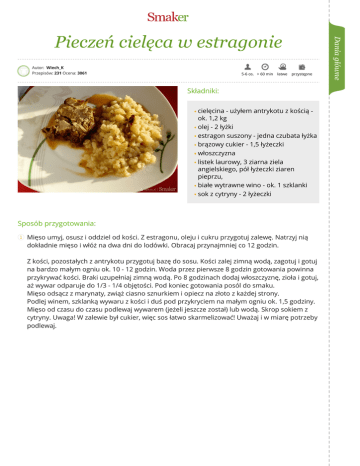 Pieczeń cielęca w estragonie Autor: Wiech_K Przepisów: 231 Ocena: 3061 5-6 os. > 60 min łatwe przystępne Składniki: cielęcina - użyłem antrykotu z kością ok. 1,2 kg olej - 2 łyżki estragon suszony - jedna czubata łyżka brązowy cukier - 1,5 łyżeczki włoszczyzna listek laurowy, 3 ziarna ziela angielskiego, pół łyżeczki ziaren pieprzu, białe wytrawne wino - ok. 1 szklanki sok z cytryny - 2 łyżeczki Sposób przygotowania: 1 Mięso umyj, osusz i oddziel od kości. Z estragonu, oleju i cukru przygotuj zalewę. Natrzyj nią dokładnie mięso i włóż na dwa dni do lodówki. Obracaj przynajmniej co 12 godzin. Z kości, pozostałych z antrykotu przygotuj bazę do sosu. Kości zalej zimną wodą, zagotuj i gotuj na bardzo małym ogniu ok. 10 - 12 godzin. Woda przez pierwsze 8 godzin gotowania powinna przykrywać kości. Braki uzupełniaj zimną wodą. Po 8 godzinach dodaj włoszczyznę, zioła i gotuj, aż wywar odparuje do 1/3 - 1/4 objętości. Pod koniec gotowania posól do smaku. Mięso odsącz z marynaty, zwiąż ciasno sznurkiem i opiecz na złoto z każdej strony. Podlej winem, szklanką wywaru z kości i duś pod przykryciem na małym ogniu ok. 1,5 godziny. Mięso od czasu do czasu podlewaj wywarem (jeżeli jeszcze został) lub wodą. Skrop sokiem z cytryny. Uwaga! W zalewie był cukier, więc sos łatwo skarmelizować! Uważaj i w miarę potrzeby podlewaj. 2 Kiedy mięso będzie miękkie wyjmij je na półmisek, odwiń nici i pozwól mu odpocząć minimum 20 minut. Przestudzone mięso pokrój na porcje. Sos zredukuj, aż zgęstnieje. Do zagęszczonego sosu włóż pokrojone mięso i podgrzej. Podawaj z zacierkami (lub kładzionymi kluskami) i mizerią. Twoje notatki do przepisu: