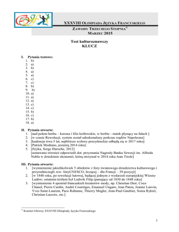 XXXVIII OLIMPIADA JĘZYKA FRANCUSKIEGO ZAWODY TRZECIEGO STOPNIA© MARZEC 2015 Test kulturoznawczy KLUCZ I. Pytania testowe: 1. b) 2. a) 3. b) 4. a) 5. a) 6. c) 7. c) 8. b) 9. b) 10. a) 11. a) 12. a) 13. c) 14. c) 15. b) 16. c) 17. b) 18. a) II. Pytania otwarte: 1. [nad polem herbu – korona i lilie królewskie, w herbie - statek płynący na falach ] 2. [w czasie Rewolucji, system został udoskonalony podczas rządów Napoleona] 3. [kadencja trwa 5 lat, najbliższe wybory prezydenckie odbędą się w 2017 roku] 4. [Patrick Modiano, jesienią 2014 roku] 5. [fizyka, Serge Haroche, 2012] [uznawano również odpowiedź dot. przyznania Nagrody Banku Szwecji im. Alfreda Nobla w dziedzinie ekonomii, którą otrzymał w 2014 roku Jean Tirole] III. Pytania otwarte: 1. [wymienienie jakichkolwiek 5 obiektów z listy światowego dziedzictwa kulturowego i przyrodniczeg0, tzw. listyUNESCO, liczącej – dla Francji – 39 pozycji] 2. [w 1848 roku, po rewolucji lutowej, będącej jednym z wydarzeń europejskiej Wiosny Ludów; ostatnim królem był Ludwik Filip (panujący od 1830 do 1848 roku] 3. [wymienienie 4 spośród francuskich kreatorów mody, np. Christian Dior, Coco Chanel, Pierre Cardin, André Courrèges, Emanuel Ungaro, Jean Patou, Jeanne Lanvin, Yves Saint-Laurent, Paco Rabanne, Thierry Mugler, Jean-Paul Gaultier, Sonia Rykiel, Christian Lacroix, etc.] © Komitet Główny XXXVIII Olimpiady Języka Francuskiego 1