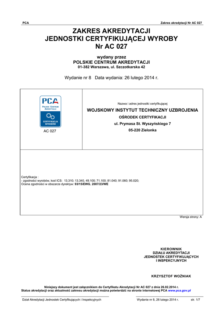 PCA Zakres akredytacji Nr AC 027 ZAKRES AKREDYTACJI JEDNOSTKI CERTYFIKUJĄCEJ WYROBY Nr AC 027 wydany przez POLSKIE CENTRUM AKREDYTACJI 01-382 Warszawa, ul. Szczotkarska 42 Wydanie nr 8 Data wydania: 26 lutego 2014 r. Nazwa i adres jednostki certyfikującej WOJSKOWY INSTYTUT TECHNICZNY UZBROJENIA OŚRODEK CERTYFIKACJI ul. Prymasa St. Wyszyńskiego 7 AC 027 05-220 Zielonka Certyfikacja : - zgodności wyrobów, kod ICS: 13.310; 13.340, 49.100; 71.100; 81.040; 91.060; 95.020; Ocena zgodności w obszarze dyrektyw: 93/15/EWG, 2007/23/WE Wersja strony: A KIEROWNIK DZIAŁU AKREDYTACJI JEDNOSTEK CERTYFIKUJĄCYCH I INSPEKCYJNYCH KRZYSZTOF WOŹNIAK Niniejszy dokument jest załącznikiem do Certyfikatu Akredytacji Nr AC 027 z dnia 26.02.2014 r. Status akredytacji oraz aktualność zakresu akredytacji można potwierdzić na stronie internetowej PCA www.pca.gov.pl Dział Akredytacji Jednostek Certyfikujących i Inspekcyjnych Wydanie nr 8, 26 lutego 2014 r. str. 1/7 PCA Zakres akredytacji Nr AC 027 Rodzaj działalności: CERTYFIKACJA ZGODNOŚCI WYROBÓW Nazwa wyrobu/ grupy wyrobów Osłony balistyczne i pancerze, w tym: - pancerze (stalowe, ceramiczne, reaktywne, inne), - kamizelki ochronne, - kamizelki kulo i odłamkoodporne, - hełmy ochronne, - hełmy odłamko i kuloodporne, - osłony ochronne (przeciwwybuchowe) kulo i odłamkoodporne, - szyby ochronne - rękawice ochronne - pojazdy specjalne; - przyczepy specjalne - pojemniki przeciwodłamkowe i przeciwwybuchowe. Techniczne środki walki radioelektronicznej i maskowania, w tym: - radiolokacyjne urządzenia ostrzegawcze, rozpoznawcze, wytwarzania zakłóceń, - radiolokacyjne makiety obiektów techniki wojskowej, - absorbery mikrofalowe, - siatki maskujące przeciwradiolokacyjne. Stacje radiolokacyjne: - do wykrywania celów; - do wykrywania i naprowadzania; - do naprowadzania i wskazywania celów; - do kierowania ogniem; - meteorologiczne; - do pomiaru prędkości pocisków; - do pomiaru prędkości pojazdów mechanicznych; - do wskazywania ruchów przeciwnika; Obiekty i elementy systemów: - urządzenia do współpracy ze stacjami radiolokacyjnymi, obiekty obróbki informacji radiolokacyjnych, System certyfikacji wg PKNGuide 67 1b 3 Akronim programu certyfikacji PCW-04 PCW-05 Numer normy lub dokumentu kryterialnego PN-V-8700:2011 PN-V-87001: 2011 PN-EN 356:2012 PN-EN 388:2006 PN-EN 397:2012 PN-EN 407:2007 PN-EN 420+A1:2010 PN-EN 812:2012 PN-EN 1063:2002 PN-EN 1522:2000 PN-EN 1523:2000 NIJ-Standard 0101.03 NIJ-Standard 0101.04 NIJ-Standard 0115.00 NIJ-Standard 0108.01 NIJ-Standard 0101.06 STANAG 4569 1b 3 PCW-04 PCW-05 KTW-58-A131 KTW-58-A132 KTW-58-A133 KTW-58-A134 KTW-58-A136 KTW-58-A137 KTW-58-A138 KTW-20-A139 KTW-58-A141 KTW-58-A941 KTW-58-A601 NO-06-A201:2009 NO-10-A208:2011 NO-10-A504:2011 1b 3 PCW-04 PCW-05 KTW-58-A113 KTW-58-A114 KTW-58-A115 KTW-58-A128 KTW-58-A135 KTW-12-A944 KTW-12-A945 KTW-12-A946 KTW-12-A947 KTW-58-A953 KTW-58-A954 1b 3 PCW-04 PCW-05 KTW-12-A101 KTW-12-A102 KTW-12-A130 KTW-12-A959 KTW-58-A143 ICS 13.310 81.040.20 95.020 91.060 13.340.20 13.340.40 49.100 Wersja strony: A Dział Akredytacji Jednostek Certyfikujących i Inspekcyjnych Wydanie nr 8, 26 lutego 2014 r. str. 2/7 PCA Zakres akredytacji Nr AC 027 Nazwa wyrobu/ grupy wyrobów obiekty dowodzenia, obiekty kierowania aktywnymi środkami walki, urządzenia kierowania ogniem trenażery radiolokacyjne System certyfikacji wg PKNGuide 67 1b 3 Akronim programu certyfikacji Numer normy lub dokumentu kryterialnego PCW-04 PCW-05 KTW-58-A145 KTW-58-A146 KTW-12-A962 NO-13-A215:2011 Urządzenia i podzespoły mikrofalowe. Anteny. 1b 3 5 PCW-04 PCW-05 PCW-06 PN-T-84710-01:1984 MIL-A-70945 Materiały wybuchowe, nie objęte przepisami ustawy z dnia 21.06.2002 (Dz.U 117/2002 poz.1007 z późniejszymi zmianami) w tym: - materiały wybuchowe kruszące, - materiały wybuchowe miotające, - materiały wybuchowe inicjujące, - stałe paliwa rakietowe, - mieszaniny pirotechniczne, 1b 3 PCW-04 PCW-05 Broń strzelecka wojskowa, bojowa, specjalna, myśliwska, sportowa, w tym: - pistolety; - rewolwery; - pistolety maszynowe; - karabiny i karabinki; - karabiny maszynowe; - broń pneumatyczna; - broń gładkolufowa; - strzelby; osprzęt do broni palnej. Celowniki termalne 1b 3 PCW-04 PCW-05 1b 3 PCW-04 PCW-05 Granatniki 1b 3 1b 3 PCW-04 PCW-05 PCW-04 PCW-05 PN-C-86014:2001 PN-C-86024:1994 PN-C-86025:1994 PN-C-86034:1999 PN-C-86045:1997 PN-C-86048:2001 PN-C-86060:1997 PN-C-86069:1998 PN-C-86078:1997 PN-C-86202:1998 PN-V-04002-1:1996 PN-V-04011-1:1997 PN-V-04011-2:1997 PN-V-04011-18:1999 PN-V-04012-1:1997 PN-V-04012-2:1999 PN-V-04019-1:1999 PN-V-04019-2:1999 PN-V-86009:2002 PN-V-86010:2002 NO-13-A205:2007 NO-13-A222:2003 NO-13-A223:2003 NO-10-A204:2007 NO-10-A206:2011 NO-10-A223:2005 KTW-12-A318 KTW-10-A103 KTW-10-A104 KTW-10-A105 KTW-10-A932 KTW-10-A933 KTW-10-A934 KTW-1B/2000 NO-10-A500-1:2000 NO-10-A500-1/A1:2009 NO-10-A500-2:2008 NO-10-A500-4:1998 NO-10-A505:2001 Wstępne założenia taktycznotechniczne na strzelecki celownik termalny – Zatwierdzone przez Szefa Wojsk Pancernych i Zmechanizowanych Dowództwa Wojsk Lądowych dnia 6.12.2010 NO-13-A507:2001 Wyroby i formy użytkowe oparte na wyżej wymienionych materiałach , w tym: bomby lotnicze, zestawy wybuchowe. Sprzęt artyleryjski: - wojskowe miotacze ognia; - wyrzutnie ładunków wydłużonych; - osprzęt do sprzętu artyleryjskiego. ICS 49.100 71.100.30 95.020 95.020 NO-10-A216:2003 NO-10-A501:2009 NO-10-A502:2009 NO-10-A506:2011 Wersja strony: A Dział Akredytacji Jednostek Certyfikujących i Inspekcyjnych Wydanie nr 8, 26 lutego 2014 r. str. 3/7 PCA Zakres akredytacji Nr AC 027 System certyfikacji wg PKNGuide 67 Akronim programu certyfikacji Uzbrojenie przeciwlotnicze, w tym: - zestawy rakietowe; - zestawy artyleryjsko-rakietowe; - zestawy artyleryjskie; - przenośne zestawy rakietowe. Rakiety, amunicja rakietowa, w tym: podzespoły i elementy. 1b 3 PCW-04 PCW-05 KTW-12-A117 KTW-12-A118 KTW-12-A119 KTW-12-A125 1b 3 PCW-04 PCW-05 Amun