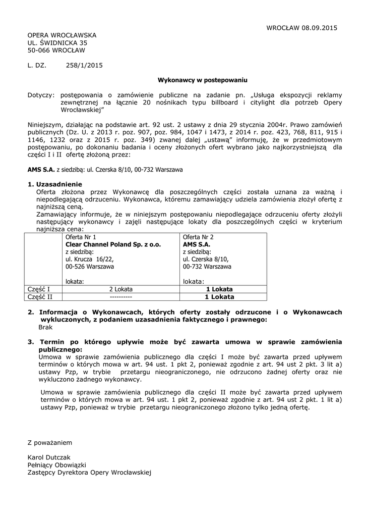 WROCŁAW 08.09.2015 OPERA WROCŁAWSKA UL. ŚWIDNICKA 35 50-066 WROCŁAW L. DZ. 258/1/2015 Wykonawcy w postepowaniu Dotyczy: postępowania o zamówienie publiczne na zadanie pn. „Usługa ekspozycji reklamy zewnętrznej na łącznie 20 nośnikach typu billboard i citylight dla potrzeb Opery Wrocławskiej” Niniejszym, działając na podstawie art. 92 ust. 2 ustawy z dnia 29 stycznia 2004r. Prawo zamówień publicznych (Dz. U. z 2013 r. poz. 907, poz. 984, 1047 i 1473, z 2014 r. poz. 423, 768, 811, 915 i 1146, 1232 oraz z 2015 r. poz. 349) zwanej dalej „ustawą” informuję, że w przedmiotowym postępowaniu, po dokonaniu badania i oceny złożonych ofert wybrano jako najkorzystniejszą dla części I i II ofertę złożoną przez: AMS S.A. z siedzibą: ul. Czerska 8/10, 00-732 Warszawa 1. Uzasadnienie Oferta złożona przez Wykonawcę dla poszczególnych części została uznana za ważną i niepodlegającą odrzuceniu. Wykonawca, któremu zamawiający udziela zamówienia złożył ofertę z najniższą ceną. Zamawiający informuje, że w niniejszym postępowaniu niepodlegające odrzuceniu oferty złożyli następujący wykonawcy i zajęli następujące lokaty dla poszczególnych części w kryterium najniższa cena: Oferta Nr 1 Oferta Nr 2 Clear Channel Poland Sp. z o.o. AMS S.A. z siedzibą: z siedzibą: ul. Krucza 16/22, ul. Czerska 8/10, 00-526 Warszawa 00-732 Warszawa lokata: Część I Część II lokata: 2 Lokata ---------- 1 Lokata 1 Lokata 2. Informacja o Wykonawcach, których oferty zostały odrzucone i o Wykonawcach wykluczonych, z podaniem uzasadnienia faktycznego i prawnego: Brak 3. Termin po którego upływie może być zawarta umowa w sprawie zamówienia publicznego: Umowa w sprawie zamówienia publicznego dla części I może być zawarta przed upływem terminów o których mowa w art. 94 ust. 1 pkt 2, ponieważ zgodnie z art. 94 ust 2 pkt. 3 lit a) ustawy Pzp, w trybie przetargu nieograniczonego, nie odrzucono żadnej oferty oraz nie wykluczono żadnego wykonawcy. Umowa w sprawie zamówienia publicznego dla części II może być zawarta przed upływem terminów o których mowa w art. 94 ust. 1 pkt 2, ponieważ zgodnie z art. 94 ust 2 pkt. 1 lit a) ustawy Pzp, ponieważ w trybie przetargu nieograniczonego złożono tylko jedną ofertę. Z poważaniem Karol Dutczak Pełniący Obowiązki Zastępcy Dyrektora Opery Wrocławskiej