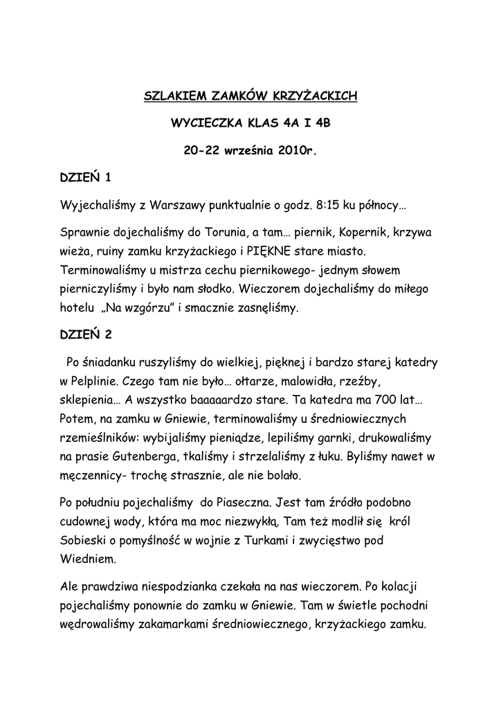 SZLAKIEM ZAMKÓW KRZYśACKICH WYCIECZKA KLAS 4A I 4B 20-22 września 2010r. DZIEŃ 1 Wyjechaliśmy z Warszawy punktualnie o godz. 8:15 ku północy… Sprawnie dojechaliśmy do Torunia, a tam… piernik, Kopernik, krzywa wieŜa, ruiny zamku krzyŜackiego i PIĘKNE stare miasto. Terminowaliśmy u mistrza cechu piernikowego- jednym słowem pierniczyliśmy i było nam słodko. Wieczorem dojechaliśmy do miłego hotelu „Na wzgórzu” i smacznie zasnęliśmy. DZIEŃ 2 Po śniadanku ruszyliśmy do wielkiej, pięknej i bardzo starej katedry w Pelplinie. Czego tam nie było… ołtarze, malowidła, rzeźby, sklepienia… A wszystko baaaaardzo stare. Ta katedra ma 700 lat… Potem, na zamku w Gniewie, terminowaliśmy u średniowiecznych rzemieślników: wybijaliśmy pieniądze, lepiliśmy garnki, drukowaliśmy na prasie Gutenberga, tkaliśmy i strzelaliśmy z łuku. Byliśmy nawet w męczennicy- trochę strasznie, ale nie bolało. Po południu pojechaliśmy do Piaseczna. Jest tam źródło podobno cudownej wody, która ma moc niezwykłą. Tam teŜ modlił się król Sobieski o pomyślność w wojnie z Turkami i zwycięstwo pod Wiedniem. Ale prawdziwa niespodzianka czekała na nas wieczorem. Po kolacji pojechaliśmy ponownie do zamku w Gniewie. Tam w świetle pochodni wędrowaliśmy zakamarkami średniowiecznego, krzyŜackiego zamku. Po powrocie- dyskoteka i skonani runęliśmy do łóŜek. DZIEŃ 3 Po śniadaniu ruszyliśmy do stolicy państwa KrzyŜackiego- Malborka. To wieeeeelki zamek. Trochę makieta, ale fajny. Miła i konkretna pani przewodnik opowiedziała nam jak Ŝyło się w średniowiecznym zamkutwierdzy. Zobaczyliśmy komnaty Wielkiego Mistrza, jadalnię, salę wizyt, zbrojownię, a nawet średniowieczne toalety (czyli potrzebnice) . Po smacznym obiedzie ruszyliśmy do Warszawy. Było fajnie i zabawnie- dziękujemy!!!