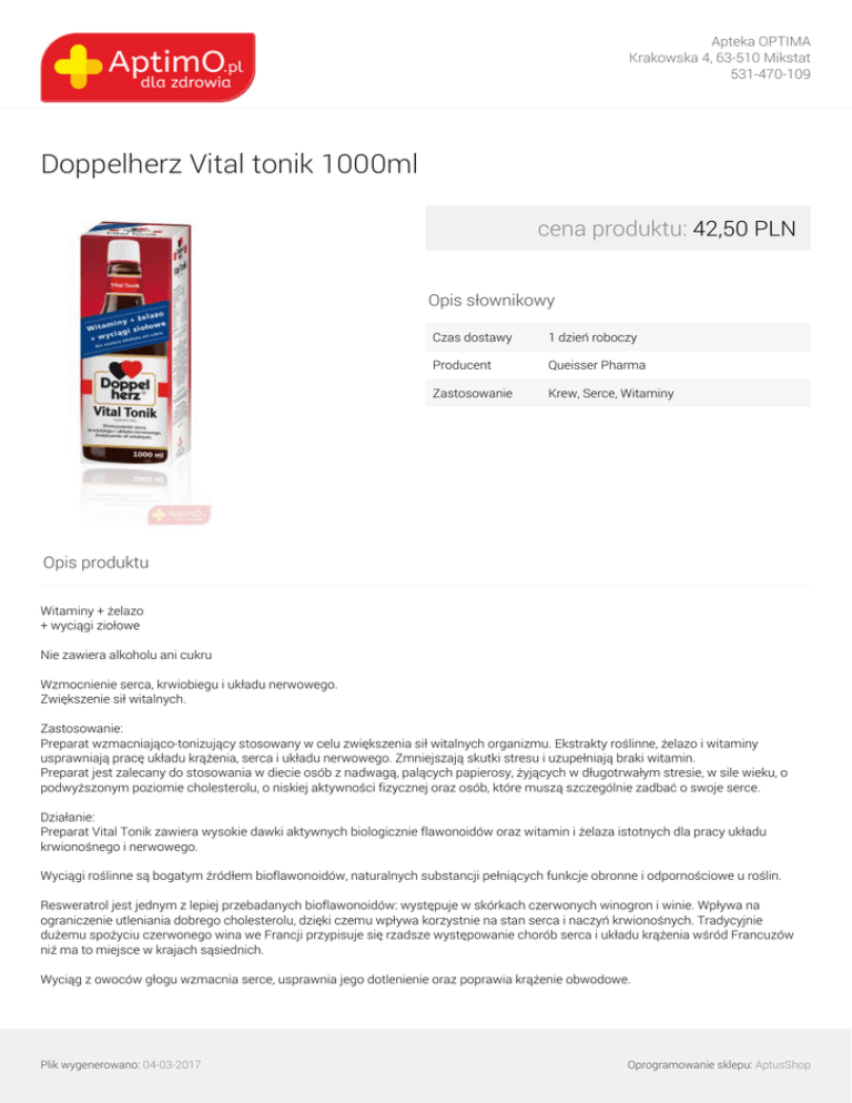 Apteka OPTIMA Krakowska 4, 63-510 Mikstat 531-470-109 Doppelherz Vital tonik 1000ml cena produktu: 42,50 PLN Opis słownikowy Czas dostawy 1 dzień roboczy Producent Queisser Pharma Zastosowanie Krew, Serce, Witaminy Opis produktu Witaminy + żelazo + wyciągi ziołowe Nie zawiera alkoholu ani cukru Wzmocnienie serca, krwiobiegu i układu nerwowego. Zwiększenie sił witalnych. Zastosowanie: Preparat wzmacniająco-tonizujący stosowany w celu zwiększenia sił witalnych organizmu. Ekstrakty roślinne, żelazo i witaminy usprawniają pracę układu krążenia, serca i układu nerwowego. Zmniejszają skutki stresu i uzupełniają braki witamin. Preparat jest zalecany do stosowania w diecie osób z nadwagą, palących papierosy, żyjących w długotrwałym stresie, w sile wieku, o podwyższonym poziomie cholesterolu, o niskiej aktywności fizycznej oraz osób, które muszą szczególnie zadbać o swoje serce. Działanie: Preparat Vital Tonik zawiera wysokie dawki aktywnych biologicznie flawonoidów oraz witamin i żelaza istotnych dla pracy układu krwionośnego i nerwowego. Wyciągi roślinne są bogatym źródłem bioflawonoidów, naturalnych substancji pełniących funkcje obronne i odpornościowe u roślin. Resweratrol jest jednym z lepiej przebadanych bioflawonoidów: występuje w skórkach czerwonych winogron i winie. Wpływa na ograniczenie utleniania dobrego cholesterolu, dzięki czemu wpływa korzystnie na stan serca i naczyń krwionośnych. Tradycyjnie dużemu spożyciu czerwonego wina we Francji przypisuje się rzadsze występowanie chorób serca i układu krążenia wśród Francuzów niż ma to miejsce w krajach sąsiednich. Wyciąg z owoców głogu wzmacnia serce, usprawnia jego dotlenienie oraz poprawia krążenie obwodowe. Plik wygenerowano: 04-03-2017 Oprogramowanie sklepu: AptusShop Apteka OPTIMA Krakowska 4, 63-510 Mikstat 531-470-109 Wyciągi z melisy i szyszek chmielu wpływają relaksująco na układ nerwowy oraz wzmacniają siły witalne organizmu. Wyciąg z melisy zawiera zarówno flawonoidy jak i olejki eteryczne, które zwiększają tolerancję na stres nerwowy oraz wykazują działanie poprawiające nastrój. Żelazo odgrywa istotną rolę w wytwarzaniu hemoglobiny i czerwonych krwinek oraz transporcie tlenu przez krew. Pomaga w utrzymaniu prawidłowych funkcji poznawczych (np. kojarzenie i zapamiętywanie) i redukuje skutki zmęczenia. Wpływa na zachowanie prawidłowej odporności organizmu. Witamina C poprzez wpływ na syntezę kolagenu wspomaga naczynia krwionośne w sercu i mózgu. Wit. C zwiększa również przyswajanie żelaza. Witaminy B1, B2, B6, B12 i kwas foliowy wpływają korzystnie na układ sercowo-naczyniowy: kwas foliowy, wit. B6 i B12 przyczyniają się do utrzymania prawidłowego poziomu homocysteiny we krwi. Witaminy B2, B6, B12, kwas foliowy oraz żelazo pełnią ważną rolę w procesach krwiotwórczych. Zaleca się spożywanie dodatkowych ilości witaminy B12 przez osoby w wieku podeszłym, u których często dochodzi do słabszego jej przyswajania. Witaminy z grupy B (B1, B2, B3, B5, B6, B12), wit. C oraz żelazo odpowiadają również za prawidłową gospodarkę energetyczną komórek, w tym komórek mięśnia sercowego. Witaminy z grupy B i C pomagają zachować prawidłowe funkcje umysłowe* i zapobiegają skutkom zmęczenia. Dodatkowo wit.B5 sprzyja utrzymaniu prawidłowej sprawności umysłowej. Witaminy B2 i C chronią komórki przed wolnymi rodnikami i dzięki temu sprzyjają zachowaniu młodego wyglądu skóry. Witamina B6 odgrywa rolę w regulacji aktywności hormonów oraz pracy układu nerwowego, szczególnie u kobiet po menopauzie. Podstawową rolę w zachowaniu witalności i zdrowia układu krążenia oraz układu nerwowego odgrywa prawidłowa, urozmaicona dieta oraz regularny, umiarkowany wysiłek fizyczny. Zaleca się również ograniczanie stresu, utrzymywanie prawidłowej wagi ciała, niepalenie papierosów oraz okresową kontrolę poziomu cholesterolu, trójglicerydów i ciśnienia tętniczego. *wit. B2 wspomaga całościowo pracę układu nerwowego . Skład: Dzienna porcja (60 ml) zawiera substancje aktywne: wyciąg z owoców głogu (5,5:1) 600 mg wyciąg z liści melisy (5:1) 600 mg koncentrat czerwonego wina (30:1) 600 mg wyciąg ze skórek winogron* (500:1) 30 mg oraz witaminy: witamina B1 3 mg (273% ZDS) witamina B2 3 mg (214% ZDS) kwas pantotenowy (wit. B5) 9,6 mg (160% ZDS) witamina B6 3 mg (214% ZDS) witamina B12 2,1 μg (84% ZDS) kwas foliowy 180 μg (90% ZDS) niacyna (wit. B3*) 15 mg (94% ZDS) witamina C 60 mg (75% ZDS) składniki mineralne: żelazo 10,5 mg (75% ZDS) * standaryzowany na zawartość aktywnych bioflawonoidów: resweratrolu, polifenoli i OPC. % zalecanego dziennego spożycia (dotyczy witamin i składników mineralnych) * w mg ekwiwalentu niacyny Skład: woda oczyszczona, sorbitol (substancja zagęszczająca), wyciąg z owoców głogu, wyciąg z liści melisy, koncentrat czerwonego wina, kwas mlekowy (regulator kwasowości), aromat mandarynkowy, sorbinian potasu (substancja konserwująca), kwas L-askorbinowy (wit. C), cytrynian amonu-żelaza (żelazo III), wyciąg ze skórek winogron, amid kwasu nikotynowego (wit.B3), wanilina (aromat), D-pantotenian wapnia (wit. B5), acesulfam K (substancja słodząca), ryboflawina (wit. B2), chlorowodorek tiaminy (wit. B1), chlorowodorek pirydoksyny Plik wygenerowano: 04-03-2017 Oprogramowanie sklepu: AptusShop Apteka OPTIMA Krakowska 4, 63-510 Mikstat 531-470-109 (wit. B6), sacharynian sodu (substancja słodząca), E 524 (regulator kwasowości), kwas pteroilomonoglutaminowy (kwas foliowy), siarczan manganu (60 μg manganu), siarczan miedzi (60 μg miedzi II), cyjanokobalamina (wit. B12). Zawiera substancje słodzące. Wartość energetyczna 100 ml: 35 kcal/ 146 kJ. Preparat może być przyjmowany przez osoby chore na cukrzycę. Nie zawiera cukru ani alkoholu. Przeciwwskazania: Nie stosować przy nadwrażliwości na jakikolwiek składnik preparatu oraz u dzieci. Sk