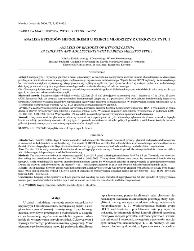 Nowiny Lekarskie 2006, 75, 5, 429–432 BARBARA MACIEJEWSKA, WITOLD STANKIEWICZ ANALIZA EPIZODÓW HIPOGLIKEMII U DZIECI I MŁODZIEŻY Z CUKRZYCĄ TYPU 1 ANALYSIS OF EPISODES OF HYPOGLYCAEMIA IN CHILDREN AND ADOLESCENTS WITH DIABETES MELLITUS TYPE 1 Klinika Endokrynologii i Diabetologii Wieku Rozwojowego Instytut Pediatrii Akademii Medycznej im. Karola Marcinkowskiego w Poznaniu Kierownik Kliniki: prof. dr hab. med. Eugeniusz Korman Streszczenie Wstęp. Cukrzyca typu 1 występuje głównie u dzieci i młodzieży i ze względu na intensywność rozwoju dziecka charakteryzuje się chwiejnym przebiegiem oraz trudnościami w osiągnięciu zaplanowanego wyrównania metabolicznego. Wyniki badań DCCT wykazały, że intensyfikacja leczenia insuliną zwiększa trzykrotnie ryzyko pojawienia się ciężkiej hipoglikemii. Epizody niedocukrzeń są ważnym problemem w diabetologii dziecięcej, ponieważ wiążą się z zagrożeniem trwałego uszkodzenia ośrodkowego układu nerwowego. Cel. Celem pracy była ocena w ciągu 6 miesięcy częstości występowania hipoglikemii i ich charakterystyka wśród dzieci i młodzieży z cukrzycą typu 1, w zależności od modelu insulinoterapii. Materiał i metody. Badaniem objęto 46 dzieci w wieku 9,22 lata (2–15 r.ż.) chorujących na cukrzycę typu 1, średnio od 4,7 ± 1,3 lat. 23 dzieci (50%) leczonych było za pomocą konwencjonalnej insulinoterapii (grupa A), a u pozostałych 50% prowadzono insulinoterapię intensywną (gruba B). Określono wskaźnik incydentów hipoglikemii liczony jako epizod/na osobę/na miesiąc. W analizowanym okresie zanotowano 4,4 ± 1,1 epizod/na osobę/miesiąc w grupie A i 4,0 ± 0,6 epizod/na osobę/na miesiąc w grupie B. Wyniki. Nie zaobserwowano różnic istotnych statystycznie pomiędzy grupami. Stężenie hemoglobiny glikowanej HbA1c było niższe w grupie dzieci, u których występowały hipoglikemie i wynosiło średnio 7,0%. Większość epizodów hipoglikemii występowała w godzinach 12.00– 18.00 (41%) i 6.00–12.00 (23%). W przypadku 18% nie udało się określić przyczyny wystąpienia epizodów niedocukrzenia. Wnioski. Utrzymanie wartości glikemii we właściwym przedziale i zapobieganie nie tylko stanom hiperglikemii, ale również epizodom hipoglikemii warunkuje prawidłową kontrolę cukrzycy typu 1 i pozwala na uniknięcie ostrych i późnych powikłań, a wielokrotna kontrola poziomu glikemii jest najpewniejszym sposobem wykrywania stanów hipoglikemii. SŁOWA KLUCZOWE: hipoglikemia, cukrzyca typu 1, dzieci. Summary Introduction. Diabetes mellitus type 1 occurs in children and adolescents. The intense process of growing, physical and psychical development is connected with difficulties in insulinotherapy. The results of DCCT trial revealed that intensification in insulinotherapy increases three times the risk of severe hypoglycaemia. Repeated incidents of severe hypoglycaemia may lead to brain damage and other later complications. Aim. The aim of this study was to evaluate the incidence of hypoglycaemia during a 6-month period, the attempt to find its reason in children with diabetes type 1 depending on model of insulin therapy. Methods. The study was carried out on 46 patients aged 9.22 yrs (2–15 years) suffering from diabetes for 4.7 ± 1.3 yrs. The study was retrospective, taking into consideration the period from 1.01.2003 to 30.06.2003. Twenty three children were treated by conventional insulin therapy (group A) while remaining 50% received intensive insulin therapy (group B). We counted episodes of hypoglycaemia as episodes/person/month. During the analysed period we noticed the mean of 4.4 ± 1.1 episode/person/month in gr. A and 4.0 ± 0.6 episodes/person/month in gr. B. Results. The differences between groups were not significant. Mean level of HbA1c was lower in children with episode of severe hypoglycaemia (7.0%) than in patients without it (7.9%). Most of incidents of hypoglycaemia occurred during the day, between 12.00–18.00 (41%) and between 6.00–12.00 (23%). Conclusions. Keeping to the right level of blood glucose and avoiding not only episodes of hyperglycaemia but also episodes of hypoglycaemia assures good control of diabetes mellitus type 1 and as a result decreases the risk of acute and later complications. KEY WORDS: hypoglycaemia, diabetes mellitus type 1, children. Wstęp U dzieci i młodzieży występuje przede wszystkim cukrzyca typu 1 (insulinozależna), cechująca się często, z uwagi na intensywność rozwoju somatycznego i psychicznego dziecka, chwiejnym przebiegiem i trudnościami w osiągnięciu zaplanowanego wyrównania metabolicznego oraz skłonnością do występowania ostrych powikłań. Cukrzyca typu 1 wymaga leczniczego podawania insuliny egzogennej. Mimo nieustannego doskonalenia metod jej podawania (insulinote- rapia intensywna, pompy insulinowe) nadal głównym niepożądanym skutkiem insulinoterapii pozostają stany hipoglikemiczne, ograniczające uzyskanie dobrego wyrównania metabolicznego [1, 2]. Wieloośrodkowe badania grupy DCCT nad kontrolą i powikłaniami cukrzycy wyraźnie wskazują, że osiągnięcie dobrej kontroli glikemii zapobiega rozwojowi różnych powikłań mikronaczyniowych, zwłaszcza retinopatii i neuropatii, szczególnie u pacjentów stosujących intensywną insulinoterapię [1, 3, 4]. Niestety, ten sam program badawczy dowodzi, że lepsza kontrola metabolicz- Barbara Maciejewska, Witold Stankiewicz 430 na i stosowanie w tym celu wielokrotnych podań insuliny wiąże się z trzykrotnie większym ryzykiem wystąpienia hipoglikemii, włączając w to śpiączki hipoglikemiczne [3, 5–7]. Epizody hipoglikemii są ważnym problemem w diabetologii dziecięcej. Szybka manifestacja kliniczna przy częstym braku objawów prodromalnych przyczynia się do spóźnionej interwencji, a powtarzające się epizody ciężkich niedocukrzeń wiążą się z zagrożeniem trwałego uszkodzenia ośrodkowego układu nerwowego i funkcji korowych. Wielokrotn