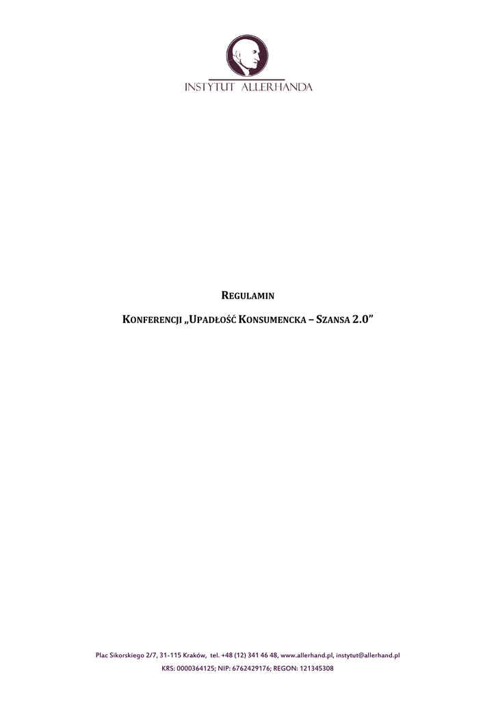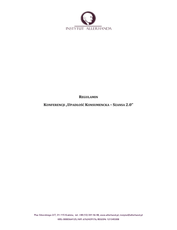 REGULAMIN KONFERENCJI „UPADŁOŚĆ KONSUMENCKA – SZANSA 2.0” Plac Sikorskiego 2/7, 31-115 Kraków, tel. +48 (12) 341 46 48, www.allerhand.pl, [email protected] KRS: 0000364125; NIP: 6762429176; REGON: 121345308 §1 POSTANOWIENIA OGÓLNE 1. Konferencja „UPADŁOŚĆ KONSUMENCKA – SZANSA 2.0”, zwana w dalszej części niniejszego Regulaminu „Konferencją” odbędzie się w dniu 28 stycznia 2016 r., w Warszawie. 2.Organizatorem Konferencji jest Instytut Allerhanda, z siedzibą w Krakowie, Plac Sikorskiego 2/7, 31-115 Kraków, wpisany do rejestru stowarzyszeń, innych organizacji społecznych i zawodowych, fundacji oraz publicznych zakładów opieki zdrowotnej, prowadzonego przez Sąd Rejonowy dla Krakowa Śródmieścia w Krakowie, XI Wydział Gospodarczy Krajowego Rejestru Sądowego, pod nr KRS 0000364125, NIP 676-242-91-76, REGON 121345308, zwany w dalszej części niniejszego Regulaminu „Organizatorem” §2 ZASADY UCZESTNICTWA W KONFERENCJI 1.Udział w Konferencji jest bezpłatny dla wszystkich uczestników. 2.Warunkiem uczestnictwa w Konferencji jest prawidłowa rejestracja poprzez wypełnienie formularza rejestracyjnego, zwanego w dalszej części niniejszego Regulaminu „Formularzem Rejestracyjnym”:, który znajduje się na oficjalnym serwisie internetowym Konferencji: www.upadlosckonsumencka.allerhand.pl 3.Rejestracja będzie prowadzona do dnia 26 stycznia 2016 r. Organizator zastrzega sobie możliwość zakończenia rejestracji we wcześniejszym terminie, w przypadku wyczerpania puli dostępnych miejsc na Konferencji. 4.Administratorem danych osobowych uczestników Konferencji jest Organizator. Celem zbierania danych osobowych jest rejestracja uczestników Konferencji oraz jego organizacja. Uczestnicy Konferencji mają prawo dostępu do treści swoich danych oraz ich poprawiania. 5.Uczestnik Konferencji, który dokonał rejestracji, ma prawo do rezygnacji z udziału w wydarzeniu bez podania przyczyny, przy czym uprasza się o poinformowanie o tym fakcie Organizatora. Informację taką należy przesłać na adres e-mail: [email protected]. §3 ORGANIZACJA KONFERENCJI 1.Organizator zastrzega sobie prawo do zmian w programie Konferencji, w szczególności w związku z pojawieniem się nowych aktualnych tematów czy też potwierdzenia bądź rezygnacji z uczestnictwa przez niektórych prelegentów. Z tego tytułu Uczestnikowi nie przysługują względem Organizatora żadne roszczenia. Plac Sikorskiego 2/7, 31-115 Kraków, tel. +48 (12) 341 46 48, www.allerhand.pl, [email protected] KRS: 0000364125; NIP: 6762429176; REGON: 121345308 2.Organizator zastrzega sobie prawo do zmiany terminu Konferencji z przyczyn od niego niezależnych lub jej odwołania. Jednocześnie Organizator nie pokrywa kosztów dodatkowych poniesionych przez Uczestnika w związku z udziałem w Konferencji. 3.Organizator nie odpowiada za niemożliwość lub trudności w przeprowadzeniu Konferencji, wynikające z przyczyn od niego niezależnych, w tym w szczególności z powodu: a) działań osób trzecich zakłócających lub w jakikolwiek inny sposób wpływających na funkcjonowanie Serwisu Internetowego Konferencji lub przebieg Konferencji, b) działań partnerów, sponsorów lub innych podmiotów zaangażowanych w organizację Konferencji. 5.Zabronione jest filmowanie, nagrywanie i fotografowanie podczas Konferencji bez zgody Organizatora. 6.Organizator nie ponosi odpowiedzialności za formę i instrumenty przekazu marketingowego, które kierowane są przez partnerów, sponsorów lub inne podmioty zaangażowane w organizację Konferencji do osób przebywających w pomieszczeniach przeznaczonych pod powierzchnie konferencyjne. 7.Organizator nie ponosi odpowiedzialności za jakiekolwiek rzeczy należące do Uczestników, które mogą zostać zgubione, zniszczone lub skradzione podczas Konferencji. 8.Organizator zastrzega sobie prawo do wykluczenia Uczestnika z udziału w Konferencji w przypadku, gdy działania Uczestnika naruszają porządek publiczny, negatywnie wpływają na dobre imię Organizatora lub w inny sposób wyrządzają lub mogą wyrządzić mu szkodę. §4 WIZERUNEK 1. Organizator ma prawo do utrwalania i rozpowszechniania imienia, nazwiska i wizerunku Uczestników. 2. Organizator ma w szczególności prawo do umieszczenia imienia i nazwiska Uczestnika wraz z podaniem jego aktualnej afiliacji w serwisie internetowym Konferencji. 3. Organizator ma prawo do rejestracji i publikacji materiałów związanych z przebiegiem Konferencji oraz udostępniania tych materiałów osobom trzecim. 4. Udział w Konferencji jest równoznaczny z wyrażeniem zgody na komercyjne ich wykorzystanie w przypadku: a) gdy Uczestnik zostanie sfilmowany lub sfotografowany, jako element całości, b) gdy Uczestnik dobrowolnie wyrazi zgodę na udzielenie wywiadu przed kamerą lub pozowanie do zdjęcia. §5 REKLAMACJE Plac Sikorskiego 2/7, 31-115 Kraków, tel. +48 (12) 341 46 48, www.allerhand.pl, [email protected] KRS: 0000364125; NIP: 6762429176; REGON: 121345308 1. Wszelkie reklamacje Uczestników wobec Organizatora powinny być przesyłane na adres Organizatora w formie pisemnej pod rygorem bezskuteczności. 2. Reklamacje Uczestników mogą być zgłaszane nie później niż w terminie 14 dni od dnia zakończenia Konferencji. Wszelkie reklamacje zgłoszone po tym terminie nie będą rozpatrywane. 3. Organizator rozpatrzy zgłoszone reklamacje w ciągu trzydziestu dni od ich otrzymania. §6 POSTANOWIENIA KOŃCOWE 1. Wszelkie spory mogące wyniknąć z tytułu udziału Uczestników w Konferencji będą rozstrzygane przez sąd właściwy dla siedziby Organizatora. 2. W sprawach nieuregulowanych w Regulaminie zastosowanie mają przepisy Kodeksu cywilnego oraz inne obowiązujące przepisy prawa. 3. Akceptacja Regulaminu jest równoznaczna z wyrażeniem zgody na przetwarzanie danych osobowych przez Organizatora na zasadach wynikających z obowiązujących przepisów prawa, w szczególności z Ustawy z dnia 29 sierpnia