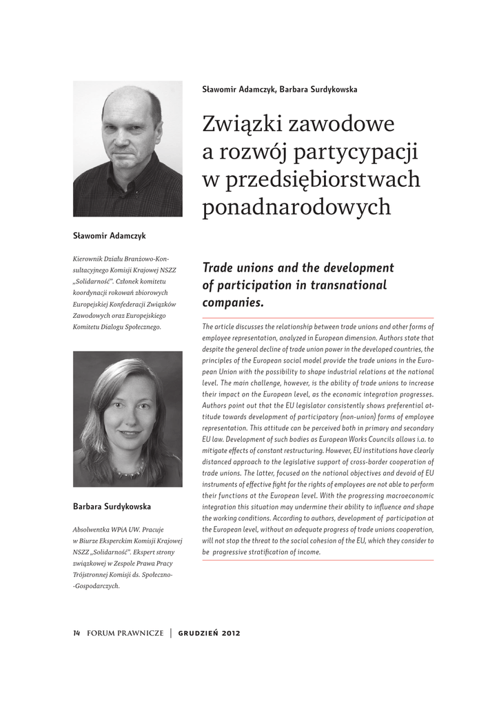 Sławomir Adamczyk, Barbara Surdykowska Związki zawodowe a rozwój partycypacji w przedsiębiorstwach ponadnarodowych Sławomir Adamczyk Kierownik Działu Branżowo-Konsultacyjnego Komisji Krajowej NSZZ „Solidarność”. Członek komitetu koordynacji rokowań zbiorowych Europejskiej Konfederacji Związków Trade unions and the development of participation in transnational companies. Zawodowych oraz Europejskiego Komitetu Dialogu Społecznego. Barbara Surdykowska Absolwentka WPiA UW. Pracuje w Biurze Eksperckim Komisji Krajowej NSZZ „Solidarność”. Ekspert strony The article discusses the relationship between trade unions and other forms of employee representation, analyzed in European dimension. Authors state that despite the general decline of trade union power in the developed countries, the principles of the European social model provide the trade unions in the European Union with the possibility to shape industrial relations at the national level. The main challenge, however, is the ability of trade unions to increase their impact on the European level, as the economic integration progresses. Authors point out that the EU legislator consistently shows preferential attitude towards development of participatory (non-union) forms of employee representation. This attitude can be perceived both in primary and secondary EU law. Development of such bodies as European Works Councils allows i.a. to mitigate effects of constant restructuring. However, EU institutions have clearly distanced approach to the legislative support of cross-border cooperation of trade unions. The latter, focused on the national objectives and devoid of EU instruments of effective fight for the rights of employees are not able to perform their functions at the European level. With the progressing macroeconomic integration this situation may undermine their ability to influence and shape the working conditions. According to authors, development of participation at the European level, without an adequate progress of trade unions cooperation, will not stop the threat to the social cohesion of the EU, which they consider to be progressive stratification of income. związkowej w Zespole Prawa Pracy Trójstronnej Komisji ds. Społeczno-Gospodarczych. 14 FORUM PR AWNICZE | grudzień 2012 artykuły Uwagi wstępne Europejski kryzys zadłużeniowy ujawnił z całą mocą problemy związane z unijną polityką makroekonomiczną, ale także zmusił do stawiania pytań o rolę i znaczenie przedstawicielstwa pracowniczego w obliczu zmian, które mają charakter systemowy i podważają dotychczasowe zasady relacji między kapitałem, pracą i władzą publiczną na każdym poziomie tych kontaktów. W niniejszym artykule odniesiemy się przede wszystkim do wymiaru unijnego. Procesy, które tu zachodzą, mogą mieć bowiem zasadnicze znaczenie dla przyszłości zbiorowej reprezentacji interesów pracowniczych w Europie. a tym samym ograniczają zdolność pozytywnego wpływu na funkcjonowanie przedsiębiorstwa. Potwierdzają to badania, z których wynika, że oddziaływanie związków zawodowych przesądza o realnym znaczeniu pozazwiązkowych reprezentacji pracowniczych2. Naszym zdaniem jest to tym bardziej prawdziwe w odniesieniu do unijnego poziomu relacji przemysłowych – tylko bardziej trudne do osiągnięcia niż w przypadku systemów krajowych, w których takie interakcje wspomagane są z reguły mechanizmami prawnymi. Można by się spodziewać, że wraz z pogłębianiem integracji gospodarczej oraz powstawaniem jednolitego rynku, punkt ciężkości działań związków zawo- Chociaż związki zawodowe państw UE od prawie czterdziestu lat posiadają własną centralną organizację, to skala europeizacji ich działań nie jest olśniewająca. Przedstawicielstwa pracownicze zazwyczaj dzieli się na związkowe i pozazwiązkowe. Przy czym niekiedy są one traktowane przez badaczy rozłącznie – ze względu na kryterium celu ich działania. Wskazuje się, że rewindykacyjny charakter związków zawodowych jest nie do pogodzenia z uczestnictwem ciał pozazwiązkowych w procesie partycypacji, opartym z założenia na formule współpracy w zabieganiu o dobro przedsiębiorstwa1. Trudno jednak sobie wyobrazić rzeczywisty rozwój partycypacji pracowniczej w oderwaniu od struktur związków zawodowych, gdyż te ostatnie zapewniają względną równowagę sił w prowadzeniu jakiejkolwiek formy dialogu na poziomie przedsiębiorstwa. Dlatego można mówić o swego rodzaju systemie naczyń połączonych, w którym słabość lub fasadowość związków zawodowych prowadzą nieuchronnie do marginalizacji strony pracowniczej, dowych będzie przemieszczał się na poziom unijny – w ślad za ponadgranicznym rozwojem aktywności kapitału. Nie do końca tak się dzieje. Chociaż związki zawodowe państw UE od prawie czterdziestu lat posiadają własną centralną organizację3, to skala europeizacji ich działań nie jest olśniewająca. Nie widać także działań unijnego legislatora, by takie dążenia promować. Wspieranie zbiorowych uprawnień pracowników w wymiarze ponadnarodowym niewątpliwie postępuje, ale jest ukierunkowane przede wszystkim na pozazwiązkową reprezentację pracowniczą. Można się zastanawiać, czy ta asymetria wynika wyłącznie z niezdolności związków zawodowych do efektywnej europeizacji własnych działań, czy może także z obaw ustawodawcy unijnego przed wzmoc2 J. Wratny, Związki zawodowe. Znaczenie w życiu politycznym i społeczno-gospodarczym (w:) J. Wratny, M. Bednarski (red.), 1 S. Rudolf, Partycypacja a globalizacja (w:)Trzydzieści lat ustawy o samorządzie załogi przedsiębiorstwa państwowego – materiały z konferencji, 2012, http://ww2.senat.pl/k7/agenda/seminar/110916/110916.pdf, s. 193–210 (dostęp: 6 grudnia 2012). Związki zawodowe a niezwiązkowe przedstawicielstwa pracownicze w gospodarce posttransformacyjnej, Warszawa 2010, s. 45. 3 Europejska Konfederacja Związków