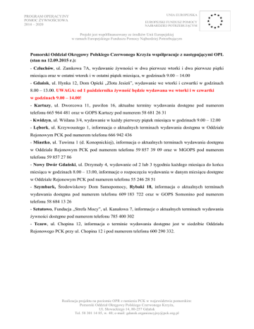 UNIA EUROPEJSKA PROGRAM OPERACYJNY POMOC ŻYWNOŚCIOWA 2014 – 2020 EUROPEJSKI FUNDUSZ POMOCY NAJBARDZIEJ POTRZEBUJĄCYM Projekt jest współfinansowany ze środków Unii Europejskiej w ramach Europejskiego Funduszu Pomocy Najbardziej Potrzebującym Pomorski Oddział Okręgowy Polskiego Czerwonego Krzyża współpracuje z następującymi OPL (stan na 12.09.2015 r.): - Człuchów, ul. Zamkowa 7A, wydawanie żywności w dwa pierwsze wtorki i dwa pierwsze piątki miesiąca oraz w ostatni wtorek i w ostatni piątek miesiąca, w godzinach 9.00 – 14.00 - Gdańsk, ul. Hynka 12, Dom Opieki „Złota Jesień”, wydawanie we wtorki i czwartki w godzinach 8.00 – 13.00. UWAGA: od 1 października żywność będzie wydawana we wtorki i w czwartki w godzinach 9.00 – 14.00! - Kartuzy, ul. Dworcowa 11, pawilon 16, aktualne terminy wydawania dostępne pod numerem telefonu 665 964 481 oraz w GOPS Kartuzy pod numerem 58 681 26 31 - Kwidzyn, ul. Wiślana 3/4, wydawanie w każdy pierwszy piątek miesiąca w godzinach 9.00 – 12.00 - Lębork, ul. Krzywoustego 1, informacja o aktualnych terminach wydawania dostępna w Oddziale Rejonowym PCK pod numerem telefonu 666 942 436 - Miastko, ul. Tuwima 1 (d. Konopnickiej), informacja o aktualnych terminach wydawania dostępna w Oddziale Rejonowym PCK pod numerem telefonu 59 857 39 09 oraz w MGOPS pod numerem telefonu 59 857 27 86 - Nowy Dwór Gdański, ul. Drzymały 4, wydawanie od 2 lub 3 tygodnia każdego miesiąca do końca miesiąca w godzinach 8.00 – 13.00, informacje o rozpoczęciu wydawania w danym miesiącu dostępne w Oddziale Rejonowym PCK pod numerem telefonu 55 246 28 51 - Szymbark, Środowiskowy Dom Samopomocy, Rybaki 18, informacja o aktualnych terminach wydawania dostępna pod numerem telefonu 609 183 722 oraz w GOPS Somonino pod numerem telefonu 58 684 13 26 - Sztutowo, Fundacja „Strefa Mocy”, ul. Kanałowa 7, informacje o aktualnych terminach wydawania żywności dostępne pod numerem telefonu 785 400 302 - Tczew, ul. Chopina 12, informacja o terminie wydawania dostępne jest w siedzibie Oddziału Rejonowego PCK przy ul. Chopina 12 i pod numerem telefonu 600 290 332. Realizacja projektu na poziomie OPR z ramienia PCK w województwie pomorskim: Pomorski Oddział Okręgowy Polskiego Czerwonego Krzyża, Ul. Słowackiego 14, 80-257 Gdańsk Tel. 58 301 14 85, w. 40; e-mail: [email protected]