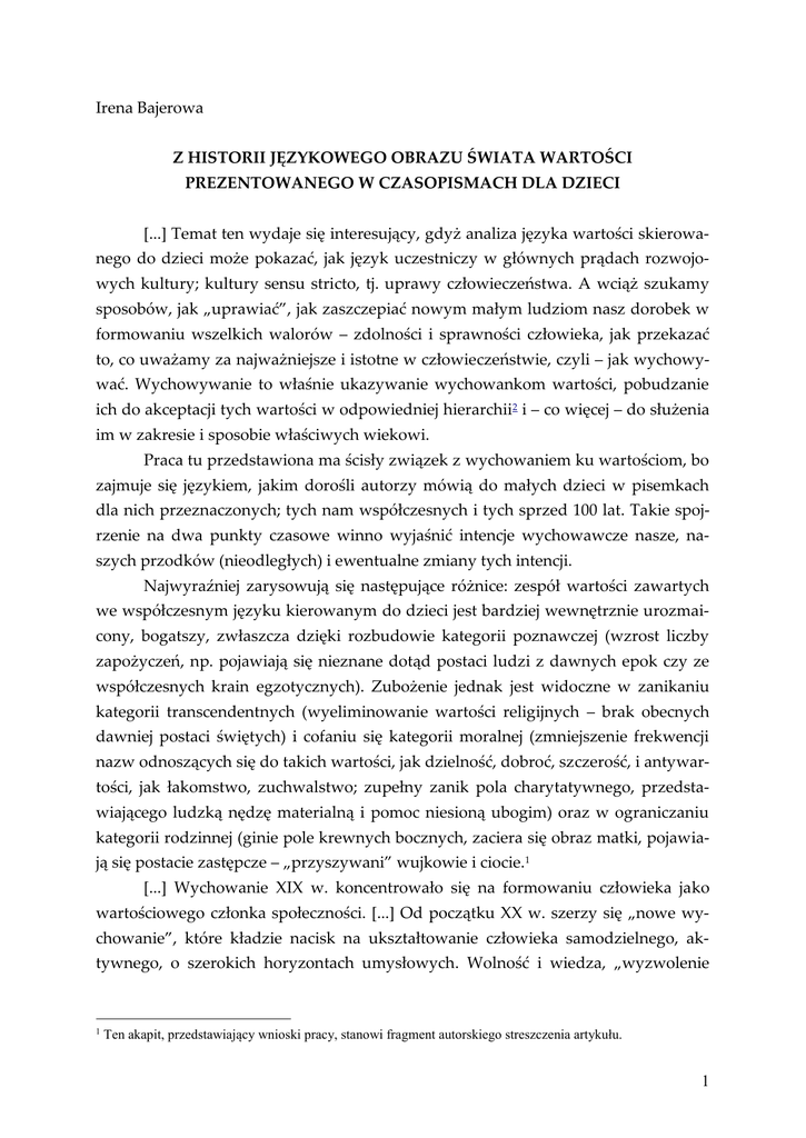 Irena Bajerowa Z HISTORII JĘZYKOWEGO OBRAZU ŚWIATA WARTOŚCI PREZENTOWANEGO W CZASOPISMACH DLA DZIECI [...] Temat ten wydaje się interesujący, gdyż analiza języka wartości skierowanego do dzieci może pokazać, jak język uczestniczy w głównych prądach rozwojowych kultury; kultury sensu stricto, tj. uprawy człowieczeństwa. A wciąż szukamy sposobów, jak „uprawiać”, jak zaszczepiać nowym małym ludziom nasz dorobek w formowaniu wszelkich walorów – zdolności i sprawności człowieka, jak przekazać to, co uważamy za najważniejsze i istotne w człowieczeństwie, czyli – jak wychowywać. Wychowywanie to właśnie ukazywanie wychowankom wartości, pobudzanie ich do akceptacji tych wartości w odpowiedniej hierarchii2 i – co więcej – do służenia im w zakresie i sposobie właściwych wiekowi. Praca tu przedstawiona ma ścisły związek z wychowaniem ku wartościom, bo zajmuje się językiem, jakim dorośli autorzy mówią do małych dzieci w pisemkach dla nich przeznaczonych; tych nam współczesnych i tych sprzed 100 lat. Takie spojrzenie na dwa punkty czasowe winno wyjaśnić intencje wychowawcze nasze, naszych przodków (nieodległych) i ewentualne zmiany tych intencji. Najwyraźniej zarysowują się następujące różnice: zespół wartości zawartych we współczesnym języku kierowanym do dzieci jest bardziej wewnętrznie urozmaicony, bogatszy, zwłaszcza dzięki rozbudowie kategorii poznawczej (wzrost liczby zapożyczeń, np. pojawiają się nieznane dotąd postaci ludzi z dawnych epok czy ze współczesnych krain egzotycznych). Zubożenie jednak jest widoczne w zanikaniu kategorii transcendentnych (wyeliminowanie wartości religijnych – brak obecnych dawniej postaci świętych) i cofaniu się kategorii moralnej (zmniejszenie frekwencji nazw odnoszących się do takich wartości, jak dzielność, dobroć, szczerość, i antywartości, jak łakomstwo, zuchwalstwo; zupełny zanik pola charytatywnego, przedstawiającego ludzką nędzę materialną i pomoc niesioną ubogim) oraz w ograniczaniu kategorii rodzinnej (ginie pole krewnych bocznych, zaciera się obraz matki, pojawiają się postacie zastępcze – „przyszywani” wujkowie i ciocie.1 [...] Wychowanie XIX w. koncentrowało się na formowaniu człowieka jako wartościowego członka społeczności. [...] Od początku XX w. szerzy się „nowe wychowanie”, które kładzie nacisk na ukształtowanie człowieka samodzielnego, aktywnego, o szerokich horyzontach umysłowych. Wolność i wiedza, „wyzwolenie 1 Ten akapit, przedstawiający wnioski pracy, stanowi fragment autorskiego streszczenia artykułu. 1 indywidualnych zdolności dziecka” – to są nowe priorytety, wobec których na plan dalszy schodzą dawniej cenione wartości [...] Za zmianami kierunku wychowawczego idą zmiany funkcji literatury dziecięcej (oczywiście i prasy dziecięcej). W XIX wieku nadrzędną formułą tej literatury była służebność wobec pedagogiki [...]. Ta pierwotna funkcja, będąca funkcją dydaktyczną [...] zostaje w okresie międzywojennym zastąpiona funkcją ludyczną [...] lub przybiera postać edukacyjną czy wychowawczo-kształcącą. [...] Językowe obrazy świata wartości wyłaniające się z tekstów „Światełka” i „Misia” pokazały [...] pewien fragment historii języka, historii jego udziału w procesie wychowywania człowieka. Zgodnie z sugestią Bartmińskiego, badając język od strony poznawczej, szukaliśmy odpowiedzi na pytania „co mówi język o wartościach, jakie informacje o wartościach dadzą się z języka wydobyć”2 i jak wyglądał nasz system wartości przekazywany przez język narodowy w dwu badanych punktach historycznych. Pracę tę wreszcie można odczytać jako pewną próbę odpowiedzi na postulat Janusza Anusiewicza, który przypomina, że język należy traktować jako siłę twórczą i dążyć do tego, by „uporządkować i uczynić ważny i znaczący świat wartości w nim zawarty [...] a rujnowany i zmieniany – często przez polityków, ideologów oraz działania wymierzone przeciwko tym wartościom”3. Przedstawione tu badania starały się właśnie uporządkować dwa językowe światy wartości rozdzielone wiekiem dwudziestym, który – czego byliśmy i jesteśmy świadkami – zakwestionował uprzednią hierarchię wartości i ustanowił inną. Irena Bajerowa, Z historii językowego obrazu świata wartości prezentowanego w czasopismach dla dzieci, „Etnolingwistyka” 21, Lublin 2009, s. 205–234. J. Bartmiński, Językowe podstawy obrazu świata, Lublin 2006, s. 135. J. Anusiewicz, Problematyka językowego obrazu świata w poglądach niektórych językoznawców i filozofów niemieckich XX wieku, w: Językowy obraz świata, red. J. Bartmiński, Lublin 1990, s. 294 2 3 2