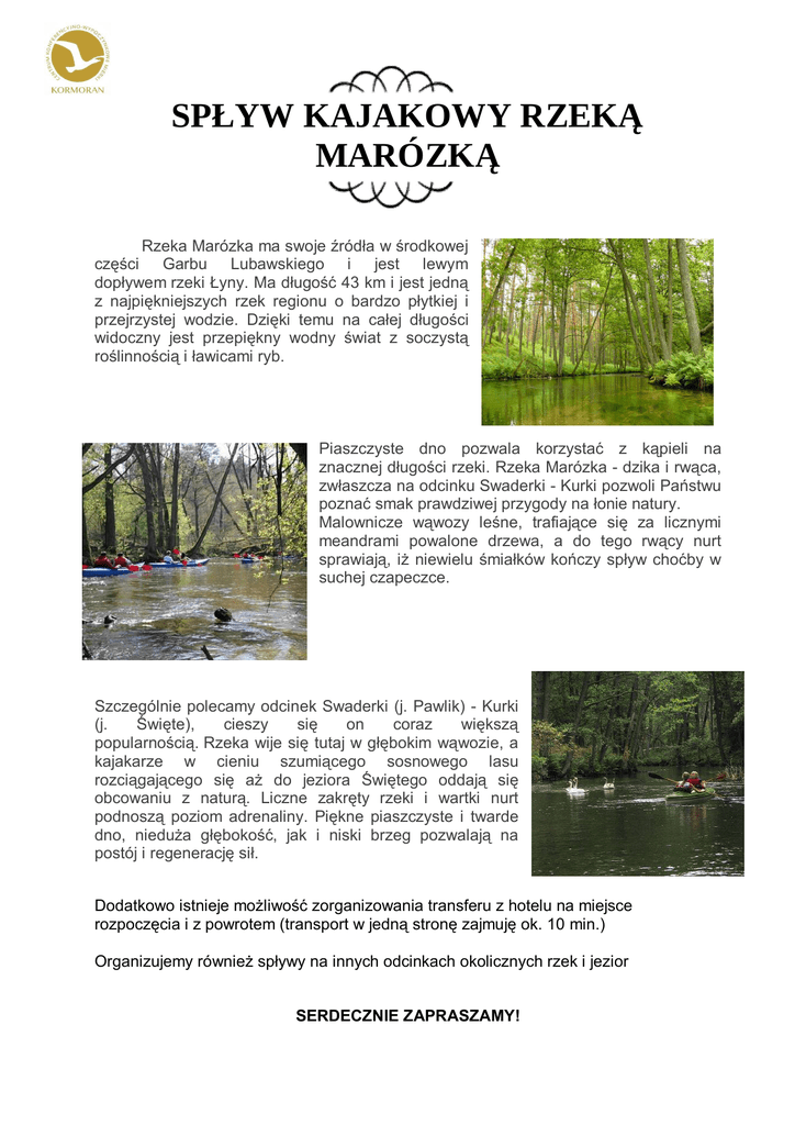 SPŁYW KAJAKOWY RZEKĄ MARÓZKĄ Rzeka Marózka ma swoje źródła w środkowej części Garbu Lubawskiego i jest lewym dopływem rzeki Łyny. Ma długość 43 km i jest jedną z najpiękniejszych rzek regionu o bardzo płytkiej i przejrzystej wodzie. Dzięki temu na całej długości widoczny jest przepiękny wodny świat z soczystą roślinnością i ławicami ryb. Piaszczyste dno pozwala korzystać z kąpieli na znacznej długości rzeki. Rzeka Marózka - dzika i rwąca, zwłaszcza na odcinku Swaderki - Kurki pozwoli Państwu poznać smak prawdziwej przygody na łonie natury. Malownicze wąwozy leśne, trafiające się za licznymi meandrami powalone drzewa, a do tego rwący nurt sprawiają, iż niewielu śmiałków kończy spływ choćby w suchej czapeczce. Szczególnie polecamy odcinek Swaderki (j. Pawlik) - Kurki (j. Święte), cieszy się on coraz większą popularnością. Rzeka wije się tutaj w głębokim wąwozie, a kajakarze w cieniu szumiącego sosnowego lasu rozciągającego się aż do jeziora Świętego oddają się obcowaniu z naturą. Liczne zakręty rzeki i wartki nurt podnoszą poziom adrenaliny. Piękne piaszczyste i twarde dno, nieduża głębokość, jak i niski brzeg pozwalają na postój i regenerację sił. Dodatkowo istnieje możliwość zorganizowania transferu z hotelu na miejsce rozpoczęcia i z powrotem (transport w jedną stronę zajmuję ok. 10 min.) Organizujemy również spływy na innych odcinkach okolicznych rzek i jezior SERDECZNIE ZAPRASZAMY!