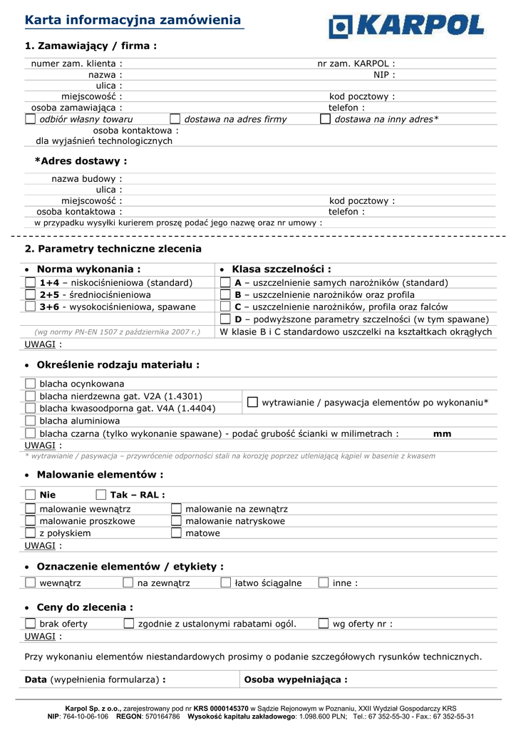 Karta informacyjna zamówienia 1. Zamawiający / firma : numer zam. klienta : nazwa : ulica : miejscowość : osoba zamawiająca : odbiór własny towaru dostawa na adres firmy osoba kontaktowa : dla wyjaśnień technologicznych nr zam. KARPOL : NIP : kod pocztowy : telefon : dostawa na inny adres* *Adres dostawy : nazwa budowy ulica miejscowość osoba kontaktowa : : : : kod pocztowy : telefon : w przypadku wysyłki kurierem proszę podać jego nazwę oraz nr umowy : 2. Parametry techniczne zlecenia Norma wykonania : Klasa szczelności : 1+4 – niskociśnieniowa (standard) 2+5 - średniociśnieniowa 3+6 - wysokociśnieniowa, spawane (wg normy PN-EN 1507 z października 2007 r.) A – uszczelnienie samych narożników (standard) B – uszczelnienie narożników oraz profila C – uszczelnienie narożników, profila oraz falców D – podwyższone parametry szczelności (w tym spawane) W klasie B i C standardowo uszczelki na kształtkach okrągłych UWAGI : Określenie rodzaju materiału : blacha blacha blacha blacha blacha UWAGI : ocynkowana nierdzewna gat. V2A (1.4301) wytrawianie / pasywacja elementów po wykonaniu* kwasoodporna gat. V4A (1.4404) aluminiowa czarna (tylko wykonanie spawane) - podać grubość ścianki w milimetrach : mm * wytrawianie / pasywacja – przywrócenie odporności stali na korozję poprzez utleniającą kąpiel w basenie z kwasem Malowanie elementów : Nie Tak – RAL : malowanie wewnątrz malowanie proszkowe z połyskiem UWAGI : malowanie na zewnątrz malowanie natryskowe matowe Oznaczenie elementów / etykiety : wewnątrz na zewnątrz łatwo ściągalne inne : Ceny do zlecenia : brak oferty UWAGI : zgodnie z ustalonymi rabatami ogól. wg oferty nr : Przy wykonaniu elementów niestandardowych prosimy o podanie szczegółowych rysunków technicznych. Data (wypełnienia formularza) : Osoba wypełniająca : Karpol Sp. z o.o., zarejestrowany pod nr KRS 0000145370 w Sądzie Rejonowym w Poznaniu, XXII Wydział Gospodarczy KRS NIP: 764-10-06-106 REGON: 570164786 Wysokość kapitału zakładowego: 1.098.600 PLN; Tel.: 67 352-55-30 - Fax.: 67 352-55-31