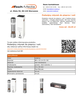 Dane kontaktowe tel. +48 22 122 13 00 , fax. +48 22 122 13 01 email: [email protected] ul. Złota 59, 00-120 Warszawa www: www.tech-media.pl Podwójny młynek do pieprzu i soli Podwójny młynek do pieprzu i soli. Z jednej strony solniczka, z drugiej pieprzniczka. Sól oraz ziarnka pieprzu nie są dołączone. Młynek zapakowany w pudełko upominkowe Paul Bocuse. Wzór zastrzeżony. Stal nierdzewna. Cena od : 64,05 zł To jest ulotka informacyjna produktu: Podwójny młynek do pieprzu i soli, aby zobaczyć pełną informację wejdź na: www.tech-media.pl/podwjny,mynek,do,pieprzu,i,soli,017210.html lub zeskanuj kod QR. Specyfikacja Kolor srebrny Rozmiar Ø5 x 22 cm (Ś x W) Materiał stal nierdzewna Znakowanie grawer, ilość kolorów: 1 Rozmiar znakowania 15 x 35 mm Marka Paul Bocuse Opakowanie zbiorcze 24 szt. Minimalne zamówienie 10 szt.
