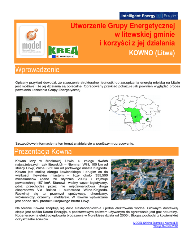 Utworzenie Grupy Energetycznej w litewskiej gminie i korzyści z jej działania KOWNO (Litwa) Wprowadzenie Opisany przykład dowodzi, że stworzenie strukturalnej jednostki do zarządzania energią miejską na Litwie jest możliwe i że jej działania są opłacalne. Opracowany przykład pokazuje jak powinien wyglądać proces powołania i działania Grupy Energetycznej. Szczegółowe informacje na ten temat znajdują się w poniższym opracowaniu. Prezentacja Kowna Kowno leży w środkowej Litwie, u zbiegu dwóch najważnjeszych rzek litewskich – Niemna i Wilii, 100 km od stolicy Litwy, Wilna i 250 km od portowego miasta Kłajpeda. Kowno jest stolicą okręgu kowieńskiego i drugim co do wielkości litewskim miastem – liczy około 355,500 mieszkańców (dane ze stycznia 2008) i zajmuje powierzchnię 157 km². Stanowi ważny węzeł logistyczny, gdyż przechodzą przez nie międzynarodowa droga ekspresowa Via Baltica i autostrada Wilno-Kłajpeda. Rozwinął się tu przemysł spożywczy, chemiczny, włókienniczy, drzewny i meblarski. W Kownie wytwarzane jest ponad 10% produktu krajowego brutto Litwy. Na terenie Kowna znajdują się dwie elektrociepłownie i jedna elektrownia wodna. Głównym dostawcą ciepła jest spółka Kauno Energija, a podstawowym paliwem używanym do ogrzewania jest gaz naturalny. Kogeneracyjna elektrociepłownia biogazowa w Noreikises działa od 2005r. Biogaz pochodzi z kowieńskiej oczyszczalni ścieków. MODEL Shining Example / Kowno (LT) Wersja Sierpień 2008 Działania zmierzające do osiągnięcia zrównoważonego rozwoju energii Europejska Nagroda w dziedzinie Energetyki (The European Energy Award - EEA) jest przyznawana jako dowód pozytywnej oceny działań podjętych przez miasta i gminy, które w znacznym stopniu przyczyniły się do poprawy efektywności energetycznej i wykorzystania odnawialnych źródeł energii. Głównymi elementami EEA są: wprowadzenie systemu kontroli jakości (TQM) dotyczącego zagadnień energetycznych certyfikacja i wyróżnienie za osiągnięcia z zakresu energii w dwóch nagradzanych kategoriach oraz zewnętrzne oceny osiągnięć organizacja sieci mających za zadanie lepszą współpracę i wymianę informacji wewnątrz i między gminami Od czego zaczęło Kowno: Podjęte działania: 1. Powołanie Grupy Energetycznej w gminie 2. Zaplanowanie 6 obszarów działania na polu lokalnym: gospodarka i planowanie przestrzenne budynki użyteczności publicznej, inne obiekty gospodarka komunalna komunikacja miejska wewnętrzna organizacja zewnętrzna wymiana informacji i kooperacja 3. Opracowanie projektu polityki energetycznej 4. Proces certyfikacji Obecna sytuacja w Kownie: Corocznie (od 2005) przeprowadza się wewnętrzną kontrolę przeprowadzanych działań i omawia jej wyniki. W każdym z sześciu sektorów w ciągu dwóch lat (2005, 2006) osiągnięto poprawę: komunikacja miejska 13 % budynki użyteczności publicznej, inne obiekty 11 % wewnętrzna organizacja 11 % zaopatrzenie, dystrybucja 8% zewnętrzna wymiana informacji i kooperacja 4% gospodarka i planowanie przestrzenne 1% Plan Polityki Energetycznej został zrealizowany w 74%. MODEL Shining Example / Kowno (LT) Wersja Sierpień 2008 Główne osiągnięcia Aż do teraz corocznie odnotowuje się pozytywne wyniki na wymienionych sześciu polach działań lokalnych. Proces wprowadzenia programu polityki energetycznej zakończył się powodzeniem. Korzyści dla miasta/gminy: systematyczne przeglądy obszarów działalności energetycznej i określenie na ich podstawie sposobów oszczędzania energii planowanie i wprowadzanie w życie pomiarów zużycia energii optymalizacja wewnętrznych struktur administracyjnych w związanych z energią obszarach stała kontrola osiągnięć poprzez coroczne audyty wewnętrzne przeprowadzane przez lokalny zespół ds. zarządzania energią i wreszcie znaczące oszczędności energii i kosztów Wskazówki dla innych gmin System EEA został wprowadzony na Litwie (do nagrodzonych miast należy również Alytus), jak również na terenie całej Unii Europejskiej - jego wdrożenie zalecił Konwent Seniorów w Brukseli w lutym 2008. Aby sprawnie działać, Grupa Energetyczna musi mieć wsparcie ze strony władz lokalnych, a żeby działała zgodnie z prawem, powinna zostać zatwierdzona dekretem przez jednostkę kierującą gminą (burmistrza, dyrektora administracyjnego). Koordynator Projektu MODEL na Litwie Kowieńska Regionalna Agencja Energetyczna Kowieńska regionalna agencja energetyczna (KREA) powstała w 2003 w ramach program SAVE II. Jej założycielami byli Gmina Kowno, Kowieński Uniwersytet Technologiczny, Litewski Instytut Energetyczny oraz spółka Kauno Energia. Główne działania KREA obejmują: promowanie racjonalnego użytkowania energii oraz OŹE zaangażowanie w ochronę środowiska współpraca z innymi krajami UE oraz rozpowszechnianie informacji dotyczących ochrony środowiska i oszczędzania energii organizowanie seminariów dla studentów, przedstawicieli władz lokalnych oraz specjalistów, a także rozpowszechnianie informacji dotyczących zagadnień energetycznych w społeczeństwie MODEL Shining Example / Kowno (LT) Wersja Sierpień 2008 Więcej informacji Osoba do kontaktu: Feliksas Zinevicius Stanowisko: dyrektor Organizacja: Kowieńska Regionalna Agencja Energetyczna Adres: Breslaujos g. 3b-202, Kaunas LT-44403 Lithuania Tel/Fax: +370 37 491036/ +370 37 491043 E-mail: [email protected] Strona internetowa: www.krea.lt Wzorcowy przykład został przygotowany przez KREA w ramach projektu MODEL współfinansowanego przez Komisję Europejską (DG TREN – EACI Agency) w Programie IEE oraz przez Francuską Agencję Zarządzania Energią ADEME. Odpowiedzialność za treść tego opisu wzorcowego przykładu spoczywa wyłącznie na jego autorach. Nie wyraża on opinii Wspólnoty Europejskiej. Komisja Europejska nie ponosi odpowiedzialności za jakiekolwiek wykorzystanie zamieszczonych tutaj informacji. Strona inter
