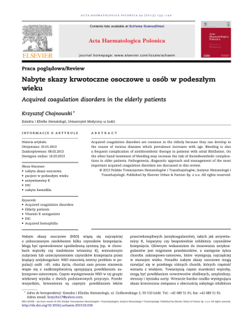 acta haematologica polonica 44 (2013) 135–142 Contents lists available at SciVerse ScienceDirect Acta Haematologica Polonica journal homepage: www.elsevier.com/locate/achaem Praca poglądowa/Review Nabyte skazy krwotoczne osoczowe u osób w podeszłym wieku Acquired coagulation disorders in the elderly patients Krzysztof Chojnowski * Katedra i Klinika Hematologii, Uniwersytet Medyczny w Łodzi informacje o artykule abstract Historia artykułu: Acquired coagulation disorders are common in the elderly because they can develop in Otrzymano: 25.01.2013 the course of various diseases which prevalence increases with age. Bleeding is also Zaakceptowano: 08.02.2013 a frequent complication of antithrombotic therapy in patients with atrial fibrillation. On Dostępne online: 16.03.2013 the other hand treatment of bleeding may increase the risk of thromboembolic complications in older patients. Pathogenesis, diagnostic approach and management of the most Słowa kluczowe: nabyta skaza osoczowa pacjent w podeszłym wieku important acquired coagulation disorders are discussed in this review. © 2013 Polskie Towarzystwo Hematologów i Transfuzjologów, Instytut Hematologii i Transfuzjologii. Published by Elsevier Urban & Partner Sp. z o.o. All rights reserved. antywitaminy K DIC nabyta hemofilia Keywords: Acquired coagulation disorders Elderly patients Vitamin K antagonists DIC Acquired hemophilia Nabyte skazy osoczowe (NSO) wiążą się najczęściej z jednoczesnym niedoborem kilku czynników krzepnięcia. Mogą być spowodowane upośledzoną syntezą (np. w chorobach wątroby czy niedoborze witaminy K), wzmożonym zużyciem lub unieczynnieniem czynników krzepnięcia przez krążący antykoagulant. NSO stanowią istotny problem w populacji osób >65. roku życia, chociaż sam proces starzenia wiąże się z nadkrzepliwością sprzyjającą powikłaniom zakrzepowo-zatorowym. Częste występowanie NSO w tej grupie wiekowej wynika z dwóch podstawowych przyczyn. Przede wszystkim, krwawienia są częstym powikłaniem leków przeciwkrzepliwych (antykoagulantów), takich jak antywitaminy K, heparyny czy bezpośrednie inhibitory czynników krzepnięcia. Głównym wskazaniem do stosowania antykoagulantów jest migotanie przedsionków, a następnie żylna choroba zakrzepowo-zatorowa, które występują najczęściej w starszym wieku. Ponadto nabyte skazy osoczowe mogą rozwijać się w przebiegu różnych chorób, których częstość wzrasta z wiekiem. Towarzyszą często marskości wątroby, mogą być powikłaniem nowotworów złośliwych, amyloidozy, stenozy i tętniaka aorty. Wreszcie bardzo rzadko występująca skaza krwotoczna związana z obecnością nabytego inhibitora * Adres do korespondencji: Katedra i Klinika Hematologii, ul. Ciołkowskiego 2, 93-510 Łódź. Tel.: +42 689 51 91; fax: +42 689 51 92. Adres email: [email protected]. 0001-5814/$ – see front matter © 2013 Polskie Towarzystwo Hematologów i Transfuzjologów, Instytut Hematologii i Transfuzjologii. Published by Elsevier Urban & Partner Sp. z o.o. All rights reserved. http://dx.doi.org/10.1016/j.achaem.2013.02.018 136 acta haematologica polonica 44 (2013) 135–142 czynnika VIII najczęściej występuje u osób powyżej 70. roku życia. Leczenie NSO u osób w starszym wieku jest często trudne, ponieważ skaza krwotoczna może nakładać się na zwiększone ryzyko powikłań zakrzepowo-zatorowych, Zarówno odstawienie leków przeciwzakrzepowych, jak i stosowanie leków przeciwkrwotocznych może prowadzić do rozwoju tych powikłań. Krwawienia w czasie stosowania doustnych antykoagulantów Doustne antykoagulanty z grupy antywitamin K (vitamin K antagonists; VKA) są stosowane w lecznictwie od lat 40. ubiegłego stulecia. W końcu lat 80. udowodniono ich skuteczność w zapobieganiu udaru mózgu związanego z niezastawkowym migotaniem przedsionków. Od tego czasu VKA są najczęściej stosowanymi lekami przeciwkrzepliwymi na świecie. Ocenia się, że około 1% populacji europejskiej otrzymuje VKA. Najważniejszymi i najczęstszymi działaniami niepożądanymi tej grupy leków są powikłania krwotoczne. Duże krwawienia w czasie leczenia VKA występują u 1–3% pacjentów w ciągu roku [1]. Najczęściej są związane z przedawkowaniem VKA i są objawem skazy krwotocznej osoczowej na tle niedoboru czynników krzepnięcia II, VII, IX i X, do syntezy których konieczna jest witamina K. Część krwawień, zwłaszcza występujących w pierwszym miesiącu leczenia, jak również przy terapeutycznych stężeniach VKA we krwi (INR pomiędzy 2 a 3), jest związana z przyczynami miejscowymi, a antykoagulanty je ujawniają. Najczęściej występują krwawienia z przewodu pokarmowego (34% wszystkich krwawień), które są jednocześnie najczęstszą przyczyną krwawień zagrażających życiu w czasie leczenia VKA. Częste są również krwawienia z układu moczowego, nosogardzieli i do tkanek miękkich. Znacznie rzadziej występują krwawienia śródczaszkowe, takie jak udary krwotoczne mózgu i krwiaki nadtwardówkowe, ale są one obarczone największą śmiertelnością. Występują z częstością 0,3–0,6% rocznie w populacji o średniej wieku 70 lat i są obarczone śmiertelnością wynoszącą 23–60% [2]. Głównym czynnikiem ryzyka krwawień jest intensywność leczenia, a więc wysoki INR, który odzwierciedla nasilenie zmian w układzie krzepnięcia pod wpływem VKA. Względne ryzyko krwawienia jest 2,7-krotnie większe, jeżeli INR jest pomiędzy 3 a 5 w stosunku do zakresu terapeutycznego, natomiast ponad 20-krotnie większe, gdy INR utrzymuje się powyżej 5 [3]. Krwawienia występują częściej w początkowym okresie leczenia VKA. Ryzyko wystąpienia krwawienia w pierwszym miesiącu leczenia wynosi 4%, podczas gdy w następnych miesiącach 0,4%. Te wczesne powikłania są zazwyczaj związane z nierozpoznanymi lub bezobjawowymi uszkodzeniami ściany naczyniowej. Dołączające się do tego upośledzenie układu krzepnięcia