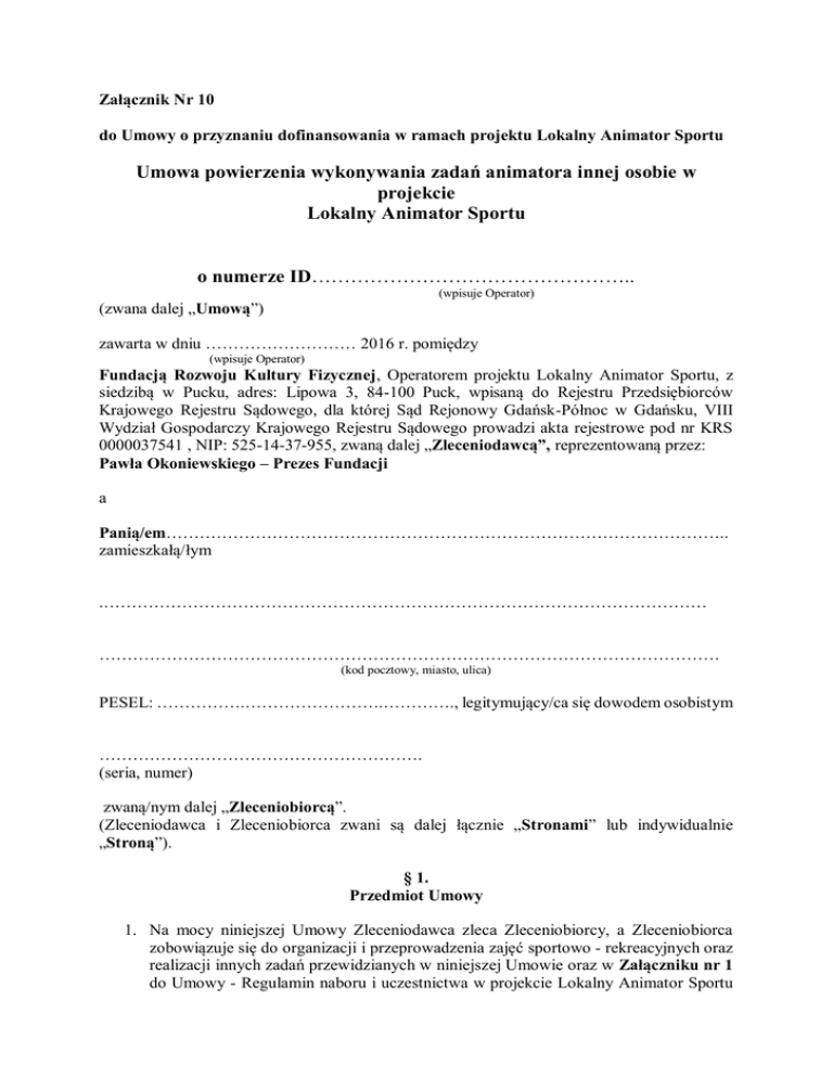 Załącznik Nr 10 do Umowy o przyznaniu dofinansowania w ramach projektu Lokalny Animator Sportu Umowa powierzenia wykonywania zadań animatora innej osobie w projekcie Lokalny Animator Sportu o numerze ID………………………………………….. (wpisuje Operator) (zwana dalej „Umową”) zawarta w dniu ……………………… 2016 r. pomiędzy (wpisuje Operator) Fundacją Rozwoju Kultury Fizycznej, Operatorem projektu Lokalny Animator Sportu, z siedzibą w Pucku, adres: Lipowa 3, 84-100 Puck, wpisaną do Rejestru Przedsiębiorców Krajowego Rejestru Sądowego, dla której Sąd Rejonowy Gdańsk-Północ w Gdańsku, VIII Wydział Gospodarczy Krajowego Rejestru Sądowego prowadzi akta rejestrowe pod nr KRS 0000037541 , NIP: 525-14-37-955, zwaną dalej „Zleceniodawcą”, reprezentowaną przez: Pawła Okoniewskiego – Prezes Fundacji a Panią/em……………………………………………………………………………………….. zamieszkałą/łym .……………………………………………………………………………………………… ………………………………………………………………………………………………… (kod pocztowy, miasto, ulica) PESEL: …………….…………………….…………., legitymujący/ca się dowodem osobistym …………………………………………………. (seria, numer) zwaną/nym dalej „Zleceniobiorcą”. (Zleceniodawca i Zleceniobiorca zwani są dalej łącznie „Stronami” lub indywidualnie „Stroną”). § 1. Przedmiot Umowy 1. Na mocy niniejszej Umowy Zleceniodawca zleca Zleceniobiorcy, a Zleceniobiorca zobowiązuje się do organizacji i przeprowadzenia zajęć sportowo - rekreacyjnych oraz realizacji innych zadań przewidzianych w niniejszej Umowie oraz w Załączniku nr 1 do Umowy - Regulamin naboru i uczestnictwa w projekcie Lokalny Animator Sportu 2. 3. 4. 5. jak również w Załączniku nr 3 do Umowy - Zakres obowiązków Lokalnego Animatora Sportu (zwanym dalej jako „Przedmiot Umowy”). Zajęcia sportowo-rekreacyjne, o których mowa w ust. 1 powyżej, Zleceniobiorca przeprowadzi na boisku sportowym wybudowanym w ramach projektu „Moje Boisko Orlik 2012”, zlokalizowanym w…………………………., ul. ……………………………………. - zwanym dalej „Orlikiem” oraz innych obiektach sportowych, których dotyczy wniosek złożony przez jednostkę samorządu terytorialnego będącą właścicielem Orlika. Zajęcia rekreacyjno-sportowe organizowane i przeprowadzane będą przez Zleceniobiorcę, w okresie od dnia …………………….. 2016 r. do dnia ……………………1 2016 r, w łącznym wymiarze …..… godzin.2 Zleceniobiorca zobowiązuje się do przeprowadzania zajęć sportowo – rekreacyjnych na Orliku lub innych obiektach sportowych wymiarze minimum 40 / 80 godzin zajęć miesięcznie 3 zgodnie z wytycznymi Operatora Zleceniobiorca ma możliwość wyboru godzin, w jakich będzie wykonywać obowiązki określone Umową, i tym samym nie jest on podporządkowany Zleceniodawcy co do wykonywania zadań pod jego nadzorem. § 2. Portal www.naszorlik.pl 1. Portal internetowy www.naszorlik.pl (zwany dalej również „Portalem”) stanowi: 1) narzędzie ułatwiające Zleceniobiorcy komunikację z użytkownikami Orlika w zakresie zajęć sportowo-rekreacyjnych; 2) narzędzie służące do dokonywania rozliczeń pomiędzy Zleceniodawcą a Zleceniobiorcą w zakresie zadań wykonywanych przez Zleceniobiorcę; 3) narzędzie współpracy i komunikacji pomiędzy Zleceniobiorcą i Zleceniodawcą. 2. Zleceniobiorca zobowiązany jest w szczególności do: 1) zapoznawania się z komunikatami i powiadomieniami, przesyłanymi Zleceniobiorcy przez Zleceniodawcę za pośrednictwem Portalu; 2) dokonania za pośrednictwem Portalu określonych w § 3. Umowy czynności niezbędnych dla rozliczenia zadań wykonanych przez Zleceniobiorcę oraz wypłaty należnego z tego tytułu Wynagrodzenia; 3) prowadzenia kalendarza, poprzez zamieszczanie w nim z odpowiednim wyprzedzeniem informacji o prowadzonych zajęciach, i regularnego go aktualizowania. § 3. Wynagrodzenie 1. Z tytułu prawidłowego wykonania zadań określonych w § 1 niniejszej umowy Zleceniobiorcy przysługuje wynagrodzenie ryczałtowe w kwocie brutto ………….. 4 (dalej jako „Wynagrodzenie”). 2. Kwota, o której mowa w ust. 1 powyżej, obejmuje odpowiednie należności odprowadzane do Zakładu Ubezpieczeń Społecznych oraz Urzędu Skarbowego, i podlega pomniejszeniu o te należności przed jej wypłatą Zleceniobiorcy. 3. W przypadku, gdy w danym miesiącu liczba godzin zajęć sportowo-rekreacyjnych zorganizowanych i przeprowadzonych przez Zleceniobiorcę będzie mniejsza niż określona w § 1. ust. 4 Umowy, Zleceniobiorcy przysługiwać będzie Wynagrodzenie w 1 Wypełnia Zleceniodawca. Wypełnia JST. 3 Niepotrzebne skreślić. 4 Wypełnia JST. 2 4. 5. 6. 7. 8. wysokości proporcjonalnej do liczby zorganizowanych i przeprowadzonych w tym miesiącu zajęć sportowo-rekreacyjnych. Podstawą do wypłaty Wynagrodzenia będą rachunki, wystawione w oparciu o zaakceptowane przez będącą właścicielem Orlika Jednostkę Samorządu Terytorialnego raporty, dokumentujące wykonywanie przez Zleceniobiorcę określonych Umową zadań w danych miesiącach rozliczeniowych. Zleceniobiorca jest zobowiązany do generowania i przesyłania Jednostce Samorządu Terytorialnego będącej właścicielem Orlika, w formie elektronicznej raportów miesięcznych, o których mowa w ust. 4 powyżej, podlegających akceptacji tej Jednostki Samorządu Terytorialnego. Wygenerowanie raportu i przesłanie go Jednostce Samorządu Terytorialnego powinno nastąpić niezwłocznie po zakończeniu miesiąca kalendarzowego, którego dany raport dotyczy, jednak nie później niż do 3 dnia miesiąca następującego po miesiącu w którym były realizowane zadania w ramach niniejszej Umowy. Zlecen