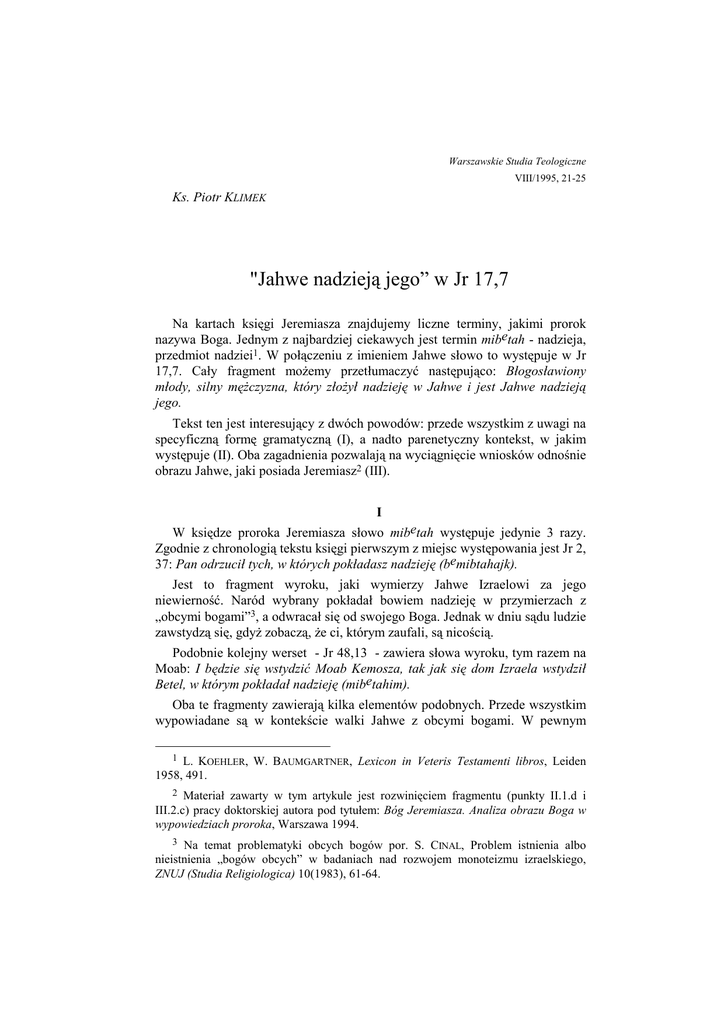 „JAHWE NADZIEJĄ JEGO” W JR 17,7