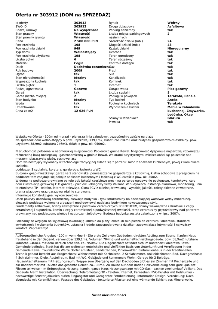 Oferta nr 303912 (DOM na SPRZEDAŻ) Id oferty SWO ID Rodzaj umowy Stan prawny Stan prawny gruntu Cena Powierzchnia Powierzchnia działki Typ domu Powierzchnia użytkowa Liczba pokoi Materiał Dach Rok budowy Ogród Stan nieruchomości Wyposażona kuchnia Liczba pięter Rodzaj ogrzewania Garaż Garaż (liczba miejsc) Stan budynku Woda Umeblowane Cena za m2 303912 Rynek 303912 Droga dojazdowa Na wyłączność Parking naziemny Własność Liczba miejsc parkingowych Własność naziemnych 2 500 000 PLN Szerokość działki (mb.) 198 Długość działki (mb.) 949 Kształt działki Wolnostojący Ochrona 198 Teren ogrodzony 6 Teren strzeżony Cegła Kontrola dostępu Dachówka ceramiczna Gaz 2009 Prąd tak Siła Idealny Kanalizacja tak Kominek 1 Internet Gazowe Gorąca woda tak Liczba sypialni 2 Podłogi w pokojach Idealny Typ kuchni tak Podłogi w kuchniach tak Wyposażenie kuchni 12 626 PLN Sciany w łazienkach Piwnica Wtórny Asfaltowa tak 2 24 43 Nieregularny tak tak tak tak tak tak tak tak tak tak Piec gazowy 5 Terakota, Panele Aneks Terakota Meble w zabudowie kuchennej, Zmywarka, Lodówka, Okap Glazura tak Wyjątkowa Oferta - 100m od morza! - pierwsza linia zabudowy, bezpośrednie zejście na plażę. Na sprzedaż dom wolno-stojący o pow. użytkowej 139,1m2, kubaturze 704m3 oraz budynek gospodarczo-mieszkalny. pow. użytkowa 58,9m2 kubatura 246m3, działa o pow. ok. 950m2. Nieruchomość położona w nadmorskiej miejscowości Pobierowo gmina Rewal. Miejscowość dysponuje najbardziej rozwiniętą i różnorodną bazą noclegową i gastronomiczną w gminie Rewal. Walorami turystycznymi miejscowości są: położenie nad morzem, piaszczyste plaże, sosnowe lasy. Dom wolnostojący wykonany w technologii tradycyjnej składa się z parteru: salon z aneksem kuchennym, pokoj z kominkiem, łazienka. poddasze: 3 sypialnie, korytarz, garderoba, łazienka z WC. Budynek gosp-mieszkalny: garaż na 2 stanowiska, pomieszczenie gospodarcze z kotłownią, klatka schodowa z przejściem na poddasze tam znajduje się pokój z aneksem kuchennym i łazienką z WC całość o pow. ok. 35m2. W domu na podłodze drewniane panele bdb jakości częściowo gres - na parterze ogrzewanie podłogowe, kominkowe, cały dom z instalacją grzewczą C.O gazową - piec dwu obiegowy firmy Vaillant. W budynkach instalacja alarmowa, monitoring, linia telefoniczna TP - telefon, internet, telewizja. Okna PCV z okleiną drewnianą - wysokiej jakości, rolety okienne zewnętrzne, brama wjazdowa oraz garażowa zdalnie sterowana. Informacje konstrukcyjne, wykończeniowe: Dach pokryty dachówką ceramiczną, elewacja budynku - tynk strukturalny na docieplającej warstwie wełny mineralnej, elewacja poddasza wykonana z boazerii modrzewiowej nadająca budynkom nowoczesnego stylu. Fundamenty żelbetowe, ściany zewnętrzne z pustaków ceramicznych POROTHERM, ściany wewnętrzne i działowe z cegły ceramicznej i suporeksu, komin z cegły ceramicznej o podwyższonej trwałości, strop ceramiczny gęstożebrowy nad parterem, drewniany nad poddaszem, wieńce i nadproża - żelbetowe. Budowa budynku została zakończona w lipcu 2007r. Polecamy ze względu na wyjątkową lokalizację 100min do plaży, około 10 min pieszo do centrum Pobierowa, standard wykończenia i wykonania budynków, ustawną i ładnie zagospodarowaną działkę - zapewniającą intymności i najwyższy komfort. Zapraszamy! _____ Außergewöhnliche Angebot - 100 m vom Meer! - Die erste Zeile von Gebäuden, direkten Abstieg zum Strand. Kaufen Haus freistehend in der Gegend. verwendbar 139,1m2, Volumen 704m3 und wirtschaftlich-Wohngebäude. pow. 58,9m2 nutzbare kubische 246m3, mit dem Bereich arbeiten. ca.. 950m2. Die Liegenschaft befindet sich im Küstenort Pobierowo Rewal Gemeinde befindet. Stadt hat die am weitesten entwickelte und vielfältige Basis von Unterkunft und Verpflegung in der Gemeinde Rewal. Touristische Werte Dörfer am Meer, Sandstränden, Pinienwälder. Einfamilienhaus in der traditionellen Technik gebaut besteht aus Erdgeschoss: Wohnzimmer mit Kochnische, 2 Schlafzimmer, Ankleidezimmer, Bad. Dachgeschoss: 4 Schlafzimmer, Diele, Abstellraum, Bad mit WC. Gebäude und kommunale Wohn: Garage für 2 Beiträge, Hauswirtschaftsraum mit Heizungsraum, Treppe zum Übergang auf den Dachboden gibt es ein Zimmer mit Küchenzeile und ein Badezimmer mit Toilette das gesamte Gebiet. ca.. 35m2. Zu Hause auf dem Boden Holzverkleidung sehr gute Qualität Fliesen teilweise - im Erdgeschoss Heizung, Kamin, ganze Haus Heizungsanlage mit CO-Gas - backen zwei umlauf Vaillant. Das Gebäude Alarm Installation, Überwachung, Telefonleitung TP - Telefon, Internet, Fernsehen. PVC-Fenster mit Holzfurnier hochwertige Fenster Jalousien außen Eingangstor und Garagentor-Fernbedienung. Information Design, Veredelung: Dach abgedeckt mit Keramikfliesen, Fassade des Gebäudes - texturierte Pflaster auf eine wärmende Schicht aus Mineralwolle, Świat nieruchomości Dachfassade aus Lärchenholzverkleidung geeignet Gebäude des modernen Stil. Stahlbeton Fundamente, Außenwände von hohlen Keramik POROTHERM, Innenwände und Trennwände aus keramischen Ziegeln und suporeksu, ein Stapel von keramischen Ziegeln mit verbesserter Haltbarkeit, der Boden ist Keramik gęstożebrowy über dem Erdgeschoss, die hölzernen Dachboden, Kränze und Stürzen - Stahlbeton. Bau des Gebäudes wurde im Juli 2007 abgeschlossen. Wir empfehlen aufgrund der einzigartigen Lage 100min zum Strand, etwa 10 Minuten zu Fuß zum Zentrum von Pobierowo, Standard und Performance von Gebäuden, angelegt und schön angelegten Grundstück - Gewährleistung der Privatsphäre und Komfort. Herzlich Willkommen! Dane maklera Arka Nieruchomości tel. tel. 91 433 59 85, tel. 91 433 52 49, tel. tel. 512 080 803, tel. 508 382 979 Świat nieruchomości Powered by TCPDF (www.tcpdf.org)