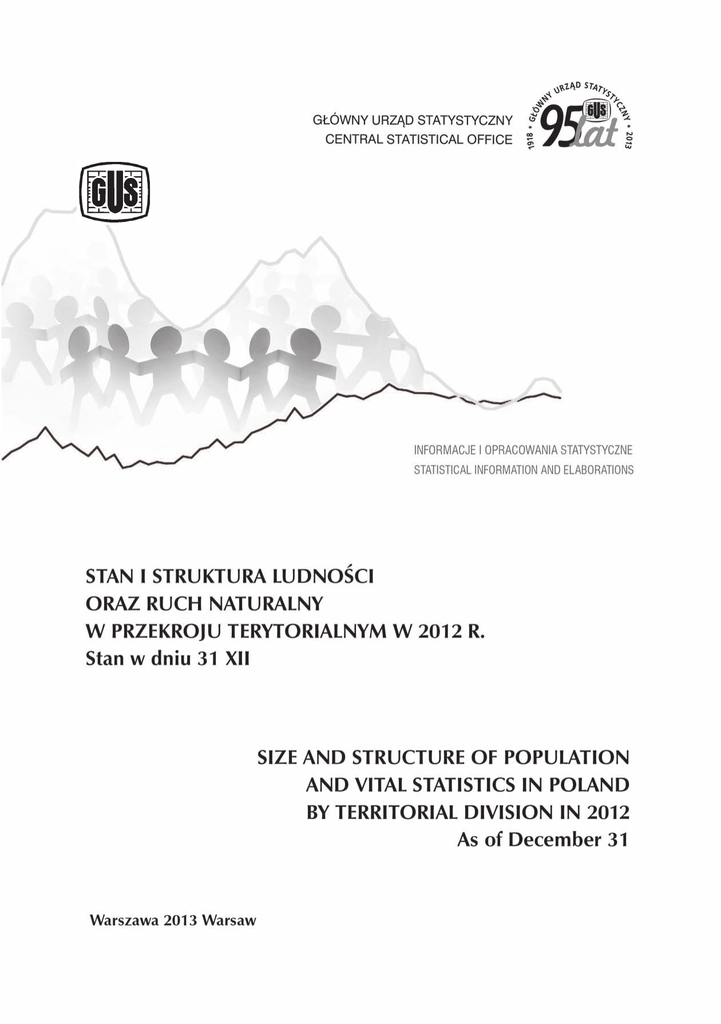 Opracowanie publikacji Preparation of the publication Kierujący Supervisor GUS, Departament Badań Demograficznych i Rynku Pracy CSO, Demographic Surveys and Labour Market Department Lucyna Nowak – zastępca dyrektora departamentu deputy director Autorzy opracowania Authors Joanna Stańczak, Agnieszka Znajewska Prace projektowe i przetwarzanie danych Data processing Ośrodek Informatyki Statystycznej, US w Olsztynie Statistical Computing Centre Statistical Office in Olsztyn Projekt okładki Cover design Lidia Motrenko-Makuch Druk i oprawa Printing and binding Zakład Wydawnictw Statystycznych Statistical Publishing Establishment ISSN 2083-3342 Publikacja dostępna na CD oraz w Internecie – www.stat.gov.pl Publication available on CD-ROM and at website – www.stat.gov.pl Przedmowa Publikacja pt. „Stan i struktura ludności oraz ruch naturalny w przekroju terytorialnym w 2012 r.” jest kolejnym opracowaniem, wydawanym przez Główny Urząd Statystyczny w cyklach półrocznych (według stanu w dniu 30.06 i 31.12 każdego roku), zawierającym informacje o liczbie i strukturze ludności oraz ruchu naturalnym i migracjach. Opracowanie jest kontynuacją – wychodzącej do 2009 roku – publikacji pod tytułem „Ludność. Stan i struktura w przekroju terytorialnym”. Od połowy lat siedemdziesiątych pozycja ukazywała się w serii „Materiały źródłowe”, od 2005 r. (począwszy od danych wg stanu w dniu 31.12.2004 r.) zmieniono serię wydawniczą na „Informacje i opracowania statystyczne”. Bieżące opracowanie przedstawia wyniki bilansu ludności, który został sporządzony według stanu w dniu 31.12.2012 r. dla wszystkich jednostek podziału administracyjnego kraju (województwa, powiaty oraz gminy w przekroju dla miast i terenów wiejskich). Dodatkowo bilans ludności został wyprowadzony dla jednostek podziału statystycznego, tj. dla regionów (NTS 1) i podregionów (NTS 3). Bilans opracowano przy przyjęciu za bazę wyjściową wyniki Narodowego Spisu Powszechnego Ludności i Mieszkań z dnia 31.03.2011 r. Opracowanie zawiera: informacje o liczbie i strukturze ludności w podziale na płeć i wiek według stanu w dniu 31.12.2012 r. Dane zestawiono w 17 tablicach wynikowych, 13 tablic wydano w formie zarówno książkowej jak i elektronicznej, natomiast 4 – wyłącznie na CD ze względu na ich dużą objętość; w wersji elektronicznej podane zostały również symbole terytorialne powiatów i gmin. Dodatkowo w wersji elektronicznej rozszerzono zakres tablicy 6 – „Ludność według płci, grup wieku i województw” o pojedyncze roczniki wieku i funkcjonalne grupy; informacje o ruchu naturalnym ludności (małżeństwa, rozwody, separacje, urodzenia, zgony) oraz o migracjach na pobyt stały (definitywnych) i czasowy (wewnętrznych i zagranicznych), a także wybrane wskaźniki demograficzne dotyczące 2012 r. (4 tablice wynikowe); dane o ludności i ruchu naturalnym w Polsce na tle wybranych krajów w 2011 r. (1 tablica wynikowa); analizę zmian rozwoju demograficznego Polski do 2012 r., z podkreśleniem zmian w ostatnim dziesięcioleciu. Szeroki zakres informacji o liczbie i strukturze ludności oraz ruchu naturalnym i migracjach ludności w Polsce dostępny jest również na stronie internetowej GUS www.stat.gov.pl. – w Bazie Demografia http://demografia.stat.gov.pl/bazademografia/ oraz Banku Danych Lokalnych. Przekazując publikację wyrażamy nadzieję, że spełni ona oczekiwania Odbiorców. Jednocześnie prosimy o nadsyłanie uwag, komentarzy, które postaramy się uwzględnić w kolejnych edycjach. Agnieszka Zgierska Dyrektor Departamentu Badań Demograficznych i Rynku Pracy Warszawa, maj 2013 r. Preface Publication entitled “Size and structure of population and vital statistics by territorial division in 2012” is the successive study in the series published by the Central Statistical Office twice a year (population as of June 30 and December 31), contains the information on the size and structure of population and vital event and migration statistics. Elaboration is the continuation of the study under the title “Population. Size and structure by territorial division” coming out up to 2009. Since the middle of 1970s the publication was part of the “Source materials” series, and since 2005 (starting with the data as of December 31, 2004) the series has been changed to “Statistical Information and Elaborations”. This study presents the results of population balance made as of December 31, 2012 for all units of administrative division of Poland (voivodships, powiats and gminas, by urban and rural areas). Additionally the population balance data how been calculated for units of statistical division, i.e. for regions (NUTS 1) and subregions (NUTS 3). The balance was made taking as the basis for calculations the results of the Population and Housing Census held on March 31, 2011. The study includes: information on the size and structure of population by sex and age as of December 31, 2012. The data were compiled in 17 result tables. 13 of them in both book and electronic form, and 4 tables only on CD – due to their large volume (tables 14-17); in electronic version territorial symbols of powiats and gminas are also presented. Additionally in electronic form more information was given at table 6 -“Population by sex, age groups and voivodships” at single years of age and functional groups. vital statistics (marriages, divorces, legal separations, births, deaths) and migration for permanent (definitive) and temporary residence (internal and international) and selected demographic indicators, for 2012 (4 result tables); data about population and vital statistics in comparison with selected countries in 2011. (1 result table); analysis of demographic development of Poland until 2012., with stressing changes in the last decade. A board set of information on size and structure of population, vital statistics of population and migration of popu