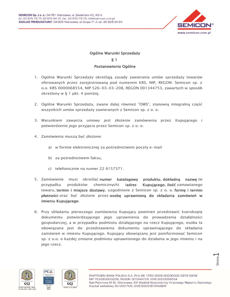 Ogólne Warunki Sprzedaży §1 Postanowienia Ogólne 1. Ogólne Warunki Sprzedaży określają zasady zawierania umów sprzedaży towarów oferowanych przez zarejestrowaną pod numerem KRS, NIP, REGON: Semicon sp. z o.o. KRS 0000068554, NIP 526-03-03-208, REGON 001344753, zawartych w sposób określony w § 1 pkt. 4 poniżej. 2. Ogólne Warunki Sprzedaży, zwane dalej również ”OWS”, stanowią integralną część wszystkich umów sprzedaży zawieranych z Semicon sp. z o. o. 3. Warunkiem zawarcia umowy jest złożenie zamówienia przez Kupującego i potwierdzenie jego przyjęcia przez Semicon sp. z o. o. 4. Zamówienia muszą być złożone: a) w formie elektronicznej za pośrednictwem poczty e-mail b) za pośrednictwem faksu, c) telefonicznie na numer 22 6157371. 5. Zamówienie przypadku musi określać numer produktów katalogowy chemicznych) iadres produktu, dokładną nazwę (w Kupującego, ilość zamawianego towaru, termin i miejsce dostawy, uzgodnione z Semicon sp. z o. o. formę i termin płatności oraz być złożone przez osobę uprawnioną do składania zamówień w imieniu Kupującego. 6. Przy składaniu pierwszego zamówienia Kupujący powinien przedstawić kserokopię dokumentu potwierdzającego jego uprawnienia do prowadzenia działalności gospodarczej, a w przypadku podmiotu działającego na rzecz Kupującego, osoba ta obowiązana jest do przedstawienia dokumentu uprawniającego do składania zamówień w imieniu Kupującego. Kupujący obowiązany jest poinformować Semicon sp. z o.o. o każdej zmianie podmiotu uprawnionego do działania w jego imieniu i na Strona 1 jego rzecz. 7. Semicon sp. z o. o. przyjmuje zamówienia w dniach od poniedziałku do piątku w godzinach od 8:00 do 16:00. Zamówienia złożone po godzinie 12:00 uważa się za złożone w następnym dniu roboczym. 8. Złożenie zamówienia przez Kupującego lub podmiot uprawniony do działania w jego imieniu jest równoznaczne ze złożeniem oświadczenia o akceptacji OWS Semicon sp. z o. o. OWS dostępne są na stronie internetowej www.semicon.com.pl (zakładka O firmie) oraz na żądanie Kupującego w siedzibie Semicon sp. z o.o. Semicon sp. z o.o. oraz Kupujący wyłączają odpowiedzialność z tytułu rękojmi, o ile Kupującym nie jest konsument. §2 Oferty, wzorce i ceny 1. Oferty, reklamy, katalogi, broszury, cenniki i inne ogłoszenia o towarach oferowanych przez Semicon sp. z o. o. mają charakter wyłącznie informacyjny i nie stanowią oferty w rozumieniu Kodeksu cywilnego. Wzorce i próbki wystawiane przez Semicon sp. z o. o. mają wyłącznie charakter materiałów poglądowych i wystawowych. 2. Ceny zawarte w cenniku produktów są zalecanymi cenami sprzedaży bez podatku VAT i na warunkach EXW (INCOTERMS 2010), wiążącymi Strony po przeprowadzeniu indywidualnych uzgodnień. Strony mogą w drodze odrębnej umowy uzgodnić inne ceny sprzedaży. Semicon sp. z o. o. zastrzega sobie prawo zmiany cen m.in. w wyniku zmian kursów, cen surowców, transportu, energii, podatków. §3 Warunki płatności 1. Zapłata za otrzymany towar następuje w terminie i kwocie określonej na fakturze VAT uprzednio wystawionej przez Semicon sp. z o.o. 2. Płatności dokonuje się w walucie umieszczonej na fakturze przelewem na jedno z kont bankowych podanych na fakturze, w zależności od tego, w jakiej walucie została wystawiona faktura. Jeżeli podstawą ustalenia ceny sprzedaży jest cena wyrażona w walucie obcej, kursem przeliczania tej waluty jest średni kurs sprzedaży w NBP z dnia poprzedzającego dzień wystawienia faktury. 3. Kupujący staje się właścicielem towaru w chwili całkowitej zapłaty za wcześniej zamówiony towar. Jeżeli Kupujący nie dokona zapłaty w określonym terminie, Strona oraz może żądać odszkodowania w wysokości poniesionych strat z tego tytułu. 2 wówczas Semicon sp. z o. o. zażąda od Kupującego zwrotu towarów niezapłaconych 4. Datą wykonania świadczenia przez Kupującego jest data uznania środków na rachunku bankowym Semicon sp. z o. o. 5. Semicon sp. z o. o. ma prawo żądać przedpłaty za towar w całości lub częściowo dla zabezpieczenia swojej dostawy. 6. W przypadku nieterminowej realizacji płatności Semicon sp. z o. o. jest uprawniona do dochodzenia, obok należności głównej i odsetek za opóźnienie, również zwrotu kosztów sądowych, egzekucyjnych oraz zastępstwa procesowego. Ponadto Semicon sp. z o. o. jest uprawniona do dochodzenia zwrotu kosztów związanych z windykacją tej należności. 7. Kupującemu nie służy wobec Semicon sp. z o. o. prawo złożenia oświadczenia o potrąceniu, chyba że Kupujący jest konsumentem w rozumieniu ustawy o prawach konsumenta z dnia 30 maja 2014 r. 8. Wstrzymanie jakiejkolwiek płatności przez Kupującego ze względu na reklamację jest niedopuszczalne, chyba że reklamacja została wcześniej uznana przez Semicon sp. z o.o., która określiła wysokość zatrzymanej kwoty. §4 Warunki dostawy 1. Dostawa towaru zakupionego przez Kupującego realizowana jest na podstawie złożonego przez niego zamówienia i potwierdzonego przez Semicon sp. z o.o. Zamówiony towar może być dostarczony do Kupującego transportem własnym Semicon sp. z o.o., za pośrednictwem firmy kurierskiej, a także odbierany osobiście w siedzibie firmy Semicon sp. z o.o. przy ul. Zwoleńskiej 43/43a w Warszawie, po wcześniejszym uzgodnieniu terminy odbioru. 2. Jeżeli odbioru towaru z siedziby Semicon Sp. z o. o. dokonuje osoba wysyłana przez Kupującego, winna ona posiadać pisemne upoważnienie do odbioru towaru i faktury, chyba że odbioru dokonuje właściciel firmy lub osoba wpisana do Krajowego Rejestru Sądowego, jako upoważniona do reprezentowania Kupującego. 3. Dostawy realizowane są za pośrednictwem kuriera DHL oraz UPS. Jeżeli Kupujący zleci dostarczenie zamówionego towaru innemu przewoźnikowi niż ww., na własny koszt, Kupujący zobowiązany jest zapewnić transport zamówionego towaru zgodnie z z
