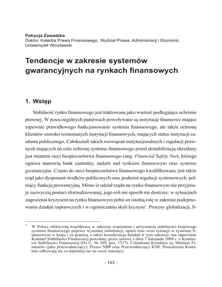 Patrycja Zawadzka Doktor, Katedra Prawa Finansowego, Wydział Prawa, Administracji i Ekonomii, Uniwersytet Wrocławski Tendencje w zakresie systemów gwarancyjnych na rynkach finansowych 1. Wstęp Stabilność rynku finansowego jest traktowana jako wartość podlegająca ochronie prawnej. W poszczególnych państwach powoływane są instytucje finansowe mające zapewnić prawidłowego funkcjonowanie systemu finansowego, ale także ochronę klientów szeroko rozumianych instytucji finansowych, mających status instytucji zaufania publicznego. Całokształt takich rozwiązań instytucjonalnych i regulacji prawnych mających na celu ochronę systemu finansowego przed destabilizacją określany jest mianem sieci bezpieczeństwa finansowego (ang. Financial Safety Net), którego ogniwa stanowią bank centralny, nadzór nad rynkiem finansowym oraz systemy gwarancyjne. Często do sieci bezpieczeństwa finansowego kwalifikowany jest także rząd jako dysponent środków publicznych oraz podmiot regulacji systemowych, pełniący funkcję prewencyjną. Mimo iż udział rządu na rynku finansowym nie przyjmuje zazwyczaj postaci sformalizowanej, jego roli nie sposób nie dostrzec: w sytuacjach zagrożenia kryzysem na rynku finansowym pełni on istotną rolę w zakresie podejmowania działań naprawczych i w ograniczaniu skali kryzysu1. Procesy globalizacji, li- 1 W Polsce efektywną współpracę w zakresie wspierania i utrzymania stabilności krajowego systemu finansowego poprzez wymianę informacji, opinii oraz ocen sytuacji w systemie finansowym w kraju i za granicą, a także koordynację działań w tym zakresie, ma zapewniać Komitet Stabilności Finansowej powołany przez ustawę z dnia 7 listopada 2008 r. o Komitecie Stabilności Finansowej (Dz.U. Nr 209, poz. 1317). Członkami Komitetu są: Minister Finansów (jako przewodniczący), Prezes NBP oraz Przewodniczący KNF. Posiedzenia Komitetu odbywają się co najmniej raz na sześć miesięcy. - 143 - Patrycja Zawadzka beralizacji i deregulacji zachodzące na światowych rynkach finansowych, wraz z towarzyszącym im postępem technologicznym, wpłynęły na uznanie stabilności finansowej za dobro publiczne2. W praktyce systemy gwarancyjne, będące jednym z ogniw sieci bezpieczeństwa finansowego, odnoszą się w przeważającej mierze do banków gromadzących większość nadwyżek finansowych społeczeństwa i których działalność stanowi potencjalną płaszczyznę rozprzestrzeniania się ryzyka w systemie finansowym. Nie można jednak pominąć roli systemów gwarancyjnych działających w innych sektorach rynku finansowego – w sektorze ubezpieczeń i w sektorze usług inwestycyjnych. Bezpośrednim powodem tworzenia systemów gwarancyjnych jest ochrona klientów szeroko rozumianych instytucji finansowych, które zwykło się określać mianem instytucji zaufania publicznego. Zaufanie klientów jest bowiem jednym z największych aktywów tych instytucji finansowych. Systemy gwarancyjne pełnią funkcję zarządzania kryzysowego, ale także funkcję prewencyjną polegającą na zapobieganiu destabilizacji na rynku finansowym. Regulacje Unii Europejskiej oraz Rzeczypospolitej Polskiej w zakresie systemów gwarancyjnych na rynku finansowym – w sektorze bankowym, ubezpieczeniowym oraz usług inwestycyjnych – nie są jednolite, wszystkie jednak przejawiają charakterystyczne cechy odzwierciedlające specyfikę sektorową. 2. Sektor bankowy Funkcjonujące na świecie systemy gwarantowania depozytów można podzielić na dwie kategorie: systemy gwarantowania depozytów w znaczeniu wąskim (ang. paybox) oraz systemy gwarantowania depozytów w znaczeniu szerokim (ang. risk minimizer). Działalność pierwszych ograniczona jest jedynie do wypłaty depozytów gwarantowanych w przypadku upadłości instytucji kredytowej, zadaniem drugich zaś jest dodatkowo zapewnienie pomocy finansowej oraz 2 A. Jurkowska-Zeidler, Bezpieczeństwo rynku finansowego w świetle prawa Unii Europejskiej, Warszawa 2008, s. 12. - 144 - Patrycja Zawadzka umożliwienie podejmowania działań naprawczych instytucjom kredytowym o zagrożonej wypłacalności, w celu niedopuszczenia do ich upadłości, a także ewentualnego poniesienia konsekwencji upadłości określonego banku przez inne podmioty na rynku finansowym. Warto podkreślić, że istnienie systemu gwarantowania depozytów jako dodatkowej instytucji chroniącej system finansowy przed destabilizacją, oprócz ewidentnych korzyści, łączy się również z pewnym kosztem – istnienie siatki bezpieczeństwa finansowego prowadzi, poprzez zwiększone prawdopodobieństwo wystąpienia zjawiska „pokusy nadużycia” (ang. moral hazard), do osłabienia dyscypliny rynkowej3. Podstawowe standardy w zakresie ochrony depozytów wyznaczyła Dyrektywa 94/19/WE Parlamentu Europejskiego i Rady z dnia 30 maja 1994 r. w sprawie systemów gwarancji depozytów4, wprowadzając obowiązek minimalnej harmonizacji w zakresie fundamentalnych aspektów dotyczących systemów gwarancji depozytów, takich jak: obowiązek utworzenia w każdym państwie co najmniej jednej instytucji gwarantującej depozyty (poprzednie zalecenie stało się bezwzględnym wymogiem dla państw członkowskich Wspólnoty Europejskiej); przynależność do systemu; zakres przedmiotowy i podmiotowy ochrony; minimalny poziom limitu gwarancyjnego o równowartość 20 tys. euro (ECU); warunki i terminy ubiegania się klientów o wypłatę świadczeń gwarancyjnych, w tym dążenie do zapewnienia w jak najkrótszym czasie wypłaty środków gwarantowanych. Podkreślono, że celem działania systemów gwarantowania jest dbałość o stabilność systemu bankowego, a koszty finansowania systemu muszą być zasadniczo ponoszone przez instytucje kredytowe, a z drugiej strony – zdolność finansowania tych systemów musi pozostawać w odpowiednim stosunku do ich zobowiązań. Dyrektywa 94/19/WE przyznała państwom członkowskim dość szerokie możliwości wyłącze
