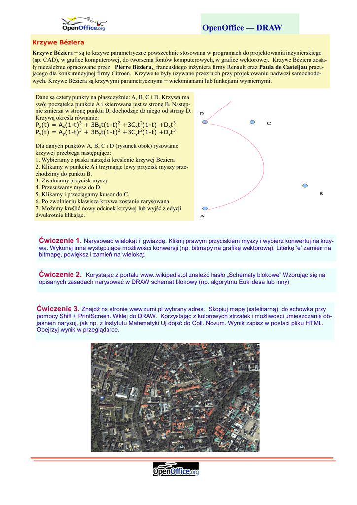 OpenOffice — DRAW Krzywe Béziera Krzywe Béziera – są to krzywe parametryczne powszechnie stosowana w programach do projektowania inŜynierskiego (np. CAD), w grafice komputerowej, do tworzenia fontów komputerowych, w grafice wektorowej. Krzywe Béziera zostały niezaleŜnie opracowane przez Pierre Béziera, francuskiego inŜyniera firmy Renault oraz Paula de Casteljau pracującego dla konkurencyjnej firmy Citroën. Krzywe te były uŜywane przez nich przy projektowaniu nadwozi samochodowych. Krzywe Béziera są krzywymi parametrycznymi – wielomianami lub funkcjami wymiernymi. Dane są cztery punkty na płaszczyźnie: A, B, C i D. Krzywa ma swój początek a punkcie A i skierowana jest w stronę B. Następnie zmierza w stronę punktu D, dochodząc do niego od strony D. Krzywą określa równanie: Px(t) = Ax(1-t)3 + 3Bxt(1-t)2 +3Cxt2(1-t) +Dxt3 Py(t) = Ay(1-t)3 + 3Byt(1-t)2 +3Cyt2(1-t) +Dyt3 Dla danych punktów A, B, C i D (rysunek obok) rysowanie krzywej przebiega następująco: 1. Wybieramy z paska narzędzi kreślenie krzywej Beziera 2. Klikamy w punkcie A i trzymając lewy przycisk myszy przechodzimy do punktu B. 3. Zwalniamy przycisk myszy 4. Przesuwamy mysz do D 5. Klikamy i przeciągamy kursor do C. 6. Po zwolnieniu klawisza krzywa zostanie narysowana. 7. MoŜemy kreślić nowy odcinek krzywej lub wyjść z edycji dwukrotnie klikając. D C B A Ćwiczenie 1. Narysować wielokąt i gwiazdę. Kliknij prawym przyciskiem myszy i wybierz konwertuj na krzywą. Wykonaj inne występujące moŜliwości konwersji (np. bitmapy na grafikę wektorową). Literkę ‘e’ zamień na bitmapę, powiększ i zamień na wielokąt. Ćwiczenie 2. Korystając z portalu www..wikipedia.pl znaleźć hasło „Schematy blokowe” Wzorując się na opisanych zasadach narysować w DRAW schemat blokowy (np. algorytmu Euklidesa lub inny) Ćwiczenie 3. Znajdź na stronie www.zumi.pl wybrany adres. Skopiuj mapę (satelitarną) do schowka przy pomocy Shift + PrintScreen. Wklej do DRAW. Korzystając z kolorowych strzałek i moŜliwości umieszczania objaśnień narysuj, jak np. z Instytutu Matematyki Uj dojść do Coll. Novum. Wynik zapisz w postaci pliku HTML. Obejrzyj wynik w przeglądarce.