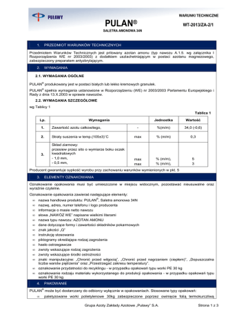 WARUNKI TECHNICZNE PULAN® WT-2013/ZA-2/1 SALETRA AMONOWA 34N 1. PRZEDMIOT WARUNKÓW TECHNICZNYCH Przedmiotem Warunków Technicznych jest prilowany azotan amonu (typ nawozu A.1.5. wg załącznika I Rozporządzenia WE nr 2003/2003) z dodatkiem uszlachetniającym w postaci azotanu magnezowego, zabezpieczony preparatem antyzbrylającym. 2. WYMAGANIA 2.1. WYMAGANIA OGÓLNE ® PULAN produkowany jest w postaci białych lub lekko kremowych granulek. ® PULAN spełnia wymagania ustanowione w Rozporządzeniu (WE) nr 2003/2003 Parlamentu Europejskiego i Rady z dnia 13.X.2003 w sprawie nawozów. 2.2. WYMAGANIA SZCZEGÓŁOWE wg Tablicy 1 Tablica 1 Lp. Wymagania Jednostka Wartość - %(m/m) 34,0 (-0,6) 1. Zawartość azotu całkowitego, 2. Straty suszenia w temp.(105±3)˚C max % (m/m) 0,3 3. Skład ziarnowy: przesiew przez sito o wymiarze boku oczek kwadratowych - 1,0 mm, - 0,5 mm, max max % (m/m), % (m/m), 5 3 Producent gwarantuje sypkość wyrobu przy zachowaniu warunków wymienionych w pkt. 5 3. ELEMENTY OZNAKOWANIA Oznakowanie opakowania musi być umieszczone w miejscu widocznym, pozostawać nieusuwalne oraz wyraźnie czytelne. Oznakowanie opakowania zawierać następujące elementy: • • • • • • • • • • • • • • • ® nazwa handlowa produktu: PULAN , Saletra amonowa 34N nazwę, adres, numer telefonu i logo producenta informacje o masie netto nawozu słowa „NAWÓZ WE” napisane wielkimi literami nazwa typu nawozu: AZOTAN AMONU dane dotyczące formy i zawartości składników pokarmowych znak jakości „Q” instrukcję stosowania piktogramy określające rodzaj zagroŜenia hasło ostrzegawcze zwroty wskazujące rodzaj zagroŜenia zwroty wskazujące środki ostroŜności znaki manipulacyjne: „Chronić przed wilgocią”, „Chronić przed nagrzaniem (ciepłem)”, „Dopuszczalna liczba warstw piętrzenia” oraz „Przestrzegać zakresu temperatury”. oznakowanie przydatności do recyklingu - w przypadku opakowań typu worki PE 30 kg oznakowanie rodzaju materiału wykorzystanego do produkcji opakowania - w przypadku opakowań typu worki PE 30 kg 4. PAKOWANIE ® PULAN moŜe być dostarczany do odbiorcy wyłącznie w opakowaniach. Stosowane typy opakowań: • paletyzowane worki polietylenowe 30kg zabezpieczone poprzez owinięcie folią termokurczliwą Grupa Azoty Zakłady Azotowe „Puławy” S.A. Strona 1 z 3 WARUNKI TECHNICZNE PULAN® WT-2013/ZA-2/1 SALETRA AMONOWA 34N • • „STRETCH”: kontenery elastyczne typu big bag 600kg inne opakowania po uzgodnieniu z odbiorcą. 5. PRZECHOWYWANIE ® PULAN naleŜy przechowywać jedynie w oryginalnych opakowaniach, w czystych, suchych i wentylowanych budynkach, zabezpieczonych przed dostępem osób nieupowaŜnionych i kradzieŜą. W magazynie saletry amonowej niedopuszczalne jest palenie tytoniu, prowadzenie prac spawalniczych, posługiwanie się otwartym płomieniem oraz przechowywanie materiałów, które mogą reagować z azotanem amonu lub są palne, tj np.: środki redukujące, tlenki metali, sproszkowane metale, alkalia, kwasy, substancje organiczne (tj.: słoma, oleje, smary). Chronić przed bezpośrednim działaniem promieni słonecznych i ogrzewaniem powyŜej 30ºC. Nie składować razem z innymi nawozami. W jednym pomieszczeniu magazynowym nie powinno się przechowywać więcej niŜ 300 t produktu. Liczba pomieszczeń w budynku magazynowym jest nieograniczona. Nawóz w opakowaniach nie przekraczających 50kg naleŜy przechowywać w stosach złoŜonych najwyŜej z dwunastu warstw, natomiast opakowania ® elastyczne z nawozem o masie nie przekraczającej 600kg najwyŜej w dwóch warstwach. PULAN przechowywać na podłoŜu wykonanym z materiałów niepalnych i zabezpieczyć przed wilgocią. Minimalne w odległości przechowywania stosów nie powinny być mniejsze niŜ 0,2m od ścian budynku i 1,5 m od źródeł ciepła. 6. TRANSPORT Produkt nie podlega przepisom RID i ADR - certyfikat klasyfikacyjny nr 001/IPO-BC/2011. 7. BADANIA 7.1. PROGRAM BADAŃ wg Tablicy 2. Tablica 2 Lp. Rodzaj badań Opis badań wg 1. Sprawdzenie wymagań ogólnych 7.4 2. Oznaczanie zawartość azotu całkowitego, 7.5. 3. Oznaczanie strat suszenia w temp.(105±3)˚C, 7.6. 4. Oznaczanie składu ziarnowego 7.7. 7.2. WIELKOŚĆ PARTII Za partię uwaŜa się jednorazową wysyłkę samochodu/wagonu do jednego odbiorcy pod warunkiem, Ŝe nie zawiera więcej niŜ 500t saletry amonowej. 7.3. POBÓR PÓBEK Próbki naleŜy pobierać zgodnie z normą PN-EN1482-1:2008 7.4. SPRAWDZENIE WYMAGAŃ OGÓLNYCH Zgodność z wymaganiami ogólnymi sprawdzić wzrokowo. 7.5. OZNACZANIE ZAWARTOŚCI AZOTU CAŁKOWITEGO Wykonać zgodnie z PN –C-87054:2000. 7.6. OZNACZANIE STRAT SUSZENIA W TEMPERATURZE (105±3)˚C Wykonać zgodnie z PN –C-87054:2000. 7.7. OZNACZANIE SKŁADU ZIARNOWEGO Wykonać zgodnie z PN –C-87083:1999 7.8. OCENA WYNIKÓW BADAŃ Grupa Azoty Zakłady Azotowe „Puławy” S.A. Strona 2 z 3 WARUNKI TECHNICZNE PULAN® WT-2013/ZA-2/1 SALETRA AMONOWA 34N ® Partię saletry amonowej - PULAN naleŜy uznać za zgodną z WT, jeŜeli wyniki badań zawartych w w/w. odpowiadają wymaganiom w niej określonym. Zgodność badań potwierdzona jest Świadectwem Kontroli Jakości. 8. ODWOŁANIA • PN-C-87054:2000 Nawozy sztuczne. Prosty nawóz azotowy o wysokiej zawartości azotu zawierający azotan amonu. Saletra amonowa. • PN-C-87083:1999 Nawozy sztuczne - Proste nawozy azotowe o wysokiej zawartości azotu, zawierające azotan amonu - Oznaczanie składu ziarnowego. • PN-EN1482-1:2008 Nawozy i środki wapnujące. Pobieranie i przygotowanie próbek. Część 1: Pobieranie próbek • Rozporządzenie (WE) nr 2003/2003 Parlamentu Europejskiego i Rady z dnia 13 października 2003 w sprawie nawozów. • Rozporządzenie Parlamentu Europejskiego i Rady (WE) nr 1272/2008 z dnia 16 grudnia 2008 r. w sprawie klasyfikacji, oznakowania i pakowania substancji i mieszanin, zmieniające i uchylające dyrektywy 67/548/EWG i 1999/45/WE oraz zmieniające rozporządzeni