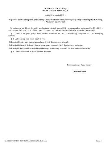 UCHWAŁA NR V/15/2015 RADY GMINY NIEBORÓW z dnia 30 stycznia 2015 r. w sprawie uchwalenia planu pracy Rady Gminy Nieborów oraz planów pracy stałych komisji Rady Gminy Nieborów na 2015 rok Na podstawie art. 18 ust. 1 i art.21 ust.3 ustawy z dnia 8 marca 1990 r. o samorządzie gminnym (Dz. U. z 2013 r. poz.594, poz.645, poz.1318, z 2014 r. poz. 379, poz. 1072 ) Rada Gminy Nieborów uchwala ,co następuje : § 1. Uchwala się plan pracy Rady Gminy Nieborów na 2015 r. stanowiący załącznik Nr 1 do niniejszej uchwały. § 2. Uchwala się plan pracy na 2015 rok: 1) Komisji Rewizyjnej, stanowiący załącznik Nr 2 do niniejszej uchwały; 2) Komisji Edukacji, Kultury i Sportu, stanowiący załącznik Nr 3 do niniejszej uchwały; 3) Komisji Rolnictwa i Rozwoju Gospodarczego, stanowiący załącznik Nr 4 do niniejszej uchwały. § 3. Uchwała wchodzi w życie z dniem podjęcia. Przewodniczący Rady Gminy Tadeusz Kozioł Id: D51E3FCB-9BD5-4B55-B575-A363E015A725. Podpisany Strona 1 Załącznik Nr 1 do Uchwały Nr V/15/2015 Rady Gminy Nieborów z dnia 30 stycznia 2015 r. PLAN PRACY RADY GMINY NA 2015 rok Lp. Termin posiedzenia 1. Styczeń 2. Luty 3. Marzec 4. Kwiecień 5. Maj 6. Czerwiec 7. Sierpień 8. Wrzesień 9. Październik 10 Listopad 11. Grudzień Temat posiedzenia 1.Uchwalenie Wieloletniej Prognozy Finansowej na lata 2015-2018 2. Uchwalenie budżetu Gminy na 2015r. 3. Uchwalenie planów pracy Rady Gminy i stałych Komisji Rady Gminy 1.Uchwalenie Gminnego Programu Profilaktyki i Rozwiązywani Problemów Alkoholowych oraz Gminnego Programu Przeciwdziałania Narkomanii na 2015 r. 2. Sprawozdanie z realizacji Gminnego Programu Profilaktyki i Rozwiązywania Problemów Alkoholowych i Narkomanii za 2014 r. 1. Informacja Powiatowego Komendanta Policji oraz Komendanta Powiatowego Państwowej Straży Pożarnej w zakresie bezpieczeństwa publicznego na terenie Gminy Nieborów. 2. Informacja na temat gospodarowania odpadami komunalnymi na terenie gminy. 1. Przyjęcie sprawozdań za 2014 r: 1) z realizacji programu współpracy Gminy Nieborów z organizacjami pozarządowymi oraz podmiotami, o których mowa w art.3 ust.3 ustawy z dnia 24 kwietnia 2003 r. o działalności pożytku publicznego i o wolontariacie; 2) z realizacji Gminnego Programu Wspierania Rodziny; 3) z oceny zasobów pomocy społecznej dla Gminy Nieborów; 4) z działalności Gminnego Ośrodka Pomocy Społecznej; 5) z działalności Gminnej Biblioteki Publicznej; 6) z działalności Gminnego Ośrodka Kultury. 1. Informacja i ocena działalności sportowej na terenie Gminy za 2014 r. 2. Rozpoczęcie procedury związanej z wyborem ławników na lata 2016 - 2019. 1. Rozpatrzenie sprawozdania z wykonania budżetu Gminy za rok 2014. 2. Absolutorium dla Wójta Gminy. 1. Informacja o przygotowaniu placówek oświatowych do rozpoczęcia roku szkolnego 2015/2016. 1. Informacja z wykonania budżetu Gminy za I półrocze 2015 roku. 1. Przyjęcie informacji Przewodniczącego Rady oraz Wójta Gminy o złożonych oświadczeniach majątkowych. 2. Realizacja inwestycji gminnych za III kw. 2015r. 3. Wybór ławników do Sądu Rejonowego i Sądu Okręgowego. 1. Uchwalenie stawek podatkowych na 2016 r. 2. Podsumowanie pracy placówek oświatowo – wychowawczych działających na terenie Gminy za rok szkolny 2014/2015. 1. Uchwalenie planów pracy komisji na 2016 r. 2. Uchwalenie budżetu Gminy na 2016r. 3. Uchwalenie Wieloletniej Prognozy Finansowej na lata 2016- 2019. 4. Sprawozdanie z działalności Komisji za 2015 r. Id: D51E3FCB-9BD5-4B55-B575-A363E015A725. Podpisany Strona 1 Załącznik Nr 2 do Uchwały Nr V/15/2015 Rady Gminy Nieborów z dnia 30 stycznia 2015 r. PLAN PRACY KOMISJI REWIZYJNEJ NA 2015 ROK Lp. Termin 1. Styczeń 2. Luty 3. Marzec 4. Kwiecień 5. Maj 6. Czerwiec 7. Sierpień 8. Wrzesień 9. 10. Październik Listopad Temat posiedzenia 1. Analiza projektu budżetu na 2015 r. – uwagi i poprawki 2. Analiza Wieloletniej Prognozy Finansowej na lata 2015 – 2018. 3. Opracowanie planu pracy na 2015 r. 1. Analiza zatrudnienia w placówkach oświatowych. 2. Analiza zadań i schematu organizacyjnego GZEAS 3. Kontrola rozliczenia dotacji na zadania związane sportem za 2014 r. 1. Analiza ściągalności podatków, czynszów i innych opłat w 2014r. 2. Informacja Wójta Gminy o pracach wykonywanych przez grupę remontową wraz z oszacowaniem ich wartości za 2014 r. Analiza zatrudnienia w grupie remontowej. 3. Informacja o możliwości pozyskiwania środków zewnętrznych. Informacja o osobach odpowiedzialnych za przygotowanie projektów. 4. Informacja Gminnego Zespołu Ekonomiczno Administracyjnego Szkół o rozliczeniu subwencji oświatowej za 2014 r. i środkach wydatkowanych na oświatę z budżetu gminy w 2014 r. 5. Kontrola planu realizacji inwestycji w 2014 r. i wydatkowania środków. 1. Zapoznanie z planami organizacyjnymi placówek oświatowych na nowy rok szkolny oraz danymi na temat ilości uczniów i klas w poszczególnych placówkach. 2. Sprawozdania z działalności Gminnego Ośrodka Pomocy Społecznej, Gminnego Ośrodka Kultury i Gminnej Biblioteki Publicznej za 2014 r. oraz analiza zatrudnienia w tych placówkach. 3. Kontrola GZEAS w zakresie wykorzystania środków na zakup opału w 2014 r. i stanem zabezpieczenia opału na nowy sezon grzewczy w placówkach oświatowych. 1. Kontrola wykorzystania środków finansowych w Ochotniczych Strażach Pożarnych w 2014r. i oraz informacja o realizacji planu zadań na 2015r. 2. Analiza struktury organizacyjnej Urzędu Gminy i wybranych podległych jednostek. 3. Zapoznanie się projektem statutu sołectw. 1. Zaopiniowanie wykonania budżetu za rok 2014. 2. Przygotowanie wniosku do Regionalnej Izby Obrachunkowej w sprawie absolutorium dla Wójta Gminy. 3. Informacja Gminnego Zespołu Ekonomiczno Administracyjnego Szkół o realizacji wydatków w placówkach oświatowych oraz o koniecznych pracach remontowych w okresie wakacji. 1. Kontrola realizacji budżetu za I półrocze 2015 roku. 2