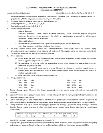 MATEMATYKA - PRZEDMIOTOWY SYSTEM OCENIANIA W LICEUM w roku szkolnym 2016/2017 nauczyciel: Izabela Łukawska 1. 2. 3. 4. 5. 6. 7. 8. 9. 10. klasy: I BC gr.polit., ID, II AB gr.hum., IIC, IIE, III C Wymagane pomoce dydaktyczne: podręcznik „Matematyka z plusem” GWO, poziom rozszerzony - klasa I BC gr.politechn. „MATeMAtyka zakres rozszerzony”, wyd. Nowa Era Przybory: długopis, ołówek, linijka, cyrkiel, kalkulator prosty. Oceny cząstkowe: 1, 2, 2+, 3, 3+, 4, 4+, 5, 6 Oceny okresowe i roczne: 1, 2, 3, 4, 5, 6 Formy zdobywania ocen: zadania domowe kartkówki (obejmują zakres trzech ostatnich tematów), uczeń powinien napisać wszystkie kartkówki (uzupełnia je po powrocie do szkoły, w wyjątkowych sytuacjach w późniejszych terminach i innego zakresu materiału) aktywność na lekcji prace klasowe (po każdym dziale, zapowiadane przynajmniej tydzień wcześniej) testy diagnostyczne, badania wyników, próbne matury W ciągu okresu uczeń może zgłosić dwa nieprzygotowania (wykluczając lekcje, na których będą przeprowadzone zapowiedziane prace klasowe lub kartkówki). Nieprzygotowanie nie obejmuje krótszej niż tydzień usprawiedliwionej nieobecności ucznia w szkole. Prace klasowe: a) Uczeń, który nie pisał pracy klasowej ustala z nauczycielem dodatkowy termin, jednak nie później niż dwa tygodnie od powrotu do szkoły. b) W przypadku, gdy uczeń w ogóle nie przystąpi do pisania pracy klasowej, to przy wyliczaniu oceny okresowej przyjmuje się zero. c) Uczeń może poprawić jedną ocenę z pracy klasowej w okresie w terminie uzgodnionym z nauczycielem. Przy wystawianiu oceny z danego okresu obie brane są pod uwagę (liczymy ich średnią arytmetyczną). d) Ocen innych niż z prac klasowych nie poprawia się. Progi procentowe: 0% - 39% ndst 70% - 74% dst+ 40% - 49% dop 75% - 84% db 50% - 54% dop+ 85% - 89% db+ 55% - 69% dst 90% - 100% bdb Ocenę celującą z pracy klasowej (nie dotyczy poprawy) otrzymuje uczeń, który zdobędzie co najmniej 98% punktów. Uczeń otrzymuje ocenę pozytywną na okres i koniec roku, jeżeli oprócz wymaganej średniej ma zaliczoną co najmniej połowę sprawdzianów. Uczeń, który otrzymał ocenę niedostateczną na okres może go zaliczyć w wyznaczonym terminie (najpóźniej do końca marca). Zaliczenie obejmuje wymagania na ocenę dopuszczającą i należy je napisać na co najmniej 60%. Ocenę okresową liczy się w sposób następujący: sprawdziany z wagą 2, pozostałe oceny z wagą 1 i liczymy średnią. Ocenę roczną wyznacza średnia wszystkich ocen z całego roku. Ocenę odczytujemy z poniższych przedziałów: przedział ocena (0; 1,75) ndst <1,75 ; 2,75) dop <2,75 ; 3,75) dst <3,75 ; 4,75) db <4,75; 5> bdb (5; 6> cel Uczeń, który zaliczył I okres ma średnią za ten okres 1,75. 11. W przypadku, gdy uczeń chce podwyższyć proponowaną ocenę okresową, może on poprawić dodatkowo jedną wybraną pracę klasową. Takiej możliwości nie będzie miał uczeń, którego frekwencja jest poniżej 50%. 12. Nauczyciel może podwyższyć ocenę uwzględniając aktywność, zaangażowanie i osiągnięcia ucznia w konkursach przedmiotowych. Kartkówki (w jednym okresie) Klasy I poziom podstawowy: 4 – 5, Klasa I poziom rozszerzony: 5 - 6 Klasy II poziom podstawowy: 3 – 4, Klasa III poziom podstawowy: 4 - 5, Sprawdziany: Klasa I p. podstawowy I okres: Równania i nierówności (istnieje możliwość rozbicia na dwa sprawdziany na prośbę uczniów) Figury geometryczne II okres: Funkcje Własności funkcji kwadratowej Trygonometria Badanie wyników nauczania. Klasa I poziom rozszerzony I okres: Liczby rzeczywiste. Język matematyki. Funkcja liniowa. II okres: Funkcje. Funkcja kwadratowa. Planimetria. Geometria analityczna. Klasa II p. podstawowy: I okres: Potęgi, pierwiastki i logarytmy Figury i przekształcenia II okres: Ciągi Figury podobne Statystyka Badanie wyników nauczania Klasa III p. podstawowy: I okres: Wyrażenia wymierne Prawdopodobieństwo II okres: Stereometria Algebra – sprawdzian powtórzeniowy z 3 lat Geometria - sprawdzian powtórzeniowy z 3 lat Wszelkie matury próbne liczone są jak sprawdziany. Ilość sprawdzianów i kartkówek może ulec zmianie w okresie z powodu choroby nauczyciela, wycieczek klasowych itp.