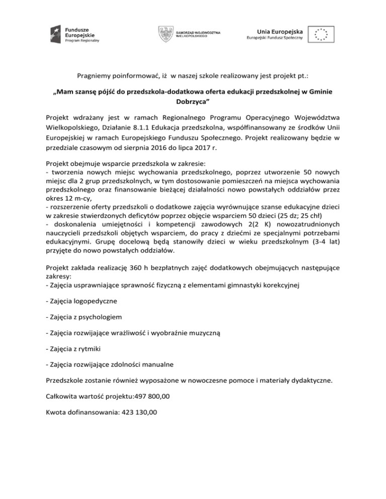 Pragniemy poinformować, iż w naszej szkole realizowany jest projekt pt.: „Mam szansę pójść do przedszkola-dodatkowa oferta edukacji przedszkolnej w Gminie Dobrzyca” Projekt wdrażany jest w ramach Regionalnego Programu Operacyjnego Województwa Wielkopolskiego, Działanie 8.1.1 Edukacja przedszkolna, współfinansowany ze środków Unii Europejskiej w ramach Europejskiego Funduszu Społecznego. Projekt realizowany będzie w przedziale czasowym od sierpnia 2016 do lipca 2017 r. Projekt obejmuje wsparcie przedszkola w zakresie: - tworzenia nowych miejsc wychowania przedszkolnego, poprzez utworzenie 50 nowych miejsc dla 2 grup przedszkolnych, w tym dostosowanie pomieszczeń na miejsca wychowania przedszkolnego oraz finansowanie bieżącej działalności nowo powstałych oddziałów przez okres 12 m-cy, - rozszerzenie oferty przedszkoli o dodatkowe zajęcia wyrównujące szanse edukacyjne dzieci w zakresie stwierdzonych deficytów poprzez objęcie wsparciem 50 dzieci (25 dz; 25 chł) - doskonalenia umiejętności i kompetencji zawodowych 2(2 K) nowozatrudnionych nauczycieli przedszkoli objętych wsparciem, do pracy z dziećmi ze specjalnymi potrzebami edukacyjnymi. Grupę docelową będą stanowiły dzieci w wieku przedszkolnym (3-4 lat) przyjęte do nowo powstałych oddziałów. Projekt zakłada realizację 360 h bezpłatnych zajęć dodatkowych obejmujących następujące zakresy: - Zajęcia usprawniające sprawność fizyczną z elementami gimnastyki korekcyjnej - Zajęcia logopedyczne - Zajęcia z psychologiem - Zajęcia rozwijające wrażliwość i wyobraźnie muzyczną - Zajęcia z rytmiki - Zajęcia rozwijające zdolności manualne Przedszkole zostanie również wyposażone w nowoczesne pomoce i materiały dydaktyczne. Całkowita wartość projektu:497 800,00 Kwota dofinansowania: 423 130,00