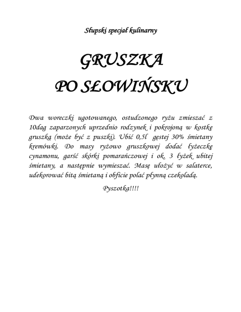 Słupski specjał kulinarny GRUSZKA PO SŁOWIŃSKU Dwa woreczki ugotowanego, ostudzonego ryżu zmieszać z 10dag zaparzonych uprzednio rodzynek i pokrojoną w kostkę gruszką (może być z puszki). Ubić 0,5l gęstej 30% śmietany kremówki. Do masy ryżowo gruszkowej dodać łyżeczkę cynamonu, garść skórki pomarańczowej i ok. 3 łyżek ubitej śmietany, a następnie wymieszać. Masę ułożyć w salaterce, udekorować bitą śmietaną i obficie polać płynną czekoladą. Pyszotka!!!!