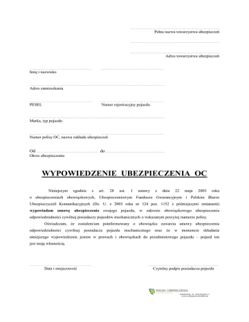 …………………………………………………………………………………………….. Pełna nazwa towarzystwa ubezpieczeń …………………………………………………………………………………………….. …………………………………………………………………………………………….. Adres towarzystwa ubezpieczeń ………………………………………………………………… ……………………………………………………………….… Imię i nazwisko …………………………………………………………………………………………………………………………….……………….. Adres zamieszkania ………………………………………………………………… PESEL …………………………………………………….…………… Numer rejestracyjny pojazdu …………………………………………………………………………………………………………...……………….…….………….. Marka, typ pojazdu ………………………………………………………………… …………………………………………………..……………… Numer polisy OC, nazwa zakładu ubezpieczeń Od …………………………………………..………………….… do ……………………………………………………….….… Okres ubezpieczenia WYPOWIEDZENIE UBEZPIECZENIA OC Niniejszym zgodnie z art. 28 ust. 1 ustawy z dnia 22 maja 2003 roku o ubezpieczeniach obowiązkowych, Ubezpieczeniowym Funduszu Gwarancyjnym i Polskim Biurze Ubezpieczycieli Komunikacyjnych (Dz. U. z 2003 roku nr 124 poz. 1152 z późniejszymi zmianami) wypowiadam umowę ubezpieczenia swojego pojazdu, w zakresie obowiązkowego ubezpieczenia odpowiedzialności cywilnej posiadaczy pojazdów mechanicznych o wskazanym powyżej numerze polisy. Oświadczam, że zostałem/am poinformowany o obowiązku zawarcia umowy ubezpieczenia odpowiedzialności cywilnej posiadacza pojazdu mechanicznego oraz że w momencie składania niniejszego wypowiedzenia jestem w prawach i obowiązkach do przedmiotowego pojazdu – pojazd ten jest moją własnością. ………………………………………………………….….… ……………………………………………………………………….… Data i miejscowość Czytelny podpis posiadacza pojazdu