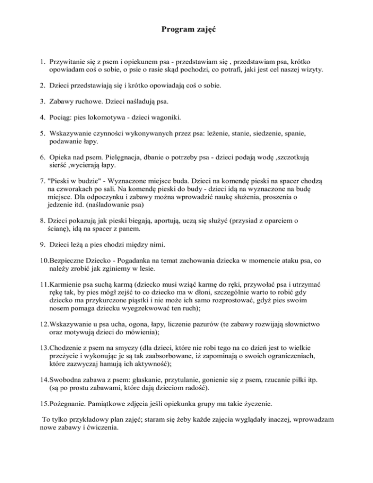 Program zajęć 1. Przywitanie się z psem i opiekunem psa - przedstawiam się , przedstawiam psa, krótko opowiadam coś o sobie, o psie o rasie skąd pochodzi, co potrafi, jaki jest cel naszej wizyty. 2. Dzieci przedstawiają się i krótko opowiadają coś o sobie. 3. Zabawy ruchowe. Dzieci naśladują psa. 4. Pociąg: pies lokomotywa - dzieci wagoniki. 5. Wskazywanie czynności wykonywanych przez psa: leżenie, stanie, siedzenie, spanie, podawanie łapy. 6. Opieka nad psem. Pielęgnacja, dbanie o potrzeby psa - dzieci podają wodę ,szczotkują sierść ,wycierają łapy. 7. "Pieski w budzie" - Wyznaczone miejsce buda. Dzieci na komendę pieski na spacer chodzą na czworakach po sali. Na komendę pieski do budy - dzieci idą na wyznaczone na budę miejsce. Dla odpoczynku i zabawy można wprowadzić naukę służenia, proszenia o jedzenie itd. (naśladowanie psa) 8. Dzieci pokazują jak pieski biegają, aportują, uczą się służyć (przysiad z oparciem o ścianę), idą na spacer z panem. 9. Dzieci leżą a pies chodzi między nimi. 10.Bezpieczne Dziecko - Pogadanka na temat zachowania dziecka w momencie ataku psa, co należy zrobić jak zginiemy w lesie. 11.Karmienie psa suchą karmą (dziecko musi wziąć karmę do ręki, przywołać psa i utrzymać rękę tak, by pies mógł zejść to co dziecko ma w dłoni, szczególnie warto to robić gdy dziecko ma przykurczone piąstki i nie może ich samo rozprostować, gdyż pies swoim nosem pomaga dziecku wyegzekwować ten ruch); 12.Wskazywanie u psa ucha, ogona, łapy, liczenie pazurów (te zabawy rozwijają słownictwo oraz motywują dzieci do mówienia); 13.Chodzenie z psem na smyczy (dla dzieci, które nie robi tego na co dzień jest to wielkie przeżycie i wykonując je są tak zaabsorbowane, iż zapominają o swoich ograniczeniach, które zazwyczaj hamują ich aktywność); 14.Swobodna zabawa z psem: głaskanie, przytulanie, gonienie się z psem, rzucanie piłki itp. (są po prostu zabawami, które dają dzieciom radość). 15.Pożegnanie. Pamiątkowe zdjęcia jeśli opiekunka grupy ma takie życzenie. To tylko przykładowy plan zajęć; staram się żeby każde zajęcia wyglądały inaczej, wprowadzam nowe zabawy i ćwiczenia.