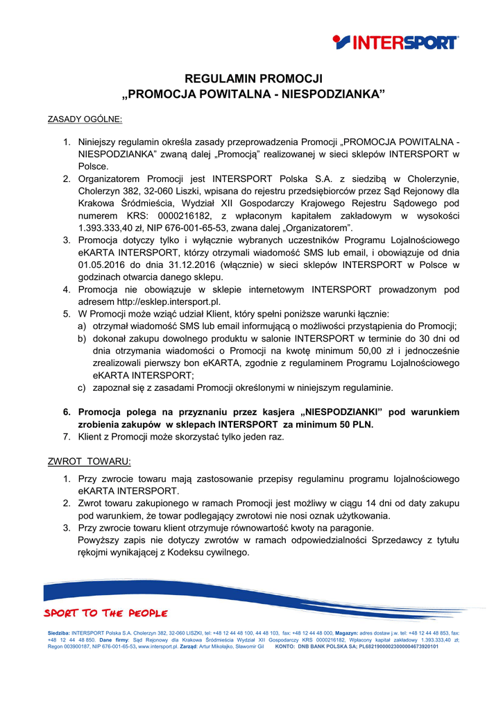 REGULAMIN PROMOCJI „PROMOCJA POWITALNA - NIESPODZIANKA” ZASADY OGÓLNE: 1. Niniejszy regulamin określa zasady przeprowadzenia Promocji „PROMOCJA POWITALNA NIESPODZIANKA” zwaną dalej „Promocją” realizowanej w sieci sklepów INTERSPORT w Polsce. 2. Organizatorem Promocji jest INTERSPORT Polska S.A. z siedzibą w Cholerzynie, Cholerzyn 382, 32-060 Liszki, wpisana do rejestru przedsiębiorców przez Sąd Rejonowy dla Krakowa Śródmieścia, Wydział XII Gospodarczy Krajowego Rejestru Sądowego pod numerem KRS: 0000216182, z wpłaconym kapitałem zakładowym w wysokości 1.393.333,40 zł, NIP 676-001-65-53, zwana dalej „Organizatorem”. 3. Promocja dotyczy tylko i wyłącznie wybranych uczestników Programu Lojalnościowego eKARTA INTERSPORT, którzy otrzymali wiadomość SMS lub email, i obowiązuje od dnia 01.05.2016 do dnia 31.12.2016 (włącznie) w sieci sklepów INTERSPORT w Polsce w godzinach otwarcia danego sklepu. 4. Promocja nie obowiązuje w sklepie internetowym INTERSPORT prowadzonym pod adresem http://esklep.intersport.pl. 5. W Promocji może wziąć udział Klient, który spełni poniższe warunki łącznie: a) otrzymał wiadomość SMS lub email informującą o możliwości przystąpienia do Promocji; b) dokonał zakupu dowolnego produktu w salonie INTERSPORT w terminie do 30 dni od dnia otrzymania wiadomości o Promocji na kwotę minimum 50,00 zł i jednocześnie zrealizowali pierwszy bon eKARTA, zgodnie z regulaminem Programu Lojalnościowego eKARTA INTERSPORT; c) zapoznał się z zasadami Promocji określonymi w niniejszym regulaminie. 6. Promocja polega na przyznaniu przez kasjera „NIESPODZIANKI” pod warunkiem zrobienia zakupów w sklepach INTERSPORT za minimum 50 PLN. 7. Klient z Promocji może skorzystać tylko jeden raz. ZWROT TOWARU: 1. Przy zwrocie towaru mają zastosowanie przepisy regulaminu programu lojalnościowego eKARTA INTERSPORT. 2. Zwrot towaru zakupionego w ramach Promocji jest możliwy w ciągu 14 dni od daty zakupu pod warunkiem, że towar podlegający zwrotowi nie nosi oznak użytkowania. 3. Przy zwrocie towaru klient otrzymuje równowartość kwoty na paragonie. Powyższy zapis nie dotyczy zwrotów w ramach odpowiedzialności Sprzedawcy z tytułu rękojmi wynikającej z Kodeksu cywilnego. Siedziba: INTERSPORT Polska S.A. Cholerzyn 382, 32-060 LISZKI, tel: +48 12 44 48 100, 44 48 103, fax: +48 12 44 48 000, Magazyn: adres dostaw j.w. tel: +48 12 44 48 853, fax: +48 12 44 48 850. Dane firmy: Sąd Rejonowy dla Krakowa Śródmieścia Wydział XII Gospodarczy KRS 0000216182, Wpłacony kapitał zakładowy 1.393.333,40 zł; Regon 003900187, NIP 676-001-65-53, www.intersport.pl. Zarząd: Artur Mikołajko, Sławomir Gil KONTO: DNB BANK POLSKA SA; PL68219000023000004673920101 WYMIANA TOWARU: 1. Klient może w ciągu 14 dni od daty zakupu wymienić zakupiony podczas Promocji towar (w miarę dostępności na stanach magazynowych) pod warunkiem, że towar podlegający wymianie nie nosi oznak użytkowania. 2. W przypadku wymiany towaru klientowi nie wygeneruje się możliwość otrzymania kolejnej „Niespodzianki”. REKLAMACJE: 1. W przypadku uznanej reklamacji towaru objętego Promocją, klientowi nie wygeneruje się możliwość otrzymania kolejnej „Niespodzianki”. 2. Niniejszy regulamin jest dostępny w sklepach INTERSPORT od 01.05.2016 do 15.01.2017 r. 3. Wszelkie zapytania związane z Promocją powinny być kierowane w formie pisemnej na adres [email protected] Siedziba: INTERSPORT Polska S.A. Cholerzyn 382, 32-060 LISZKI, tel: +48 12 44 48 100, 44 48 103, fax: +48 12 44 48 000, Magazyn: adres dostaw j.w. tel: +48 12 44 48 853, fax: +48 12 44 48 850. Dane firmy: Sąd Rejonowy dla Krakowa Śródmieścia Wydział XII Gospodarczy KRS 0000216182, Wpłacony kapitał zakładowy 1.393.333,40 zł; Regon 003900187, NIP 676-001-65-53, www.intersport.pl. Zarząd: Artur Mikołajko, Sławomir Gil KONTO: DNB BANK POLSKA SA; PL68219000023000004673920101