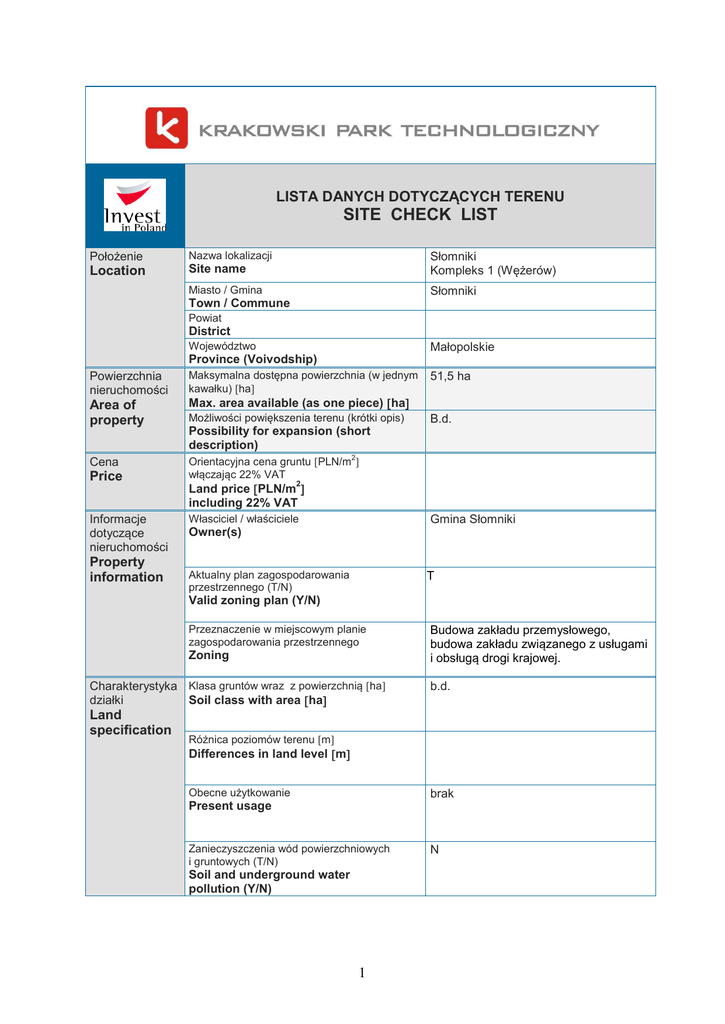 LISTA DANYCH DOTYCZĄCYCH TERENU SITE CHECK LIST Położenie Nazwa lokalizacji Location Site name Słomniki Kompleks 1 (Wężerów) Miasto / Gmina Słomniki Town / Commune Powiat District Małopolskie Województwo Province (Voivodship) Powierzchnia nieruchomości Maksymalna dostępna powierzchnia (w jednym kawałku) ha 51,5 ha Area of property Max. area available (as one piece) ha Możliwości powiększenia terenu (krótki opis) B.d. Cena Orientacyjna cena gruntu PLN/m włączając 22% VAT Price Informacje dotyczące nieruchomości Property information Possibility for expansion (short description) 2 Land price PLN/m including 22% VAT 2 Gmina Słomniki Własciciel / właściciele Owner(s) Aktualny plan zagospodarowania przestrzennego (T/N) T Valid zoning plan (Y/N) Przeznaczenie w miejscowym planie zagospodarowania przestrzennego Zoning Charakterystyka Klasa gruntów wraz z powierzchnią ha działki Soil class with area ha Land specification Budowa zakładu przemysłowego, budowa zakładu związanego z usługami i obsługą drogi krajowej. b.d. Różnica poziomów terenu m Differences in land level m Obecne użytkowanie brak Present usage Zanieczyszczenia wód powierzchniowych i gruntowych (T/N) Soil and underground water pollution (Y/N) 1 N Odpady znajdujące się na terenie (T/N) (N Waste materials on site (Y/N) Poziom wód gruntowych m Underground water level m Ryzyko wystąpienia zalań lub obsunięć terenu (T/N) N Risk of flooding or land slide (Y/N) Przeszkody podziemne (T/N) N Underground obstacles (Y/N) Przeszkody występujące na powierzchni terenu (T/N) N Ground and overhead obstacles (Y/N) Istniejące ograniczenia ekologiczne (T/N) N Ecological restrictions (Y/N) Budynki i zabudowania na terenie (T/N) N Buildings / other constructions on site (Y/N) Ograniczenia budowlane Building restrictions Procent dopuszczalnej zabudowy Building coverage % Ograniczenia wysokości budynków m Building height limit m Strefa buforowa m Buffer zone m Inne, jeśli występują Others if any Połączenia transportowe Transport links Droga dojazdowa do terenu (rodzaj drogi i jej szerokość) Access road to the plot (type and width of access road) Autostrada / droga krajowa km Od strony północnej z istniejącej drogi powiatowej i od strony zachodniej z istniejącej drogi krajowej nr 7 Odległość do projektowanego węzła drogi ekspresowej S-7 około 1,5 km. Transport zbiorowy realizowany drogą krajową nr 7. W odległości około 4km istniejąca stacja towarowa PKP. Nearest motorway / national road km Kolej km Railway line km 2 Bocznica kolejowa km 4 km Railway siding km Najbliższe lotnisko międzynarodowe km Nearest international airport km Najbliższe miasto wojewódzkie km Nearest province capital km Istniejąca infrastruktura Existing infrastructure Elektryczność na terenie (T/N) Kraków - Balice Kraków T Electricity (Y/N) Odległość przyłącza od granicy terenu Connection point (distance from boundary) m sieć energetyczna średniego napięcia z możliwością budowy własnej stacji transformatorowej na warunkach określonych przez Zakład Energetyczny Kraków Napięcie Voltage kV Dostępna moc Available capacity MW Gaz na terenie (T/N) N Gas (Y/N) Odległość przyłącza od granicy działki Connection point (distance from boundary) m Sieć gazowa średniego oraz wysokiego ciśnienia w odległości około 300 m. Wartość kaloryczna Calorific value MJ/Nm 3 Średnica rury Pipe diameter mm Dostępna objętość Available capacity Nm /h 3 Woda na terenie (T/N) Water supply (Y/N) Odległość przyłącza od granicy terenu Connection point (distance from boundary) m (prosimy o zaznaczenie, czy podana informacja dotyczy wody dla celów socjalnych czy przemysłowych. Jeżeli występują oba rodzaje wody prosimy o podanie informacji dla każdego z nich z osobna) (w przypadku braku wody prosimy o podanie odległości przyłącza od granicy terenu) Dostępna objętość Available capacity m /24h 3 Kanalizacja na terenie (T/N) T Sewage discharge (Y/N) 3 Odległość przyłącza od granicy terenu Connection point (distance from boundary) m Istniejąca siec wodociągowa przewidziana do modernizacji. Sieć kanalizacyjna na etapie przygotowania projektu do uzyskania pozwolenia na budowę.) Dostępna objętość Available capacity m /24h 3 Ograniczenie zrzutu ścieków Limitation of discharge Odprowadzenie wód deszczowych na terenie (T/N) T Rain water discharge (Y/N) Oczyszczalnia ścieków na terenie bądź w bezpośrednim sąsiedztwie N Treatment plant (Y/N) Możliwe doprowadzenie Telefony (T/N) Telephone (Y/N) Odległość przyłącza od granicy terenu Connection point (distance from boundary) m Liczba dostępnych linii analogowych Number of available analog lines Liczba dostępnych linii ISDN Number of available ISDN lines Uwagi Comments Osoby do kontaktu Contact person Urząd Miejski Słomniki, ul. Kościuszki 64, 32-090 Słomniki Tel. (012) 388-11-02, fax (012) 388-21-02 www.slomniki.pl, [email protected] Jacek Bielawski Krakowski Park Technologiczny Sp. z o.o. Al. Jana Pawła II 41L 31-864 Kraków T: +48126401949 +48 696 456 680 F: +48126401945 E: [email protected] 4 Legenda Oznaczenie terenu w planie zagospodarowania przestrzennego: PP – tereny przeznaczone pod obiekty produkcyjne, składy i magazyny. U – tereny zabudowy usługowej. - - - granice terenu przeznaczonego pod projektowany motel związany z obsługą drogi krajowej Nr 7 KDG1 – droga krajowa Nr 1 KDL – drogi lokalne MNR – tereny zabudowy mieszkaniowej – jednorodzinnej i zagrodowej. US1 – teren sportu i rekreacji RZ1 – tereny zieleni izolacyjnej. EE – linie energetyczne ze strefami technicznymi 5 6