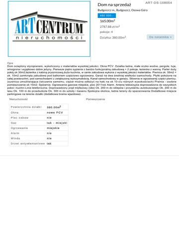 Dom na sprzedaż ART-DS-108054 Bydgoszcz m., Bydgoszcz, Osowa Góra 460 000,- 165.00m2 2787.88 zł/m2 pokoje: 4 Działka: 380.00m2 Do notatnika + Opis Dom ocieplony styropianem, wykończony z materiałów wysokiej jakości. Okna PCV .Działka ładna, małe oczko wodne, pergole, tuje, winogrona i wyjątkowo dobre jeżyny. Pierwsze piętro sypiania z bardzo funkcjonalną zabudową + 2 pokoje, łazienka z wanną. Parter duży pokój ok 30m2,łazienka z kabiną prysznicową,duża kuchnia, w cenie zabudowa wykona z wysokiej jakości materiałów. Piwnica ok. 55m2 + ok. 10m2 zamknięta zabudowa pod balkonem częściowo ogrzewana. Garaż na dwa średniej wielkości samochody. Płytki położone na całej powierzchni, pod samochodami z zwiększoną wytrzymałością. Kanał samochodowy w garażu. Siłownia w ogrzewanej części piwnicy, (suwnica umożliwiająca ćwiczenie samemu, ciężar można odłożyć na haki na ok 10-ciu różnych wysokościach) Pralnia - osobne pomieszczenie ok 15m2. Spiżarnia. Ogrzewanie gazowe miejskie, piec 2011rok Alarm. Antena telewizyjna doprowadzona do wszystkich pokoi i kuchni.Linia telefoniczna. Doprowadzony prąd trójfazowy (siła) Ok. 200 m do sklepów i przystanku autobusowego Ok. 200 m do lasu Ok. 100 m do przedszkola Ok. 300 m do szkoły i basenu Spokojna okolica, ładne tereny do spacerowania Dodatkowe miejsce parkingowe na terenie działki (dodatkowa brama wjazdowa) . Nieruchomość Pomieszczenia P o w i e r z c h n i a d z i ał k i 3 8 0 . 0 0 m2 Okna nowe PCV Plac zabaw nie Gaz tak - miejski Ogrzewanie miejskie Alarm nie Winda nie D r z w i a n t y wł a m a n i o w e t a k