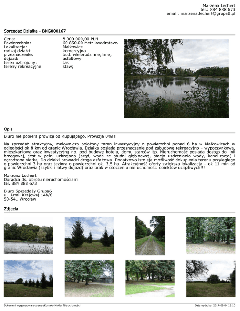 Marzena Lechert tel.: 884 888 673 email: [email protected] Sprzedaż Działka - BNG000167 Cena: Powierzchnia: Lokalizacja: rodzaj działki: przeznaczenie: dojazd: teren uzbrojony: tereny rekreacyjne: 8 000 000,00 PLN 60 850,00 Metr kwadratowy Małkowice komercyjna bud. wielorodzinne;inne; asfaltowy tak staw; Opis Biuro nie pobiera prowizji od Kupującego. Prowizja 0%!!! Na sprzedaż atrakcyjny, malowniczo położony teren inwestycyjny o powierzchni ponad 6 ha w Małkowicach w odległości ok 8 km od granic Wrocławia. Działka posiada przeznaczenie pod zabudowę rekreacyjno – wypoczynkową, mieszkaniową oraz inwestycyjną np. pod budowę hotelu, domu starców itp. Nieruchomość posiada dostęp do linii brzegowej, jest w pełni uzbrojona (prąd, woda ze studni głębinowej, stacja uzdatniania wody, kanalizacja) i ogrodzona siatką. Do działki prowadzi droga asfaltowa. Dodatkowo istnieje możliwość dokupienia terenu przyległego o powierzchni 3 ha oraz jeziora o powierzchni ok. 3,5 ha. Atrakcyjność oferty zwiększa lokalizacja – ok 11 min od granic Wrocławia (szybki i łatwy dojazd) oraz brak w otoczeniu nieruchomości obiektów uciążliwych!!! Marzena Lechert Doradca ds. obrotu nieruchomościami tel. 884 888 673 Biuro Sprzedaży Grupa6 ul. Armii Krajowej 14b/6 50-541 Wrocław Zdjęcia Dokument wygenerowany przez eKomako Makler Nieruchomości Data wydruku: 2017-03-04 15:10