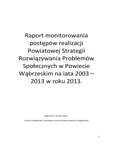Raport monitorowania postępów realizacji Powiatowej Strategii Rozwiązywania Problemów Społecznych w Powiecie Wąbrzeskim na lata 2003 – 2013 w roku 2013. Wąbrzeźno, czerwiec 2014 r. Justyna Przybyłowska, Powiatowe Centrum Pomocy Rodzinie w Wąbrzeźnie 1 Spis treści 1. Wprowadzenie – str. 3. 2. Opis zastosowanej metodologii oraz źródła informacji wykorzystywanych w badaniu str. 4. 3. Opis wyników - str. 5. 4. Wnioski i rekomendacje - str. 6. 5. Aneks – Tabela danych za rok 2011 – Monitoring Powiatowej Strategii Rozwiązywania Problemów Społecznych w Powiecie Wąbrzeskim na lata 2003 – 2013 - str. 8. 2 1. Wprowadzenie Uchwałą Nr XXX/135/09 Rady Powiatu w Wąbrzeźnie z dnia 24 listopada 2009 r. w sprawie zmiany Powiatowej Strategii Rozwiązywania Problemów Społecznych w Powiecie Wąbrzeskim na lata 2003-2013 została zaktualizowana strategia przyjęta do realizacji w 2003 roku. Przyjęty do realizacji w 2003 roku Uchwałą Nr VIII/38/2003 Rady Powiatu w Wąbrzeźnie z dnia 29 września 2003 r. w sprawie Powiatowej Strategii Rozwiązywania Problemów Społecznych w Powiecie Wąbrzeskim na lata 2003 - 2013 wieloletni dokument programowy ma istotne znaczenie dla zapewnienia bezpieczeństwa społecznego mieszkańców naszego powiatu w szczególności grup zagrożonych wykluczeniem społecznym. Cele strategii zawarte w dokumencie zmierzają do stworzenia warunków do integracji społecznej i zawodowej, poprawiającej jakość życia wszystkich tych grup we wszystkich obszarach życia społecznego i zawodowego. Strategia stworzona została przez zespół specjalistów zaproszonych przez Kierownika Powiatowego Centrum Pomocy Rodzinie w Wąbrzeźnie do tworzenia i aktualizacji Strategii. Zespół, złożony z przedstawicieli instytucji i organizacji szeroko rozumianej pomocy społecznej, stworzył cały dokument. Strategia obejmuje wieloobszarowy zakres zadań przeciwdziałających wykluczeniu społecznemu. Wypracowany został system jej wdrażania, monitorowania i ewaluacji. Materiałem diagnostycznym dla Strategii była analiza problemów społecznych występujących na terenie Powiatu Wąbrzeskiego. Zadaniem Zespołu była aktualizacja wyznaczonych kierunków polityki społecznej w Strategii rozwiązywania problemów społecznych w Powiecie Wąbrzeskim na lata 2003-2013. Punktem wyjścia była analiza SWOT, tzn. identyfikacja słabych i mocnych stron, jako walorów wyróżniających Powiat Wąbrzeski w sferze pomocy społecznej oraz istniejących ograniczeń, a także wskazanie szans, jako tendencji i zjawisk w otoczeniu, które odpowiednio wykorzystane mogą stać się bodźcem do rozwoju oraz zagrożeń, które postrzegamy jako bariery i utrudnienia w obecnym systemie pomocy społecznej. Cele Strategii zostały dostosowane do obecnych zasobów pomocy społecznej w oparciu o identyfikację aktualnych problemów, przewidywaną i pożądaną wizję przyszłości pomocy społecznej na terenie Powiatu, analizy narodowych, wojewódzkich i gminnych strategii rozwiązywania problemów społecznych oraz w uwzględnieniu priorytetów i kierunków działań zawartych w dokumentach Unii Europejskiej. Ważnym elementem aktualizacji Strategii były stałe konsultacje z organizacjami pozarządowymi, instytucjami pomocy społecznej oraz innymi instytucjami mającymi wpływ na kształt polityki społecznej na terenie Powiatu. Konsultacje obejmowały każdy etap tworzenia Strategii. Realizacja Strategii zaplanowana została do roku 2013. Terminy realizacji celów głównych i szczegółowych zawarte zostały w harmonogramie realizacji Strategii. Wdrażanie Strategii obejmuje cele operacyjne, działania i zadania w których wskazano podmioty odpowiedzialne zaangażowane w realizację, terminy realizacji, wymagane środki 3 oraz źródła finansowania. Zespół pracujący nad Strategią określił grupy osób zagrożonych wykluczeniem społecznym i wykluczonych społecznie w następujących obszarach: niepełnosprawność; dzieci, młodzież, rodzina; dysfunkcje społeczne (przemoc, uzależnienia, choroby psychiczne, przestępczość, bezdomność, uchodźctwo); kadra pomocy społecznej, pomoc instytucjonalna; bezrobocie. Strategia rozwiązywania problemów społecznych w Powiecie Wąbrzeskim na lata 2003-2013 jest systemowym sposobem zajmowania się problemami osób zagrożonych wykluczeniem społecznym oraz wykluczonych społecznie na terenie Powiatu Wąbrzeskiego. Misją Strategii są zintegrowane działania instytucji funkcjonujących w sferze lokalnej polityki społecznej oraz wykorzystanie potencjału aktywności obywatelskiej w powiązaniu z rozwojem gospodarczym Powiatu jako droga do skutecznego rozwiązywania problemów społecznych mieszkańców Powiatu Wąbrzeskiego. Określonych zostało 5 celów operacyjnych realizowanych przez wskazanie działań i poszczególnych zadań: 1) identyfikacja i badanie natężenia problemów społecznych w powiecie; 2) doskonalenie zawodowe kadr pomocy społecznej; 3) budowa, rozbudowa i modernizacja pomocy społecznej; 4) działania zmierzające do usamodzielnienia beneficjentów pomocy społecznej; 5) wypracowanie współpracy pomiędzy realizatorami pomocy społecznej w Powiecie Wąbrzeskim. 2. Opis zastosowanej wykorzystywanych w badaniu metodologii oraz źródła informacji Monitorowanie Powiatowej Strategii Rozwiązywania Problemów Społecznych w Powiecie Wąbrzeskim na lata 2003 – 2013 prowadzona jest w sposób ciągły w trakcie trwania całego okresu realizacji. Strategia jest wdrażana od momentu jej uchwalenia przez Radę Powiatu przez wskazanie instytucji odpowiedzialnych za realizację: samorządów powiatowego i gminnych, jednostek organizacyjnych powiatu i gmin, organizacji pozarządowych. Monitorowanie Strategii odbywa się według ustalonego harmonogramu zadań ze wskazaniem osób odpowiedzialnych za realizację oraz terminów ich realizacji w sposób ciągły w trakcie jej trwania poprzez: 1) systematyczne zbieranie ma