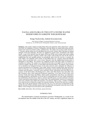 Teka Kom. Ochr. Kszt. Środ. Przyr., 2006, 3, 153-159 FAUNA AND FLORA IN TWO CITY-CENTRE WATER RESERVOIRS IN GORZÓW WIELKOPOLSKI Kinga Nuckowska, Izabela KrzyŜanowska State School of Higher Vocational Education in Gorzów Teatralna str. 25, 66-400 Gorzów Wielkopolski, Poland, e-mail: [email protected] Summary. Lake Leśnik, situated at Emilia Plater Street and commonly called „Ruski Staw” („Ruthenian Pond”) by inhabitants of Gorzów Wielkpolski, and Lake Błotne are natural kettle-holed and landlocked water reservoirs located in urban, canalised areas. The surface area of Lake Leśnik amounts to 1.7 hectares, and the surface area of Lake Błotne does not exceed 1 hectare. Both of the lakes are natural elements of the local landscape. The lakes are supplied by ground waters, precipitation and surface runoffs. A part of the rainwater from the region which runs off the storm sewage canal system ending with a petroleum derivative separator, reaches Lake Leśnik. Until recently the water for the needs of neighbouring fruit and vegetable gardens was periodically taken from this reservoir. At present, the water intake is not exploited. In the vicinity of Lake Błotne there are: a primary school and detached houses which are provided with a sewer system. Rainwater from the neighbouring housing estate is discharged to Lake Błotne. The research was conducted on both of the lakes where six positions of sampling were marked. The samples were collected from the lakes at the depth of 80 cm, by means of a scoop net, together with the survey of water plants and immersed objects. The purpose of the research was to determine the biological diversity of city-centre reservoirs and to determine the influence of external environment on its formation. Lake Leśnik, which is located at Emilia Plater street and whose shores are flat, has a very well developed belt of coastal plants, among which the dominating plants are: common reed (Phragmites communis), lesser reed-mace (Typha angustifolia) and sweet flag (Acorus calamus). In the belt of plants with floating leaves: yellow water lilly (Nuphar lutea) and white water lilly (Nymphaea alba), water smartweed (Polygonum amphibium). A few pairs of coots (Fulica atra) nest here. On the other hand, Lake Błotne, which is partly surrounded by steep shores, was subjected to thorough purification, and therefore in fact the belt of coastal plants does not exist. Small communities are constituted by soft-rush (Juncus effusus), common reed (Phragmites australis) and lesser reed-mace (Typha angustifolia) along stretches a few-metres long. The immersed plants: hornwort (Ceratophyllum demersum), whorled water milfoil (Myriophyllum verticullatum). What is more, a number of mallards (Anas platyrhynchos) (without the young) were noticed swimming. The bed of the reservoirs is muddyloamy. Due to the present character of the reservoirs, they are a very rich source of information on the specific diversity of flora and fauna typical of the city-centre lake environment, and in the case of Lake Błotne, on the ecological succession process after a purification. Key words: urban lakes, flora and fauna, species diversity INTRODUCTION The transformation of natural environment of Gorzów Wielkopolski, as a result of city development since the middle of the 60s of the 20th century, has had a significant impact on 154 Kinga Nuckowska, Izabela KrzyŜanowska reduction of Gorzów Wielkopolski natural values. Population increase by 100% forced new housing estates and roads to be built. It also contributed to the liquidation of green areas which were previously fruit and vegetable gardens. New factories were built and the gas and dust they emitted affected greenery and the existing water reservoirs. The latter, together with parks and lawns, are very frequently sanctuaries for many species of water fauna and plants. As a result of anthropopressure, they suffered permanent degradation. However, the Kłodawka River, Lake Błotne and Lake Leśnik have been recently subjected to reclamation. The aim of our research was to precisely determine the present qualitative composition of fauna and flora in both of the water reservoirs and to determine the influence of external factors on the formation of this composition. STUDY AREA Lake Leśnik, which is situated at Emilia Plater Street and which is commonly called „Ruski Staw” („Ruthenian Pond”) by inhabitants of Gorzów Wielkopolski, and Lake Błotne are natural kettle-holed and landlocked water reservoirs located in the urban, canalised areas. The surface area of Lake Leśnik amounts to 1.7 hectares, and the surface area of Lake Błotne does not exceed 1 hectare. Both of the lakes are natural elements of the local landscape. The lakes are supplied by ground waters, precipitation and surface runoffs. A part of the rainwater from the region which runs off the storm sewage canal system ending with a petroleum derivative separator, reaches Lake Leśnik. Until recently the water for the needs of neighbouring fruit and vegetable gardens was periodically taken from this reservoir. At present, the water intake is not exploited. In the vicinity of Lake Błotne there are: a primary school and detached houses which are provided with a sewer system. The rainwater from the neighbouring housing estate is discharged to Lake Błotne. The quality assessment of the waters was conducted by the Provincial Inspectorate of Environmental Protection, Branch in Gorzów Wielkopolski. Lake Leśnik in Gorzów Wielkopolski was researched twice in 2003. The waters of Lake Leśnik were characterised by good oxygenation, both in spring as well as in summer. Despite the fact that the reservoir was significantly burdened with external runoffs, the amount of organic and bioorganic substances was not high. Both indicators showed values of classes I and II. The sanitary condition of the reservoir, according to earlier research from the period 2000-2001 corresponded to the 