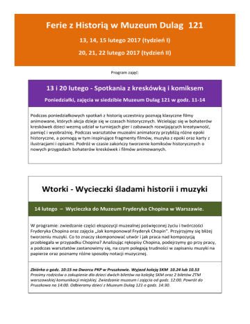 Ferie z Historią w Muzeum Dulag 121 13, 14, 15 lutego 2017 (tydzień I) 20, 21, 22 lutego 2017 (tydzień II) Program zajęć: 13 i 20 lutego - Spotkania z kreskówką i komiksem Poniedziałki, zajęcia w siedzibie Muzeum Dulag 121 w godz. 11-14 Podczas poniedziałkowych spotkań z historią uczestnicy poznają klasyczne filmy animowane, których akcja dzieje się w czasach historycznych. Wcielając się w bohaterów kreskówek dzieci wezmą udział w turniejach gier i zabawach rozwijających kreatywność, pamięć i wyobraźnię. Podczas warsztatów muzealni animatorzy przybliżą różne epoki historyczne, a pomogą w tym inspirujące fragmenty filmów, muzyka z epoki oraz karty z ilustracjami i opisami. Podróż w czasie zakończy tworzenie komiksów historycznych o nowych przygodach bohaterów kreskówek i filmów animowanych. Wtorki - Wycieczki śladami historii i muzyki 14 lutego – Wycieczka do Muzeum Fryderyka Chopina w Warszawie. W programie: zwiedzanie części ekspozycji muzealnej poświęconej życiu i twórczości Fryderyka Chopina oraz zajęcia „Jak komponował Fryderyk Chopin”. Przyjrzyjmy się bliżej tworzeniu muzyki. Co to znaczy skomponować utwór i jak praca nad kompozycją przebiegała w przypadku Chopina? Analizując rękopisy Chopina, podejrzymy go przy pracy, a podczas warsztatów zastanowimy się, na czym polegają trudności w zapisaniu muzyki na papierze oraz poznamy różne sposoby notacji muzycznej. Zbiórka o godz. 10:15 na Dworcu PKP w Pruszkowie. Wyjazd koleją SKM 10.24 lub 10.53 Prosimy rodziców o zakupienie dla dzieci dwóch biletów na kolejkę SKM oraz 2 biletów ZTM warszawskiej komunikacji miejskiej. Zwiedzanie muzeum i zajęcia od godz. 12:00. Powrót do Pruszkowa na 14:00. Odbieramy dzieci z Muzeum Dulag 121 o godz. 14:30. 21 lutego - Wycieczka do Muzeum Archeologicznego w Warszawie. W programie: zwiedzanie ekspozycji i zajęcia muzealne „Bicie dawnej monety”. Podczas wizyty w muzeum poznamy pradziejowe dziedzictwo ziem polskich i usłyszymy opowieść o dawnych osadnikach, którzy zamieszkiwali tereny dzisiejszego Mazowsza przed wiekami. W muzeum czekają na nas setki artefaktów, w tym przedmioty codziennego użytku, fragmenty oręża i strojów wojowników, dawne ozdoby i biżuteria oraz wiele innych eksponatów, które jako pamiątki przeszłości pomagają nam poznać obyczaje i kulturę z przełomu er. Podczas warsztatów zobaczymy jak dawniej wybijano monety, a także spróbujemy nauczyć się tego rzemiosła z udziałem muzealnych instruktorów. Zbiórka o godz. 10:15 na Dworcu PKP w Pruszkowie. Wyjazd koleją SKM 10.24 lub 10.53 Prosimy rodziców o zakupienie dla dzieci dwóch biletów ulgowych na kolejkę SKM oraz 2 biletów ulgowych ZTM warszawskiej komunikacji miejskiej . Zwiedzanie muzeum i zajęcia od godz. 12:00. Powrót do Pruszkowa na 14:00. Odbieramy dzieci z Muzeum Dulag 121 o godz. 14:30. 15 i 22 lutego - Poznajemy baśnie i legendy warszawskie Środy, zajęcia w siedzibie Muzeum Dulag 121 w godz. 11-14 Poznając legendy warszawskie m.in.: o Bazyliszku i Złotej Kaczce, uczestnicy zajęć odkryją tajemnice z historii naszej stolicy, a także poznają topografię miasta, jego zabytki i architekturę. Muzealni animatorzy za pomocą technik teatralnych pomogą dzieciom stworzyć ich własną legendę opartą na motywach zaczerpniętych z historii. Podczas zabaw i warsztatów można będzie nauczyć się, jak zilustrować wymyślone opowieści oraz jak stworzyć postacie i scenografię do teatrzyków cieni. Zajęcia są bezpłatne i przeznaczone są dla dzieci w wieku 7-12 lat. Prowadzą: Jacek Zegarłowicz i Dominika Małgowska (animatorzy Muzeum). Z uwagi na ograniczona liczbę miejsc prosimy o wcześniejsze zapisy: telefonicznie lub mailowo: (22) 758 86 63, [email protected]