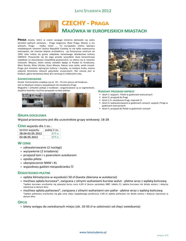 LATO STUDENTA 2012 CZECHY - PRAGA MAJÓWKA W EUROPEJSKICH MIASTACH PRAGA miasto, które w czasie swojego istnienia dosłużyło się wielu określeń pełnych zachwytu - Praga magiczna, Złota Praga, Miasto o stu wieżach, Praga - matka miast ... To europejska stolica tętniąca niesłabnącym rytmem! Stolica Republiki Czeskiej to nie tylko nowoczesna metropolia, ale również klejnot architektury - jej historyczne centrum od 1992 roku należy do grona zabytków światowego dziedzictwa kultury UNESCO. Przyczyniła się do tego przede wszystkim duża koncentracja zabytków na stosunkowo niewielkiej powierzchni, co zdarza się w niewielu miastach. Miejsca, które należy zwiedzić będąc w Pradze to Hradczany, Most Karola, Złota Uliczka, Stare Miasto, Ratusz oraz wiele, wiele innych. Praga jest miastem tętniącym kulturą i muzyką, na każdym kroku można usłyszeć brzmienia różnych gatunków muzycznych. Nie inaczej jest w klubach, gdzie światowej sławy dj’e serwują tu niebanalne sety. ZAKWATEROWANIE Hostel Komenskeho znajduje się ok. 10 – 15 min pieszo od Hradczan. Jest w idealnym miejscu wypadowym do zwiedzania Pragi. Wygodne i schludne pokoje 2-osobowe zorganizowane są w segmentach, wspólna łazienka i kuchnia przypada na dwa pokoje. RAMOWY PROGRAM IMPREZY dzień 1: wyjazd z Polski w godzinach wieczornych dzień 2: przyjazd do Pragi dzień 2-4: zwiedzanie Pragi, imprezki dzień 4: wykwaterowanie w godzinach rannych, wyjazd z Pragi w godzinach wieczornych dzień 5: przyjazd do Polski w godzinach rannych GRUPA DOCELOWA Wyjazd przeznaczony jest dla uczestników grupy wiekowej: 18-28 CENA wyjazdu dla 1 os.: termin wyjazdu pokój 2 os. 28.04-02.05.2012 377 ZŁ 02-06.05.2012 377 ZŁ W CENIE zakwaterowanie (2 noclegi) wyżywienie (2 śniadania) przejazd tam i z powrotem autokarem opieka pilota ubezpieczenie NNW i KL wyjazdowy gadżet-niespodzianka DODATKOWO PŁATNE opłata klimatyczna w wysokości 50 zł (kwota zbierana w autokarze) możliwa opłata kursowa*, związana z silnymi wahaniami kursów walut - płatne wraz z wpłatą końcową *opłata kursowa uruchamia się powyżej kursu euro 4,20 zł (kursu sprzedaży NBP, tabela C); opłata kursowa nie działa wstecz i dotyczy rejestracji w danym dniu możliwa opłata paliwowa*, związana z silnymi wahaniami cen paliw - płatne wraz z wpłatą końcową *opłata paliwowa uruchamia się gdy cena oleju napędowego przekroczy 5,90 zł; opłata paliwowa nie działa wstecz i dotyczy rejestracji w danym dniu OPCJE bilety wstępu do zwiedzanych miejsc (ok. 10-50 zł w zależności od chęci zwiedzania) www.latostudenta.pl strona: 1/3 LATO STUDENTA 2012 WYŻYWIENIE - proponujemy skorzystać z ofert miejscowych barów/restauracji UBEZPIECZENIE - szczegółowe warunki ubezpieczenia - patrz str. 3 „Informacje dodatkowe” ZNIŻKI wg programu zniżkowego (szczegóły na: www.latostudenta.pl) w przypadku dojazdu własnego w obie strony 100 zł taniej ZAPISY www.latostudenta.pl PŁATNOŚCI ZALICZKA wynosi 250 ZŁ OD OSOBY. Wpłatę zaliczki należy dokonać dopiero po potwierdzonej przez Klub rezerwacji miejsca. Jeśli w ciągu 2 dni od daty otrzymania potwierdzenia rezerwacji miejsca zaliczka nie zostanie wpłacona, rezerwacja zostanie anulowana. WPŁATA KOŃCOWA termin wyjazdu 28.04.2012-02.05.2012 02-06.05.2012 termin wpłaty końcowej 16.03.2012 19.03.2012 tytuł wpłaty PRA.0428.IMIĘ.NAZWISKO PRA.0502.IMIĘ.NAZWISKO Jeżeli rezerwacja została dokonana po terminie wpłaty końcowej obowiązuje wpłata kwoty całkowitej w terminie: 2 dni od daty otrzymania potwierdzenia rezerwacji miejsca (rezerwacje do 11 dni przed wyjazdem); 1 dnia od daty otrzymania potwierdzenia rezerwacji miejsca (rezerwacje od 10 dni przed wyjazdem). Płatności dokonujemy na podane poniżej konto bankowe. Dokonanie wpłaty Klub potwierdza emailem po zaksięgowaniu pieniędzy na koncie. Wpłata pieniędzy oznacza akceptację „Regulaminu Uczestnictwa”. NAMIARY BANKOWE Klub Uczelniany AZS Politechnika Warszawska Adres: ul. Waryńskiego 12a, 00-631 Warszawa Nr rachunku: 73 1030 1016 0000 0000 8114 2017 ZAPRASZAMY DO AKTYWNEGO WYPOCZYNKU I SUPER ZABAWY! www.latostudenta.pl strona: 2/3 LATO STUDENTA 2012 INFORMACJE DODATKOWE PASZPORT LUB DOWÓD OSOBISTY - niezbędny w celu przekroczenia granicy, aktualny na okres wyjazdu. UBEZPIECZENIE Polisa Compensa, NNW do 10.000 zł, KL i Assistance do 200.000 zł. BAGAŻ, GODZINA I MIEJSCE ODJAZDU AUTOKARU Do bagażnika - max 20 kg na os., podręczny - max 5 kg na os. Dokładne dane na temat godziny i miejsca odjazdu autokaru oraz rozkładu osób w autokarze będą podane w oddzielnym informatorze wyjazdowym. ZNISZCZENIA Zniszczenia/braki sprzętu w pokojach/autokarach pokrywają ich użytkownicy/sprawcy powstałej szkody. REZYGNACJE Jeżeli będziesz musiał/a zrezygnować z wyjazdu poinformuj nas o tym emailem: [email protected] REGULAMIN UCZESTNICTWA www.latostudenta.pl/2012/Regulamin_Uczestnictwa.pdf www.latostudenta.pl strona: 3/3