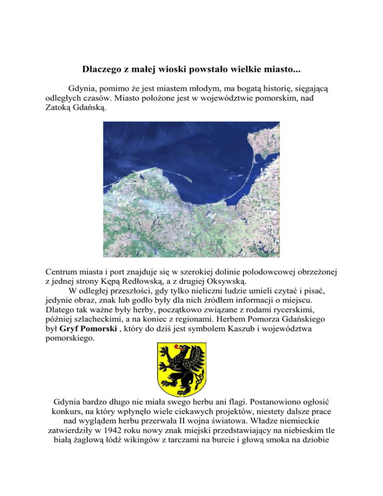 Dlaczego z małej wioski powstało wielkie miasto... Gdynia, pomimo Ŝe jest miastem młodym, ma bogatą historię, sięgającą odległych czasów. Miasto połoŜone jest w województwie pomorskim, nad Zatoką Gdańską. Centrum miasta i port znajduje się w szerokiej dolinie polodowcowej obrzeŜonej z jednej strony Kępą Redłowską, a z drugiej Oksywską. W odległej przeszłości, gdy tylko nieliczni ludzie umieli czytać i pisać, jedynie obraz, znak lub godło były dla nich źródłem informacji o miejscu. Dlatego tak waŜne były herby, początkowo związane z rodami rycerskimi, później szlacheckimi, a na koniec z regionami. Herbem Pomorza Gdańskiego był Gryf Pomorski , który do dziś jest symbolem Kaszub i województwa pomorskiego. Gdynia bardzo długo nie miała swego herbu ani flagi. Postanowiono ogłosić konkurs, na który wpłynęło wiele ciekawych projektów, niestety dalsze prace nad wyglądem herbu przerwała II wojna światowa. Władze niemieckie zatwierdziły w 1942 roku nowy znak miejski przedstawiający na niebieskim tle białą Ŝaglową łódź wikingów z tarczami na burcie i głową smoka na dziobie Ostatecznie wygląd herbu Gdyni został zatwierdzony dopiero w 1978 roku. Przedstawiał dwie ryby w kolorze Ŝółtym i biały miecz na czerwonym tle. Z epoki kamienia, brązu i Ŝelaza pochodzą najstarsze ślady obecności człowieka na terenie dzisiejszej Gdyni. W XIV wieku całe Pomorze Gdańskie znajdowało się w rękach zakonu krzyŜackiego, od tego czasu Gdynia stała się wsią rybacką, a jej właściciel i mieszkańcy mieli prawo do połowu ryb. WaŜnym wydarzeniem dla osady gdyńskiej było otwarcie w 1870 roku linii kolejowej na zachód, zaczął rozwijać się handel. W latach dwudziestych XX wieku Polska potrzebowała nowego portu, bo w starym- Gdańsku - rozpanoszyli się Niemcy. Długo zastanawiano się nad lokalizacją, ostatecznie dzięki Eugeniuszowi Kwiatkowskiemu i Tadeuszowi Wendzie wybrano małą wioskę rybacką o wdzięcznej nazwie Gdynia. Rozwój miasta nastąpił po roku 1926, kiedy to Gdynia uzyskała prawa miejskie. Został opracowany plan zabudowy , który miał przypominać rozłoŜony wachlarz. Dzisiaj Gdynia jest dynamicznie rozwijającym się miastem o charakterze morskim, stanowi waŜny ośrodek nauki i kultury. Fotografie Gdyni, w tle piosenka M. Rodowicz Opracowanie Małgorzata Jakubczyk Marek Pauli
