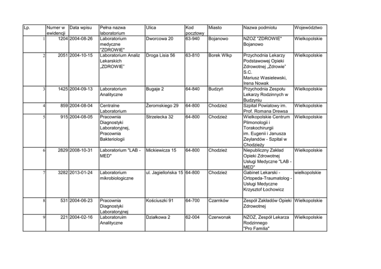 Lp. Numer w Data wpisu ewidencji 1204 2004-08-26 1 Pełna nazwa laboratorium Laboratorium medyczne "ZDROWIE" Laboratorium Analiz Lekarskich „ZDROWIE” Ulica Nazwa podmiotu Województwo Dworcowa 20 Kod Miasto pocztowy 63-940 Bojanowo NZOZ "ZDROWIE" Bojanowo Wielkopolskie Droga Lisia 56 63-810 Borek Wlkp Wielkopolskie Laboratorium Analityczne Bugaje 2 64-840 Budzyń Centralne Laboratorium Pracownia Diagnostyki Laboratoryjnej, Pracownia Bakteriologii Żeromskiego 29 64-800 Chodzież Strzelecka 32 64-800 Chodzież Przychodnia Lekarzy Podstawowej Opieki Zdrowotnej „Zdrowie” S.C. Mariusz Wasielewski, Irena Nowak Przychodnia Zespołu Lekarzy Rodzinnych w Budzyniu Szpital Powiatowy im. Prof. Romana Drewsa Wielkopolskie Centrum Pilmonologii i Torakochirurgii im. Eugenii i Janusza Zeylandów - Szpital w Chodzieży Niepubliczny Zakład Opieki Zdrowotnej Usługi Medyczne "LAB MED" Gabinet Lekarski Ortopeda-Traumatolog Usługi Medyczne Krzysztof Łochowicz 2 2051 2004-10-15 3 1425 2004-09-13 4 859 2004-08-04 5 915 2004-08-05 6 2829 2008-10-31 Laboratorium "LAB MED" Mickiewicza 15 64-800 Chodzież 7 3282 2013-01-24 Laboratorium mikrobiologiczne ul. Jagiellońska 15 64-800 Chodzież 8 531 2004-06-23 Kościuszki 91 64-700 Czarnków Zespół Zakładów Opieki Wielkopolskie Zdrowotnej 9 221 2004-02-16 Pracownia Diagnostyki Laboratoryjnej Laboratoruim Analityczne Działkowa 2 62-004 Czerwonak NZOZ, Zespół Lekarza Rodzinnego "Pro Familia" Wielkopolskie Wielkopolskie Wielkopolskie Wielkopolskie wielkopolskie Wielkopolskie Laboratorium Analiz Lekarskich "SANITAS" Laboratorium Diagnostyczne Żwirki i Wigury Nr 62-200 43 Gniezno NZOZ SANITAS Poznańska 15 62-200 Gniezno Wojewódzki Szpital Dla Wielkopolskie Nerwowo i Psychicznie Chorych ”DZIEKANKA” Laboratorium Analityczne Laboratorium Mikrobiologiczne ul. Św. Jana 9 62-200 Gniezno Wielkopolskie ul. Św. Jana 9 62-200 Gniezno Zespół Opieki Zdrowotnej w Gnieźnie Samodzielny Publiczny Zakład Opieki Zdrowotnej w Gnieźnie Szpital ZOZ Gniezno 1525 2004-09-22 Laboratorium Bakteriologiczne Św. Wawrzyńca 18 62-200 Gniezno Wielkopolskie 15 2610 2006-07-24 Laboratorium Analityczne "ANALITYK" Dworcowa 19 62-200 Gniezno Powiatowa Stacja SanitarnoEpidemiologiczna w Gnieźnie NZOZ Laboratorium Analityczne "ANALITYK" s.c. Elżbieta Gołembowska & Anna Lubawa & Bogusława Tarłowska 16 3418 2014-05-22 Jeziorna 13A 62-200 Gniezno Diagnostyka Sp. z o.o. wielkopolskie 17 866 2004-08-04 Laboratorium Oddziału Poznań Laboratorium Medyczne ul. Przy Dworcu 4A 63-800 Gostyń 18 902 2004-08-05 Laboratorium Analityczne Graniczna 4 63-800 Gostyń 19 1583 2004-09-28 Medyczne Laboratorium Diagnostyczne Pl. K. Marcinkowskiego 8 63-800 Gostyń Laboratorium Medyczne Wielkopolskie "LABOR" mgr Anna JahnzKrawiec Zespół Przychodni Wielkopolskie Lekarza Rodzinnego GOS-MED. Spółka Jawna Samodzielny Publiczny Wielkopolskie Zespół Opieki Zdrowotnej w Gostyniu 10 1052 2004-08-17 11 1409 2004-09-09 12 1441 2004-09-14 13 1524 2004-09-22 14 Wielkopolskie Wielkopolskie Wielkopolskie Laboratorium Analityczne " ANALMED." Pracownia Diagnostyki Laboratoryjnej Kaliska 17 63-520 Grabów nad Prosną Mossego 3 62-065 Grodzisk Wielkopolski Laboratorium Analityczne Laborarorium Mikrobiologiczne ul. Szpitalna 1 63-200 Jarocin ul. Wąska nr 2 63-200 Jarocin 3480 2015-02-25 Pracownia Diagnostyki Laboratoryjnej Piaskowa 5 63-200 Jarocin 25 2736 2007-08-30 Laboratorium LaborMed. 1-go Maja 11 64-915 Jastrowie 26 1426 2004-09-13 Laboratorium Medyczne Pilska 2 64-810 Kaczory 27 4 2003-12-10 Laboratorium Analiz Lekarskich Kordeckiego 36 62-800 Kalisz 28 376 2004-04-13 Zakład Diagnostyki Laboratoryjnej Poznańska 62-800 Kalisz 29 415 2004-04-29 Zakład Mikrobiologii Klinicznej Poznańska 79 62-800 Kalisz 30 444 2004-05-06 Laboratorium Bakteriologiczne Majkowska 13A 62-800 Kalisz 20 1673 2004-09-30 21 1638 2004-09-29 22 1365 2004-09-06 23 1483 2004-09-16 24 Laboratorium Analityczne " ANALMED." Maria Jończyk Samodzielny Publiczny Zakład Opieki Zdrowotnej w Grodzisku Wielkopolskim Zespół Zakładów Opieki Zdrowotnej Powiatowa Stacja SanitarnoEpidemiologiczna w Jarocinie NZOZ Laboratorium Analityczne i Fizjoterapia Anna Rudnicka Zakład Diagnostyki Laboratoryjnej LaborMed. Przychodnia Lekarska w Kaczorach Laboratorium Medyczne - Wiesława Krotoszyńska NZOZ Laboratorium Analiz Lekarskich Dorota Anna Łenczuk Wojewódzki Szpital Zespolony im. Ludwika Perzyny Wojewódzki Szpital Zespolony im. Ludwika Perzyny w Kaliszu NZOZ "BAKTER" Wielkopolskie Wielkopolskie Wielkopolskie Wielkopolskie Wielkopolskie Wielkopolskie Wielkopolskie Wielkopolskie Wielkopolskie Wielkopolskie Wielkopolskie 31 1134 2004-08-19 Laboratorium CENTROLAB Polna 29 62-800 Kalisz Kaliskie Centrum Laboratoryjne "CENTROLAB" NZOZ Wojewódzki Szpital Zespolony im. Ludwika Perzyny Laboratorium Analiz Lekarskich „VENA”, mgr Anna PopławskaBąk, NZOZ Powiatowa Stacja Sanitarno Epidemiologiczna w Kaliszu Gabinet Analiz Lekarskich "DIAGNOSTYK" Regionalne Centrum Krwiodawstwa i Krwiolecznictwa w Kaliszu Specjalistyczny Zakład Opieki Zdrowotnej ENDOLAB, NZOZ Wielkopolskie 32 1654 2004-09-30 Zakład Diagnostyki Laboratoryjnej Toruńska 7 62-800 Kalisz 33 1671 2004-09-30 Laboratorium Analiz Lekarskich „VENA” ul. Śródmiejska 34 62-800 Kalisz 34 1683 2004-09-30 Kalisz 35 2578 2006-03-16 36 2819 2008-09-08 Oddział Kościuszki 6 62-800 Laboratoryjny Sekcja Mikrobiologii i Parazytologii Gabinet Analiz Św Stanisława 7/3 62-800 Lekarskich "DIAGNOSTYK" Dział Laboratoryjny Kaszubska 9 62-800 37 2840 2009-01-28 Laboratorium ENDOLAB Częstochowska 10 62-800 Kalisz 38 3233 2012-07-06 Częstochowska 71-75 62-800 39 1451 2004-09-14 Pocztowa 1-3 40 1593 2004-09-28 Pracownia Diagnostyki Labotratoryjnej Laboratorium Pracownia Mikrobiologiczna Schorzeń Jelitowych Centralne Laboratorium Analityczne Kalisz Szpital KALMEDICA wielkopolskie 63-600 Kępno Powiatowa Stacja SanitarnoEpdemiologiczna Wielkopolskie Szpitalna 7 63-600 Kępno Samodzielny Publ