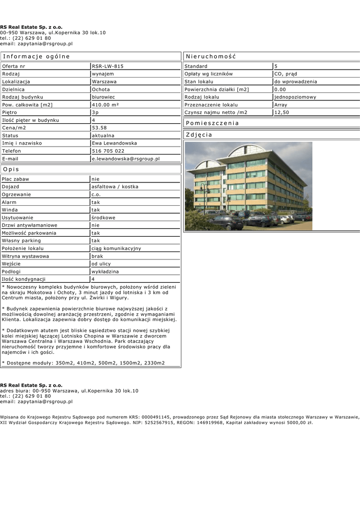 RS Real Estate Sp. z o.o. 00-950 Warszawa, ul.Kopernika 30 lok.10 tel.: (22) 629 01 80 email: [email protected] Informacje ogólne Nieruchomość Oferta nr RSR-LW-815 Standard 5 Rodzaj wynajem Opłaty wg liczników CO, prąd Lokalizacja Warszawa Stan lokalu do wprowadzenia Dzielnica Ochota Powierzchnia działki [m2] 0.00 Rodzaj budynku biurowiec Rodzaj lokalu jednopoziomowy Pow. całkowita [m2] 410.00 m² Przeznaczenie lokalu Array Piętro 3p Czynsz najmu netto /m2 12,50 Ilość pięter w budynku 4 Cena/m2 53.58 Status aktualna Imię i nazwisko Ewa Lewandowska Telefon 516 705 022 E-mail [email protected] Pomieszczenia Zdjęcia Opis Plac zabaw nie Dojazd asfaltowa / kostka Ogrzewanie c.o. Alarm tak Winda tak Usytuowanie środkowe Drzwi antywłamaniowe nie Możliwość parkowania tak Własny parking tak Położenie lokalu ciąg komunikacyjny Witryna wystawowa brak Wejście od ulicy Podłogi wykładzina Ilość kondygnacji 4 * Nowoczesny kompleks budynków biurowych, położony wśród zieleni na skraju Mokotowa i Ochoty, 3 minut jazdy od lotniska i 3 km od Centrum miasta, położony przy ul. Żwirki i Wigury. * Budynek zapewnienia powierzchnie biurowe najwyższej jakości z możliwością dowolnej aranżację przestrzeni, zgodnie z wymaganiami Klienta. Lokalizacja zapewnia dobry dostęp do komunikacji miejskiej. * Dodatkowym atutem jest bliskie sąsiedztwo stacji nowej szybkiej kolei miejskiej łączącej Lotnisko Chopina w Warszawie z dworcem Warszawa Centralna i Warszawa Wschodnia. Park otaczający nieruchomość tworzy przyjemne i komfortowe środowisko pracy dla najemców i ich gości. * Dostępne moduły: 350m2, 410m2, 500m2, 1500m2, 2330m2 RS Real Estate Sp. z o.o. adres biura: 00-950 Warszawa, ul.Kopernika 30 lok.10 tel.: (22) 629 01 80 email: [email protected] Wpisana do Krajowego Rejestru Sądowego pod numerem KRS: 0000491145, prowadzonego przez Sąd Rejonowy dla miasta stołecznego Warszawy w Warszawie, XII Wydział Gospodarczy Krajowego Rejestru Sądowego. NIP: 5252567915, REGON: 146919968, Kapitał zakładowy wynosi 5000,00 zł.
