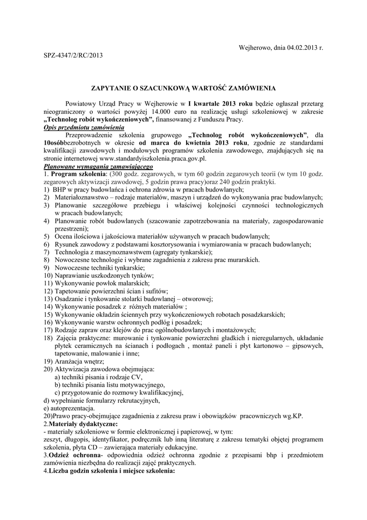 Wejherowo, dnia 04.02.2013 r. SPZ-4347/2/RC/2013 ZAPYTANIE O SZACUNKOWĄ WARTOŚĆ ZAMÓWIENIA Powiatowy Urząd Pracy w Wejherowie w I kwartale 2013 roku będzie ogłaszał przetarg nieograniczony o wartości powyżej 14.000 euro na realizację usługi szkoleniowej w zakresie „Technolog robót wykończeniowych”, finansowanej z Funduszu Pracy. Opis przedmiotu zamówienia Przeprowadzenie szkolenia grupowego „Technolog robót wykończeniowych”, dla 10osóbbezrobotnych w okresie od marca do kwietnia 2013 roku, zgodnie ze standardami kwalifikacji zawodowych i modułowych programów szkolenia zawodowego, znajdujących się na stronie internetowej www.standardyiszkolenia.praca.gov.pl. Planowane wymagania zamawiającego 1. Program szkolenia: (300 godz. zegarowych, w tym 60 godzin zegarowych teorii (w tym 10 godz. zegarowych aktywizacji zawodowej, 5 godzin prawa pracy)oraz 240 godzin praktyki. 1) BHP w pracy budowlańca i ochrona zdrowia w pracach budowlanych; 2) Materiałoznawstwo – rodzaje materiałów, maszyn i urządzeń do wykonywania prac budowlanych; 3) Planowanie szczegółowe przebiegu i właściwej kolejności czynności technologicznych w pracach budowlanych; 4) Planowanie robót budowlanych (szacowanie zapotrzebowania na materiały, zagospodarowanie przestrzeni); 5) Ocena ilościowa i jakościowa materiałów używanych w pracach budowlanych; 6) Rysunek zawodowy z podstawami kosztorysowania i wymiarowania w pracach budowlanych; 7) Technologia z maszynoznawstwem (agregaty tynkarskie); 8) Nowoczesne technologie i wybrane zagadnienia z zakresu prac murarskich. 9) Nowoczesne techniki tynkarskie; 10) Naprawianie uszkodzonych tynków; 11) Wykonywanie powłok malarskich; 12) Tapetowanie powierzchni ścian i sufitów; 13) Osadzanie i tynkowanie stolarki budowlanej – otworowej; 14) Wykonywanie posadzek z różnych materiałów ; 15) Wykonywanie okładzin ściennych przy wykończeniowych robotach posadzkarskich; 16) Wykonywanie warstw ochronnych podłóg i posadzek; 17) Rodzaje zapraw oraz klejów do prac ogólnobudowlanych i montażowych; 18) Zajęcia praktyczne: murowanie i tynkowanie powierzchni gładkich i nieregularnych, układanie płytek ceramicznych na ścianach i podłogach , montaż paneli i płyt kartonowo – gipsowych, tapetowanie, malowanie i inne; 19) Aranżacja wnętrz; 20) Aktywizacja zawodowa obejmująca: a) techniki pisania i rodzaje CV, b) techniki pisania listu motywacyjnego, c) przygotowanie do rozmowy kwalifikacyjnej, d) wypełnianie formularzy rekrutacyjnych, e) autoprezentacja. 20)Prawo pracy-obejmujące zagadnienia z zakresu praw i obowiązków pracowniczych wg.KP. 2.Materiały dydaktyczne: - materiały szkoleniowe w formie elektronicznej i papierowej, w tym: zeszyt, długopis, identyfikator, podręcznik lub inną literaturę z zakresu tematyki objętej programem szkolenia, płyta CD – zawierająca materiały edukacyjne. 3.Odzież ochronna- odpowiednia odzież ochronna zgodnie z przepisami bhp i przedmiotem zamówienia niezbędna do realizacji zajęć praktycznych. 4.Liczba godzin szkolenia i miejsce szkolenia: Ogółem: 300 godzin zegarowych szkolenia; w tym: - 60 godzin zegarowych zajęć teoretycznych( 10 godzin zegarowych zajęć z zakresu aktywizacji zawodowej,5 godzin prawa pracy), - 240 godzin zegarowych zajęć praktycznych. W ramach zajęć praktycznych zostaną przeprowadzone prace budowlane w miejscu użyteczności publicznej na terenie miasta Wejherowa. Zajęcia praktyczne obejmowały będą prace budowlane związane z wykańczaniem wnętrz: Uwaga. Ponadto w kalkulacji należy uwzględnić materiały do wykonania ewentualnych prac dodatkowych niemożliwych do przewidzenia a wynikłych przy realizacji ww. czynności podczas realizacji zajęć praktycznych. Materiał i sprzęt budowlany niezbędny do przeprowadzenia zajęć praktycznych zabezpiecza Wykonawca. Miejsce szkolenie – miasto Wejherowo. 5.Ubezpieczenie uczestników szkolenia Instytucja szkoleniowa zobowiązana jest ubezpieczyć uczestników szkolenia od następstw nieszczęśliwych wypadków, powstałych w związku ze szkoleniem oraz w drodze do miejsca szkolenia i z powrotem. Ubezpieczenie obejmuje okres trwania szkolenia. 6.Inne: • Szkolenie powinno zostać przeprowadzone w sposób gwarantujący nabycie umiejętności związanych z tematyką dotyczącą prac ogólnobudowlanych i wykańczania wnętrz • Szkolenie powinno zostać przeprowadzone przez wykwalifikowaną kadrę dydaktyczną, posiadającą doświadczenie i odpowiednie uprawnienia do prowadzenia szkoleń z tego zakresu. • Szkolenie powinno zostać przeprowadzone w sposób gwarantujący warunki pracy zgodne z przepisami bezpieczeństwa i higieny pracy. • Szkolenie powinno zakończyć się egzaminem wewnętrznym w jednostce szkoleniowej oraz otrzymaniem przez jego uczestników zaświadczenia o ukończeniu kursu. • W kalkulacji kosztów szkolenia należy uwzględnić poczęstunek dla uczestników (kawa, herbata, napoje, ciastka). • Koszty dojazdu na szkolenie będą refundowane osobom bezrobotnym przez Urząd. Składanie ofert Prosimy o złożenie wstępnej oferty szkoleniowej na załączonym druku Formularza ofertowego do dnia 08.02.2013 roku osobiście, za pośrednictwem poczty, faxem (58 677 63 33) lub drogą elektroniczną na adres [email protected] Osoba do kontaktu Renata Czerska – Kierownik Działu Szkoleń i Poradnictwa Zawodowego, tel. 58 677 63 22 Informacja dodatkowa Zapytanie nie zobowiązuje Powiatowego Urzędu Pracy w Wejherowie do podpisania umowy na realizację zamówienia, a wstępne oferty będą wykorzystane do oszacowania wartości zamówienia. Kierownik Działu Szkoleń i Poradnictwa Zawodowego Renata Czerska Załączniki: 1. Formularz ofertowy Formularz ofertowy Nazwa Firmy: REGON: NIP: Adres, nr telefonu, osoba do kontaktu: Nr wpisu do RIS (uaktualniony na 2013r.): Nazwa szkolenia, o przeprowadzenie, którego ubiega się jednostka szkoleniowa: Zakres tematyczny: Profil kandydata na szkoleni