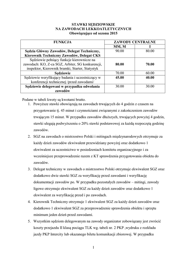 STAWKI SĘDZIOWSKIE NA ZAWODACH LEKKOATLETYCZNYCH Obowiązujące od sezonu 2015 FUNKCJA Sędzia Główny Zawodów, Delegat Techniczny, Kierownik Techniczny Zawodów, Delegat CKS Sędziowie pełniący funkcje kierownicze na zawodach: KO, Z-ca SGZ, Arbiter, SG konkurencji, inspektor, Kierownik bramki, Starter, Statystyk Sędziowie Sędziowie weryfikujący badania i uczestniczący w konferencji technicznej /przed zawodami/ Sędziowie delegowani w przypadku odwołania zawodów ZAWODY CENTRALNE MM, M I 90.00 80.00 80.00 70.00 70.00 45.00 60.00 40.00 30.00 30.00 Podane w tabeli kwoty są kwotami brutto. 1. Powyższe stawki obowiązują na zawodach trwających do 4 godzin z czasem na przygotowanie tj. 45 minut i czynnościami związanymi z zakończeniem zawodów trwającym 15 minut. W przypadku zawodów dłuższych, trwających powyżej 4 godzin, stawki ulegają podwyższeniu o 20% stawki podstawowej za każdą rozpoczętą godzinę zawodów. 2. SGZ na zawodach o mistrzostwo Polski i mitingach międzynarodowych otrzymuje za każdy dzień zawodów ekwiwalent przewidziany powyżej oraz dodatkowo 1 ekwiwalent za uczestnictwo w posiedzeniach komitetu organizacyjnego i za wcześniejsze przeprowadzenie razem z KT sprawdzenia przygotowania obiektu do zawodów. 3. Delegat techniczny w zawodach o mistrzostwo Polski otrzymuje ekwiwalent SGZ oraz dodatkowo dwie stawki SGZ za weryfikację przed zawodami i weryfikację dokumentacji zawodów po. W przypadku pozostałych zawodów – mitingi, zawody ligowe otrzymuje ekwiwalent SGZ za każdy dzień zawodów oraz dodatkowo 1 ekwiwalent za weryfikację przed i po zawodach. 4. Kierownik Techniczny otrzymuje 1 ekwiwalent SGZ za każdy dzień zawodów oraz dodatkowo 1 ekwiwalent SGZ za przeprowadzenie sprawdzenia obiektu i sprzętu minimum jeden dzień przed zawodami. 5. Wszystkim sędziom delegowanym na zawody organizator zobowiązany jest zwrócić koszty przejazdu II klasą pociągu TLK wg. tabeli nr. 2 PKP ,wydruku z rozkładu jazdy PKP Intercity lub okazanego biletu komunikacji zbiorowej. W przypadku 1 zakwaterowania zmuszającego sędziego do dojazdów na stadion organizator wypłaca ryczałty za dojazdy lub zabezpiecza dowóz na zawody. 6. W przypadku braku połączenia umożliwiającego terminowe przybycie na zawody organizator zapewnia nocleg dla delegowanych sędziów. W przypadku niemożności wyjazdu po zawodach organizator również zobowiązany jest do zapewnienia noclegu. 7. Przez zawody centralne rozumie się zawody umieszczone w kalendarzu PZLA z klasą MM , M i I 8. Stawki zawodów okręgowych i szkolnych ustalają wojewódzkie związki LA na wniosek WKS biorąc pod uwagę ustalenia PZLA oraz Ministerstwa Sportu i Turystyki. Na innych zawodach ustala się stawki umowne a powyższa tabela może być pomocna przy ich ustalaniu. 2