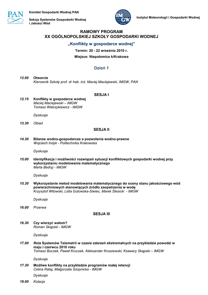Komitet Gospodarki Wodnej PAN Instytut Meteorologii i Gospodarki Wodnej Sekcja Systemów Gospodarki Wodnej i Jakości Wód RAMOWY PROGRAM XX OGÓLNOPOLSKIEJ SZKOŁY GOSPODARKI WODNEJ „Konflikty w gospodarce wodnej” Termin: 20 - 22 września 2010 r. Miejsce: Niepołomice k/Krakowa Dzień 1 12.00 Otwarcie Kierownik Szkoły prof. dr hab. inŜ. Maciej Maciejewski, IMGW, PAN 12.15 Konflikty w gospodarce wodnej Maciej Maciejewski – IMGW Tomasz Walczykiewicz - IMGW SESJA I Dyskusja 13.30 Obiad SESJA II 14.30 Bilanse wodno-gospodarcze a pozwolenia wodno-prawne Wojciech Indyk - Politechnika Krakowska Dyskusja 15.00 Identyfikacja i moŜliwości rozwiązań sytuacji konfliktowych gospodarki wodnej przy wykorzystaniu modelowania matematycznego Marta Bedryj - IMGW Dyskusja 15.30 Wykorzystanie metod modelowania matematycznego do oceny stanu jakościowego wód powierzchniowych stanowiących źródło zaopatrzenia w wodę Krzysztof Witowski, Lidia Gutowska-Siwiec, Marek Ślesicki - IMGW Dyskusja 16.00 Przerwa SESJA III 16.30 Czy wierzyć wałom? Roman Skąpski - IMGW Dyskusja 17.00 Rola Systemów Telemetrii w czasie zdarzeń ekstremalnych na przykładzie powodzi w maju i czerwcu 2010 roku Tomasz Buczek, Paweł Kruczek, Aleksander Kruszewski, Ksawery Skąpski – IMGW Dyskusja 17.30 MoŜliwe konflikty na przykładzie programów małej retencji Celina Rataj, Małgorzata Szopnicka - IMGW Dyskusja 19.00 Kolacja Dzień 2 8.00 Śniadanie Sesja IV 9.00 Konflikty społeczne w procesie implementacji RDW Roman Konieczny, Paweł Madej, Małgorzata Siudak - IMGW Dyskusja 9.40 Konflikty związane ze zintegrowanym zarządzaniem gospodarką wodną w Polsce Ilona Biedroń, Jadwiga Łaciak, Magdalena Kwiecień, Tomasz Walczykiewicz - IMGW Dyskusja 10.10 Działania kompensujące straty ekologiczne wywołane przez wodno-gospodarcze uŜytkowanie rzek i potoków górskich Krzysztof Kulesza - IMGW Dyskusja 10.40 Przerwa Sesja V 11.00 Polityka morska na przykładzie Morza Bałtyckiego Mieczysław S. Ostojski - IMGW Dyskusja 11.30 Funkcja stopni wodnych Przewóz i Niepołomice Wojciech Bosak - RZGW Kraków 12.00 Droga Wodna Górnej Wisły - szansa czy marnotrawstwo Zbigniew Siedlarz - Związek Polskich Armatorów Śródlądowych 12.30 Stopnie wodne poniŜej Krakowa warunkiem ustabilizowania stanu koryta rzeki Wisły Zbigniew Siedlarz - Koordynator ds. Promocji i Rewitalizacji Wiślanego Szlaku śeglownego Stowarzyszenie Miłośników Ziemi Niepołomickiej Dyskusja 13.30 Obiad 14.30 Wycieczka tematyczna – stopień wodny Przewóz, planowane miejsce lokalizacji stopnia wodnego Niepołomice 19.00 Kolacja Dzień 3 9.00 Śniadanie 10.00 Konflikty związane z finansowaniem gospodarki wodnej pod kątem zwrotu kosztów za usługi wodne Ilona Biedroń, Jadwiga Łaciak, Magdalena Kwiecień, Tomasz Walczykiewicz, Joanna Wróbel – IMGW 10.30 Relacje między obszarami chronionymi a rozwojem powiatów Rafał Stepnowski - IMGW Dyskusja 12.00 Podsumowanie i zakończenie Szkoły Maciej Maciejewski, IMGW, PAN Kierownik Szkoły 12.30 Obiad W przerwach obrad przewidziano bufet kawowy