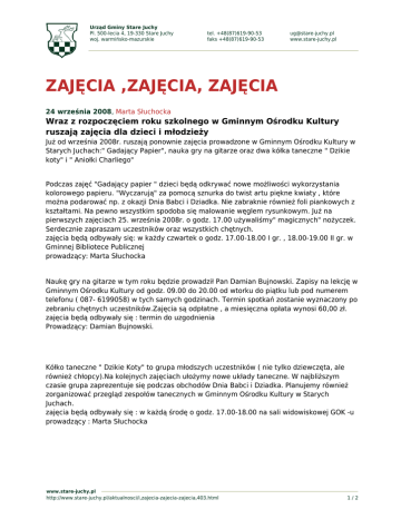 Urząd Gminy Stare Juchy Pl. 500-lecia 4, 19-330 Stare Juchy woj. warmińsko-mazurskie tel. +48(87)619-90-53 faks +48(87)619-90-53 [email protected] www.stare-juchy.pl ZAJĘCIA ,ZAJĘCIA, ZAJĘCIA 24 września 2008, Marta Słuchocka Wraz z rozpoczęciem roku szkolnego w Gminnym Ośrodku Kultury ruszają zajęcia dla dzieci i młodzieży Już od września 2008r. ruszają ponownie zajęcia prowadzone w Gminnym Ośrodku Kultury w Starych Juchach:" Gadający Papier", nauka gry na gitarze oraz dwa kółka taneczne " Dzikie koty" i " Aniołki Charliego" Podczas zajęć "Gadający papier " dzieci będą odkrywać nowe możliwości wykorzystania kolorowego papieru. "Wyczarują" za pomocą sznurka do twist artu piękne kwiaty , które można podarować np. z okazji Dnia Babci i Dziadka. Nie zabraknie również foli piankowych z kształtami. Na pewno wszystkim spodoba się malowanie węglem rysunkowym. Już na pierwszych zajęciach 25. września 2008r. o godz. 17.00 używaliśmy" magicznych" nożyczek. Serdecznie zapraszam uczestników oraz wszystkich chętnych. zajęcia będą odbywały się: w każdy czwartek o godz. 17.00-18.00 I gr. , 18.00-19.00 II gr. w Gminnej Bibliotece Publicznej prowadzący: Marta Słuchocka Naukę gry na gitarze w tym roku będzie prowadził Pan Damian Bujnowski. Zapisy na lekcję w Gminnym Ośrodku Kultury od godz. 09.00 do 20.00 od wtorku do piątku lub pod numerem telefonu ( 087- 6199058) w tych samych godzinach. Termin spotkań zostanie wyznaczony po zebraniu chętnych uczestników.Zajęcia są odpłatne , a miesięczna opłata wynosi 60,00 zł. zajęcia będą odbywały się : termin do uzgodnienia Prowadzący: Damian Bujnowski. Kółko taneczne " Dzikie Koty" to grupa młodszych uczestników ( nie tylko dziewczęta, ale również chłopcy).Na kolejnych zajęciach ułożymy nowe układy taneczne. W najbliższym czasie grupa zaprezentuje się podczas obchodów Dnia Babci i Dziadka. Planujemy również zorganizować przegląd zespołów tanecznych w Gminnym Ośrodku Kultury w Starych Juchach. zajęcia będą odbywały się : w każdą środę o godz. 17.00-18.00 na sali widowiskowej GOK -u prowadzący : Marta Słuchocka www.stare-juchy.pl http://www.stare-juchy.pl/aktualnosci/i,zajecia-zajecia-zajecia,403.html 1/2 Urząd Gminy Stare Juchy Pl. 500-lecia 4, 19-330 Stare Juchy woj. warmińsko-mazurskie tel. +48(87)619-90-53 faks +48(87)619-90-53 [email protected] www.stare-juchy.pl Kółko taneczne " Aniołki Charliego" to grupka młodzieży ( również chłopcy i dziewczęta),która występowała m. in.z okazji Dnia Matki jak również na festynach rekreacyjnych i jako cheerleaderki podczas III Turnieju o Puchar Wójt Gminy Stare Juchy. W czasie kolejnych spotkań przygotujemy nowe układy tańca współczesnego, które będziemy prezentować przy okazji okolicznośći. zajęcia będą odbywały się : w każdą środę o godz. 18.00-19.00 na sali widowiskowej GOK -u prowadzący : Marta Słuchocka Oba kółka taneczne mają już pierwsze stroje w postaci spódnic oraz dodatków. Materiały te pozyskaliśmy od sponsorów za co jeszcze raz serdecznie dziękujemy. Uszyć pomogła nam jedna z mam, której również bardzo dziękujemy. W NAJBLIŻSZYM CZASIE RUSZĄ KOLEJNE ZAJĘCIA O CZYM RÓWNIEŻ POINFORMUJEMY SERDECZNIE ZAPRASZAMY www.stare-juchy.pl http://www.stare-juchy.pl/aktualnosci/i,zajecia-zajecia-zajecia,403.html 2/2