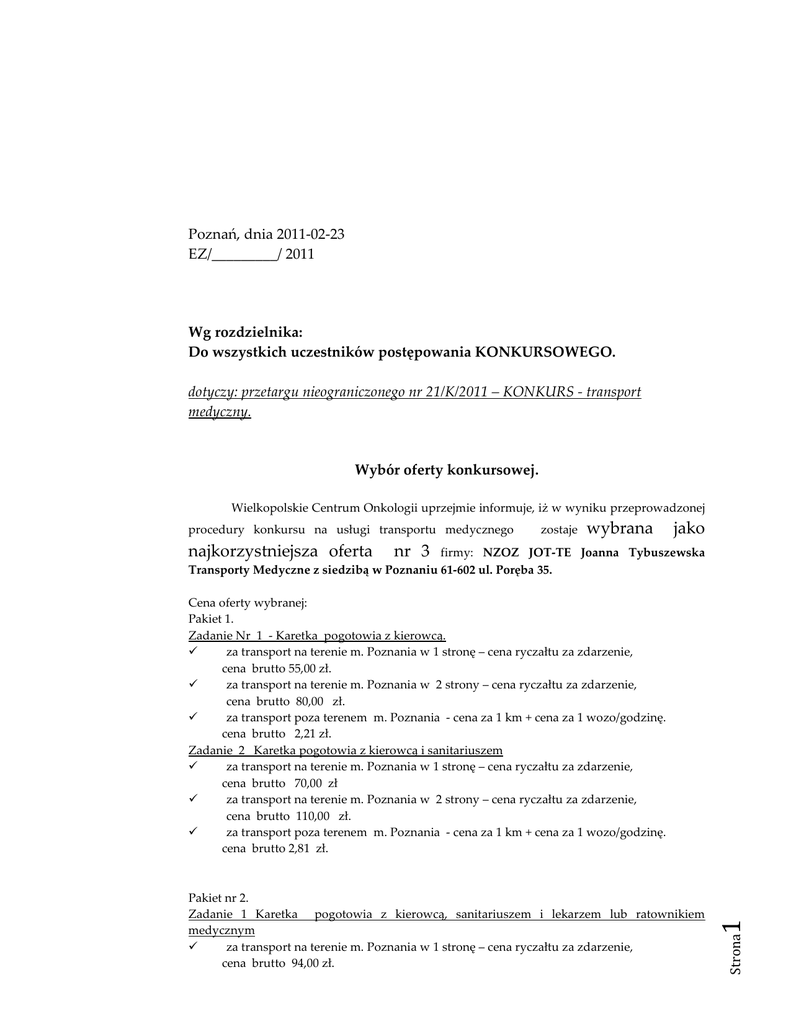 Poznań, dnia 2011-02-23 EZ/_________/ 2011 Wg rozdzielnika: Do wszystkich uczestników postępowania KONKURSOWEGO. dotyczy: przetargu nieograniczonego nr 21/K/2011 – KONKURS - transport medyczny. Wybór oferty konkursowej. Wielkopolskie Centrum Onkologii uprzejmie informuje, iż w wyniku przeprowadzonej procedury konkursu na usługi transportu medycznego najkorzystniejsza oferta zostaje wybrana jako nr 3 firmy: NZOZ JOT-TE Joanna Tybuszewska Transporty Medyczne z siedzibą w Poznaniu 61-602 ul. Poręba 35. Strona Pakiet nr 2. Zadanie 1 Karetka pogotowia z kierowcą, sanitariuszem i lekarzem lub ratownikiem medycznym za transport na terenie m. Poznania w 1 stronę – cena ryczałtu za zdarzenie, cena brutto 94,00 zł. 1 Cena oferty wybranej: Pakiet 1. Zadanie Nr 1 - Karetka pogotowia z kierowcą. za transport na terenie m. Poznania w 1 stronę – cena ryczałtu za zdarzenie, cena brutto 55,00 zł. za transport na terenie m. Poznania w 2 strony – cena ryczałtu za zdarzenie, cena brutto 80,00 zł. za transport poza terenem m. Poznania - cena za 1 km + cena za 1 wozo/godzinę. cena brutto 2,21 zł. Zadanie 2 Karetka pogotowia z kierowcą i sanitariuszem za transport na terenie m. Poznania w 1 stronę – cena ryczałtu za zdarzenie, cena brutto 70,00 zł za transport na terenie m. Poznania w 2 strony – cena ryczałtu za zdarzenie, cena brutto 110,00 zł. za transport poza terenem m. Poznania - cena za 1 km + cena za 1 wozo/godzinę. cena brutto 2,81 zł. za transport na terenie m. Poznania w 2 strony – cena ryczałtu za zdarzenie, cena brutto 110,00 zł. za transport poza terenem m. Poznania - cena za 1 km + cena za 1 wozo/godzinę. cena brutto 4,81 zł. Zadanie Nr 2 Karetka reanimacyjna. za transport na terenie m. Poznania w 1 stronę – cena ryczałtu za zdarzenie, cena brutto 180,00 zł. za transport na terenie m. Poznania w 2 strony – cena ryczałtu za zdarzenie, cena brutto 280,00 zł. za transport poza terenem m. Poznania - cena za 1 km + cena za 1 wozo/godzinę. cena brutto 8,81 zł. Termin realizacji – umowa na 4 lata. Termin płatności 30 dni. --------------------------------------------------------------------------------------------------------- Pozostałe oferty uczestniczące w konkursie: Oferta 1 - Rejonowa Stacja Pogotowia Ratunkowego SPZOZ ul. Rycerska 10 60-346 Poznań Cena oferty: Pakiet 1. Zadanie Nr 1 - Karetka pogotowia z kierowcą. za transport na terenie m. Poznania w 1 stronę – cena ryczałtu za zdarzenie, cena brutto 50,00 zł. za transport na terenie m. Poznania w 2 strony – cena ryczałtu za zdarzenie, cena brutto 65,00 zł. za transport poza terenem m. Poznania - cena za 1 km + cena za 1 wozo/godzinę. cena brutto 31,80 zł. Zadanie 2 Karetka pogotowia z kierowcą i sanitariuszem za transport na terenie m. Poznania w 1 stronę – cena ryczałtu za zdarzenie, cena brutto 50,00 zł za transport na terenie m. Poznania w 2 strony – cena ryczałtu za zdarzenie, cena brutto 65,00 zł. za transport poza terenem m. Poznania - cena za 1 km + cena za 1 wozo/godzinę. cena brutto 31,80 zł. Strona 2 Pakiet nr 2. – oferent nie przystępuje. Termin realizacji – umowa na 4 lata. Termin płatności 30 dni. Oferta 2 – Przedsiębiorstwo Handlowe Sasman - Adam Sasek ul. Długa 20, 62-031 Luboń Pakiet 1. oferent nie przystępuje. Pakiet nr 2. Zadanie 1 Karetka pogotowia z kierowcą, sanitariuszem i lekarzem lub ratownikiem medycznym za transport na terenie m. Poznania w 1 stronę – cena ryczałtu za zdarzenie, cena brutto 200,00 zł. za transport na terenie m. Poznania w 2 strony – cena ryczałtu za zdarzenie, cena brutto 400,00 zł. za transport poza terenem m. Poznania - cena za 1 km + cena za 1 wozo/godzinę. cena brutto 102,00 zł. Zadanie Nr 2 Karetka reanimacyjna. za transport na terenie m. Poznania w 1 stronę – cena ryczałtu za zdarzenie, cena brutto 300,00 zł. za transport na terenie m. Poznania w 2 strony – cena ryczałtu za zdarzenie, cena brutto 600,00 zł. za transport poza terenem m. Poznania - cena za 1 km + cena za 1 wozo/godzinę. cena brutto 302,00 zł. Termin realizacji – umowa na 4 lata. Termin płatności 30 dni Strona Pakiet nr 2. Zadanie 1 Karetka pogotowia z kierowcą, sanitariuszem i lekarzem lub ratownikiem medycznym za transport na terenie m. Poznania w 1 stronę – cena ryczałtu za zdarzenie, cena brutto 144,00zł. za transport na terenie m. Poznania w 2 strony – cena ryczałtu za zdarzenie, 3 Oferta 4 – Kolumna Transportu Sanitarnego TRIOMED sp z o.o. ul. Rapackiego 14 20-150 Lublin Pakiet 1. Zadanie Nr 1 - Karetka pogotowia z kierowcą. za transport na terenie m. Poznania w 1 stronę – cena ryczałtu za zdarzenie, cena brutto 30,00 zł. za transport na terenie m. Poznania w 2 strony – cena ryczałtu za zdarzenie, cena brutto 50,00zł. za transport poza terenem m. Poznania - cena za 1 km + cena za 1 wozo/godzinę. cena brutto 31,20 zł. Zadanie 2 Karetka pogotowia z kierowcą i sanitariuszem za transport na terenie m. Poznania w 1 stronę – cena ryczałtu za zdarzenie, cena brutto 40,00 zł za transport na terenie m. Poznania w 2 strony – cena ryczałtu za zdarzenie, cena brutto 75,00 zł. za transport poza terenem m. Poznania - cena za 1 km + cena za 1 wozo/godzinę. cena brutto 31,20 zł. cena brutto 259,00 zł. za transport poza terenem m. Poznania - cena za 1 km + cena za 1 wozo/godzinę. cena brutto 130,60 zł. Zadanie Nr 2 Karetka reanimacyjna. za transport na terenie m. Poznania w 1 stronę – cena ryczałtu za zdarzenie, cena brutto zł. za transport na terenie m. Poznania w 2 strony – cena ryczałtu za zdarzenie, cena brutto zł. za transport poza terenem m. Poznania - cena za 1 km + cena za 1 wozo/godzinę. cena brutto zł. Termin realizacji – umowa na 4 lata. Termin płatności 30 dni Dziękujemy za udział w postępowaniu konkursowym. Wybranego Wykonawcę prosimy o przygotowanie umowy wg wzoru zawartego w warunkach konkursu. Wyznacza się datę zawarcia umowy w dniu 28-02-2011 r.